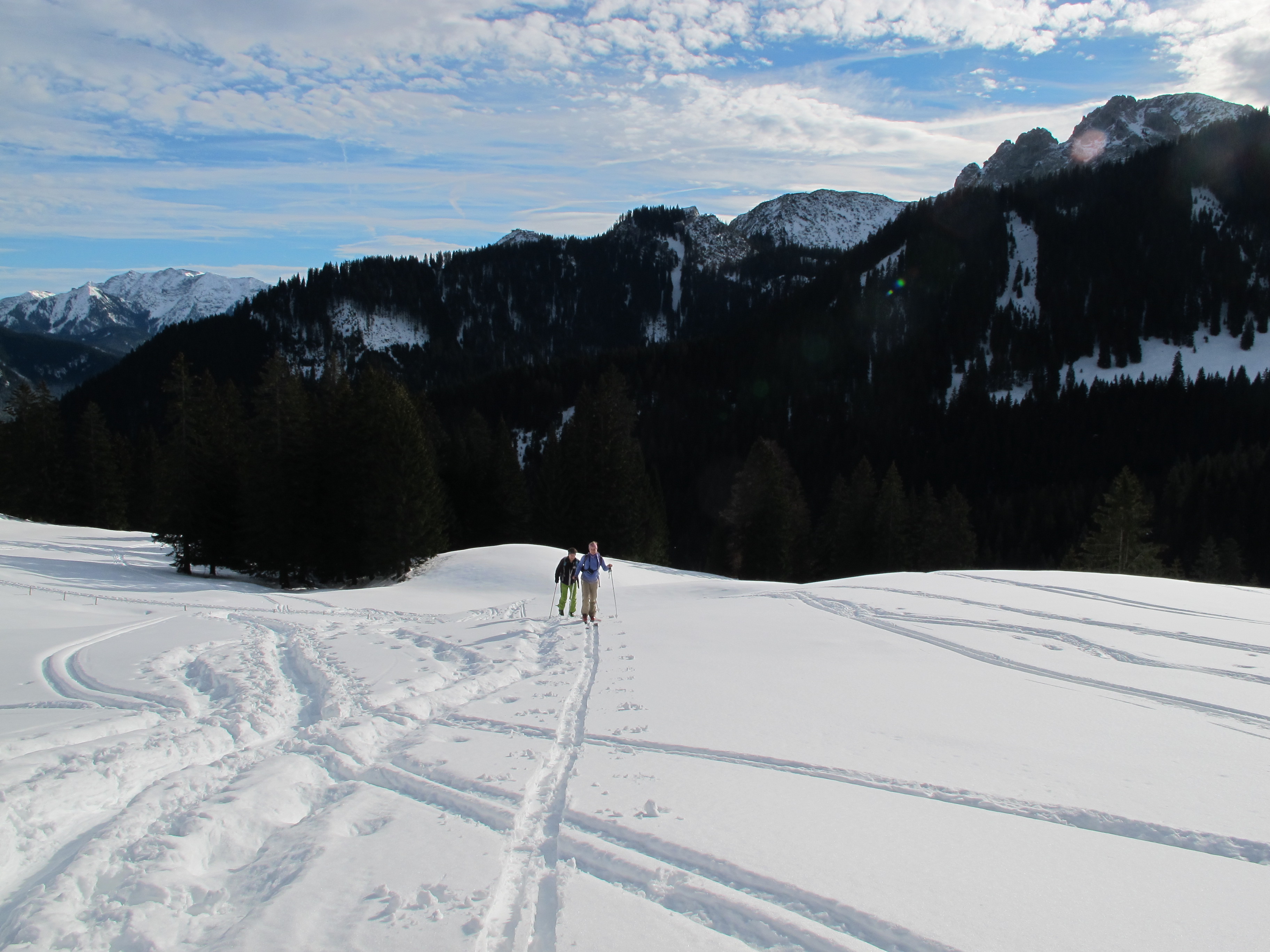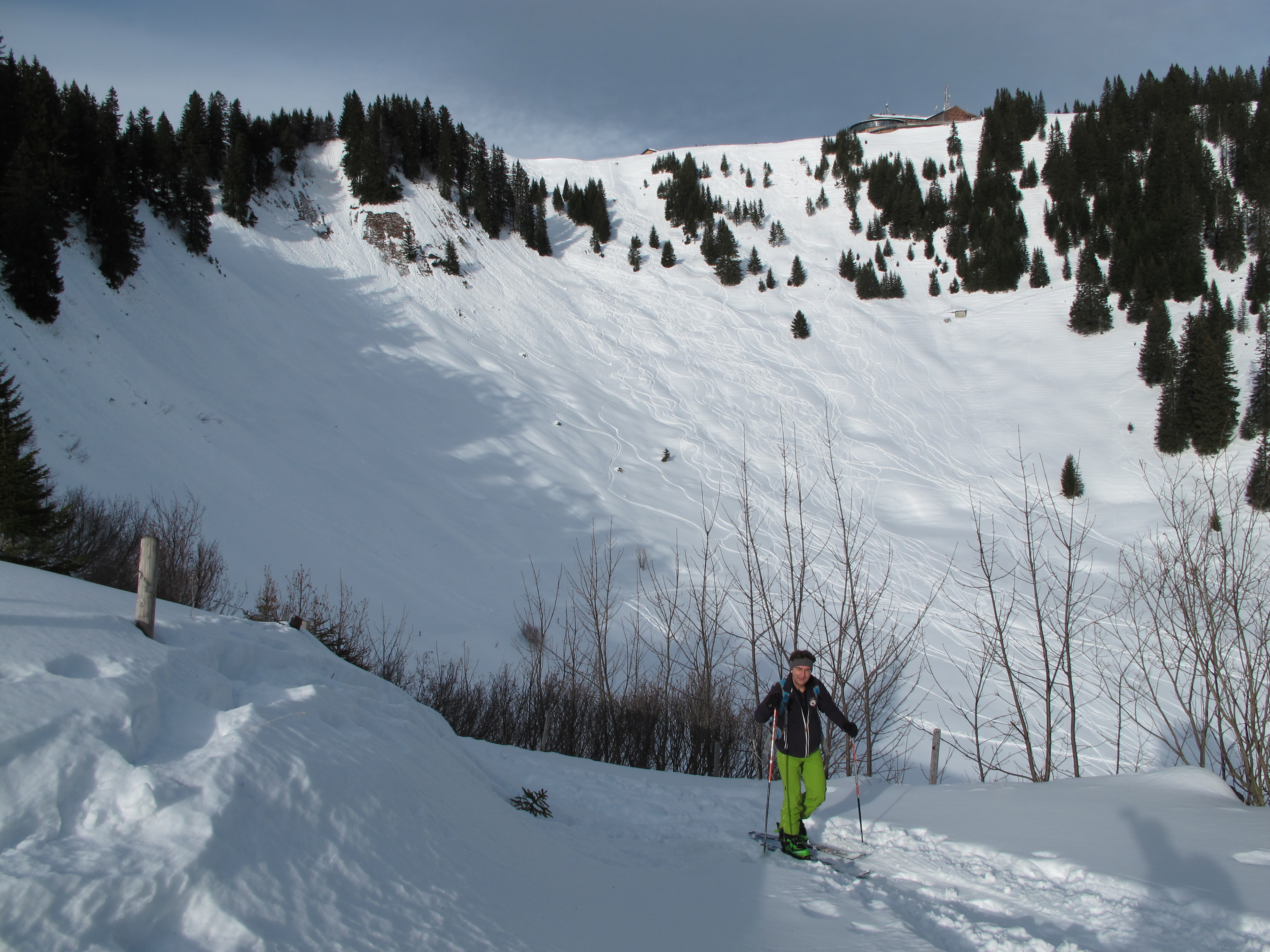 Tourenverhältnisse: Zunächst noch gut. Am Ausgangspunkt hatte es noch -4 Grad, doch schon nach wenigen Höhenmetern wurde es so warm, dass es im Wald intensiv von den Bäumen regnete. Beim Aufstieg war der Schnee dennoch noch einigermaßen, bei der Abfahrt um 13 Uhr war der Schnee aber bereits sehr sehr schwer. Das Wetter hat während unserer Rast an der Kapelle rapide zugezogen und es war stark windig. Zurück am Ausgangspunkt Hufnagelstube dann die ersten Regentropfen.