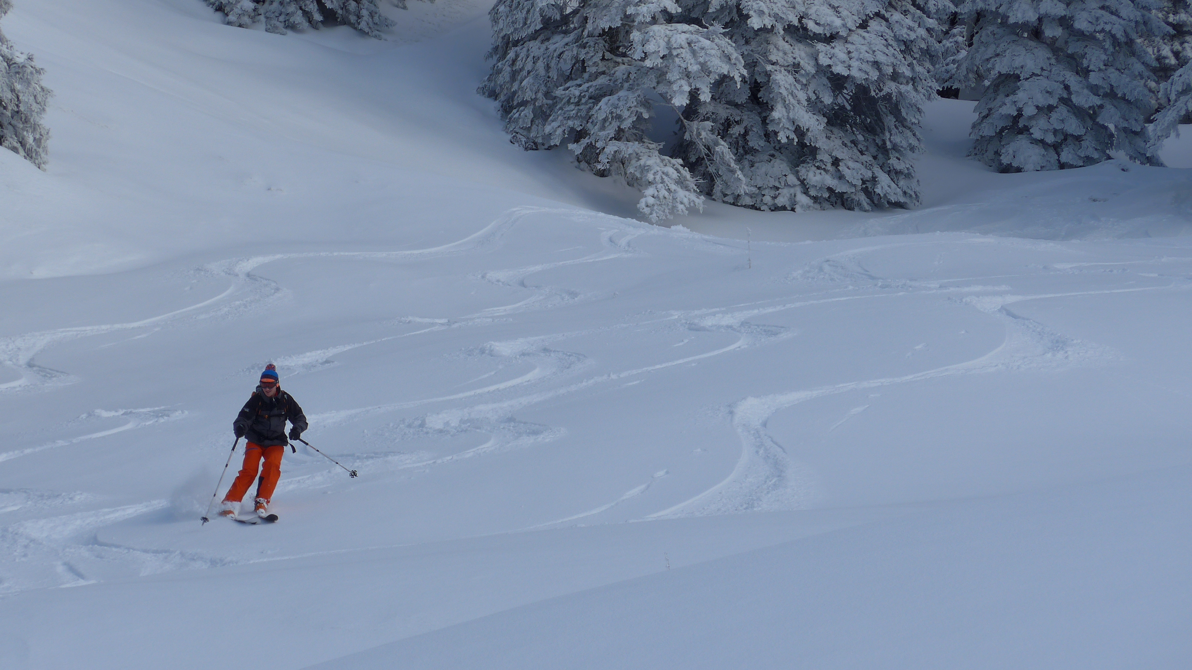 In der Abfahrt bis zur obligtorischen Bachquerung (ca. 1150 Hm) feine Abfahrt auf dem Neuschnee mit kompaktem Schneeregenfundament. Juhu!