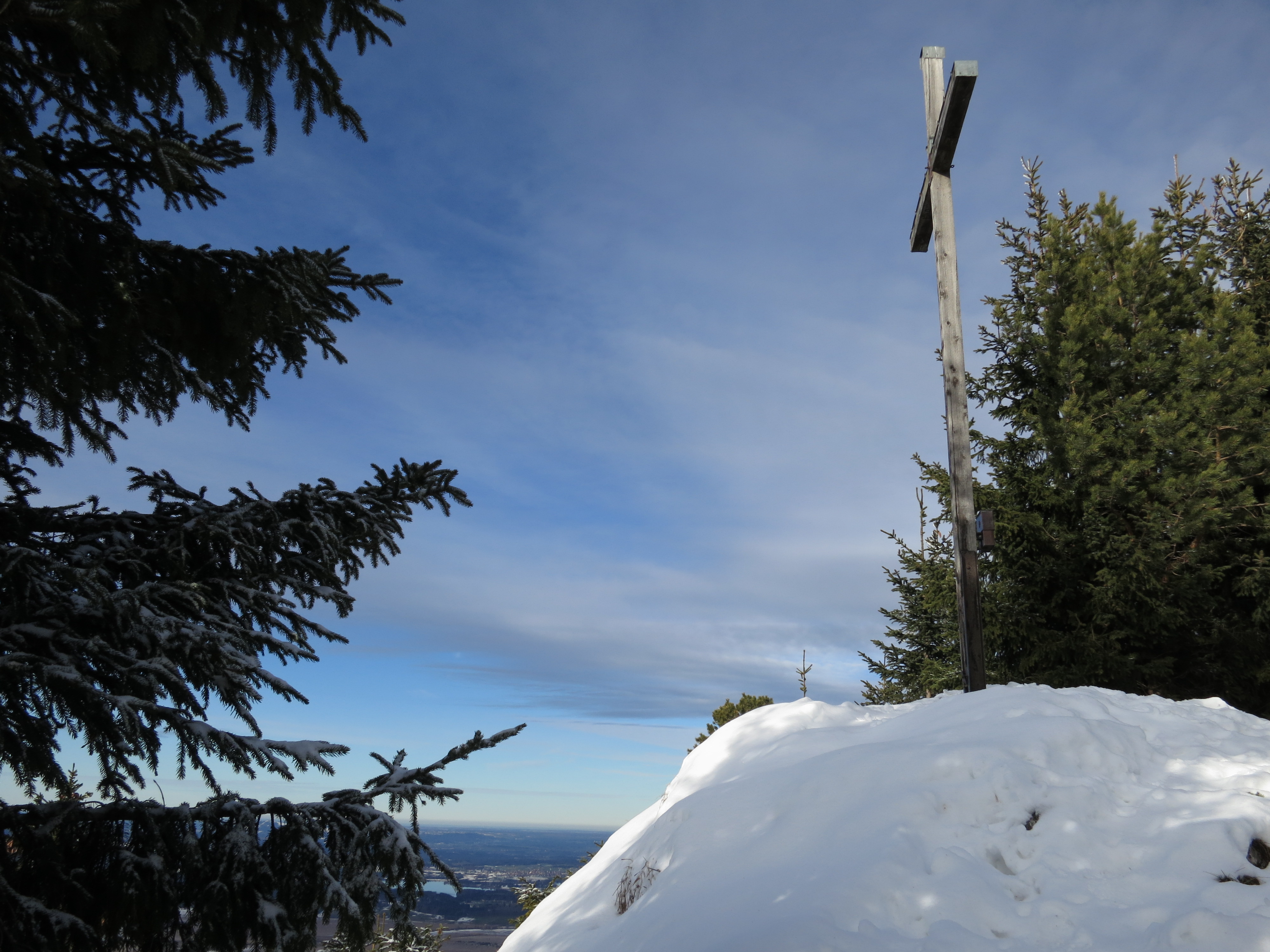 Tourenverhältnisse: perfekte Winterwanderung. Anfangs teils gefrorener Untergrund mit ganz dünner Neuschneeauflage, im weiteren Verlauf dann etwas mehr Schnee mit guter, eingetretener Spur (nicht eisig). Die Sonne hat sich auch hier selbst am Nachmittag noch nicht richtig gezeigt, sondern ist über den Ammergauern ausgebremst worden. Aber bis in den Gipfelbereich hat's getaut.