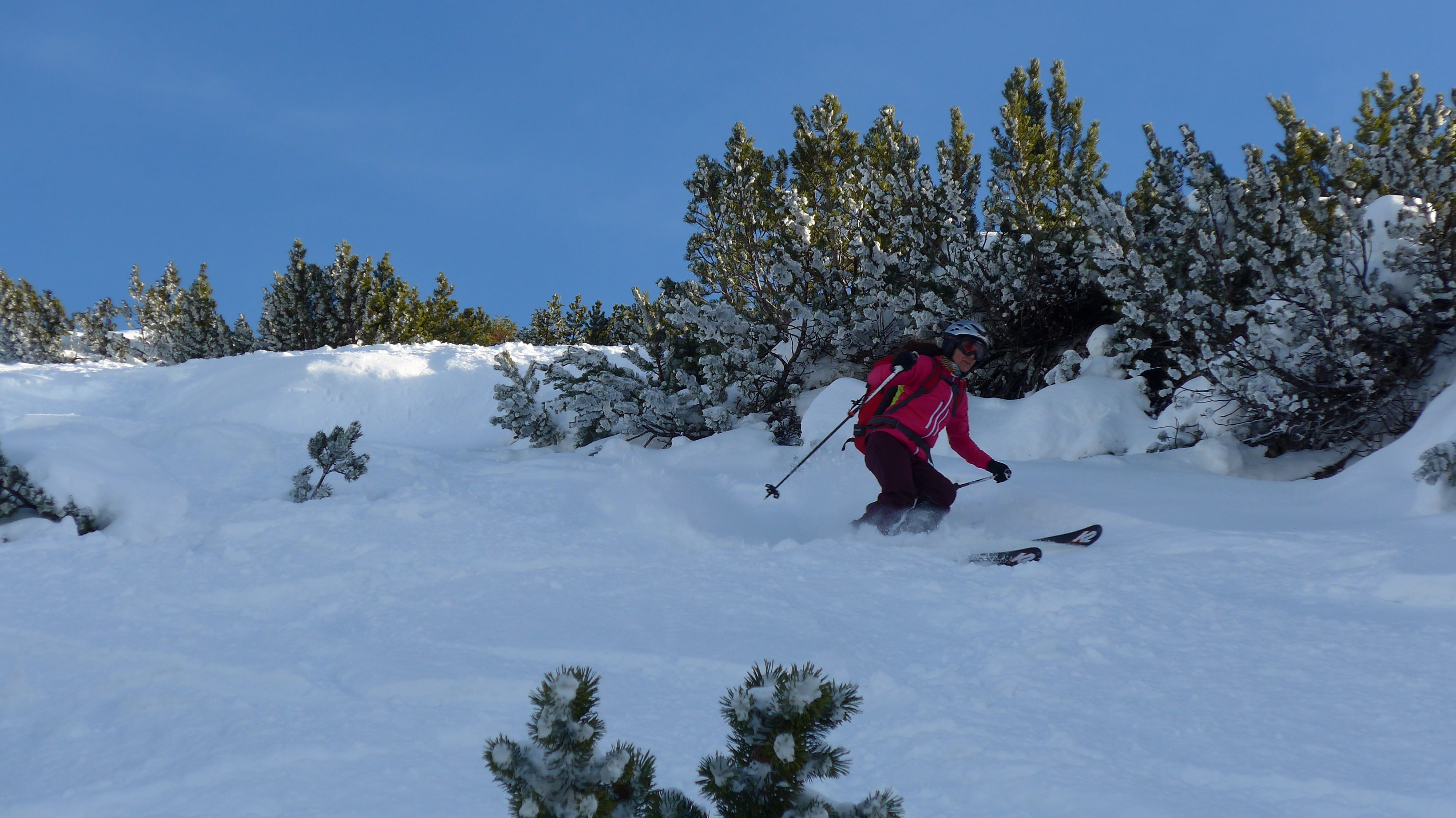 Die Abfahrt im Gipfelbereich bietet mit dem Harschdeckel und versteckten Steinen (etwas verblasen) kleine Überraschungen. Über den Westhang im feinsten Pulver abgefahren, allerdings waren die Latschen noch nicht so gut eingeschneit, damit brauchte es manchmal abrupte Manöver. Nur ein Steinkontakt auf der Forststraße.