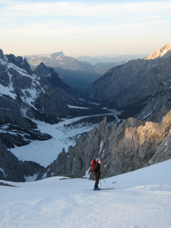 Sonstiges: am Fr., 24.4., von Hinterbrand aufs Stahlhaus, 1726 m. Am Samstag Aufbruch um 4:25 auf den Schneibstein, 2274 m. Abfahrt durch die Windscharte, 2103 m und Aufstieg auf den Windschartenkopf, 2211 m. Am Kahlersberg vorbei am Rand des Hagengebirges entlang auf den Jägerbrunntrog, 2226 m. Durch den Eisgra Abfahrt bis auf 1550 m. Aufstieg an der blauen Lacke vorbei durch die Lange Gasse auf den Funtenseetauern, 2578 m, 12:50 Uhr. Abfahrt durch das Lederer Kar zum Funtensee, 1600 m, und zum Kärlingerhaus. Aufstieg zur Hundstodscharte, 2202 m. Abfahrt zur Hochwiesalm, 1850 m, und Aufstieg auf die Kematenschneid, 2200 m, 19:00 Uhr. Abfahrt durch den Loferer Seilergraben bis auf rund 1180 m und Fußmarsch bis zur Wimbachbrücke, 625 m, 21:30 Uhr.