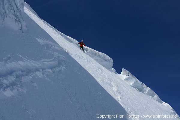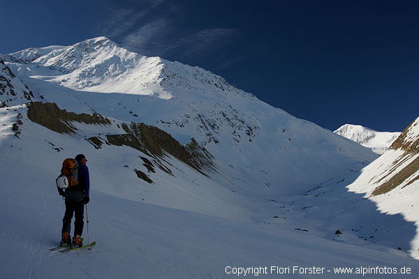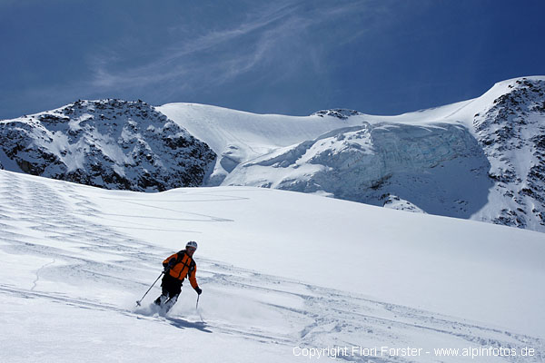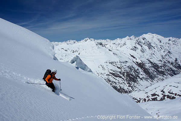 Am Sa. 25.4. von Vent ins Niedertal bis zur Vereinigung Schalfbach-Marzellbach. Weiter zum Mutmalferner bis auf 3250m. Gut 100m zu Fuß durch die Seracs, aufgrund Neuschnee und Lawinengefahr nicht durch die direkte Gipfelflanke, sondern mit Ski über die Westschulter zum Gipfel. 1700Hm, 6 Std., ab 2700m anstrengende Spurarbeit, 20-40cm Neuschnee. Während sich die Massen an Similaun und Schwärze tummelten, waren wir vier alleine und genossen die 1200Hm Traumabfahrt über die Nordflanke und den Mutmalferner in bestem Pulver, unten in bestem Firn, bis zum Marzellbach. Mit drei kurzen Tragestellen recht flott durchs Niedertal bis zum Auto.
