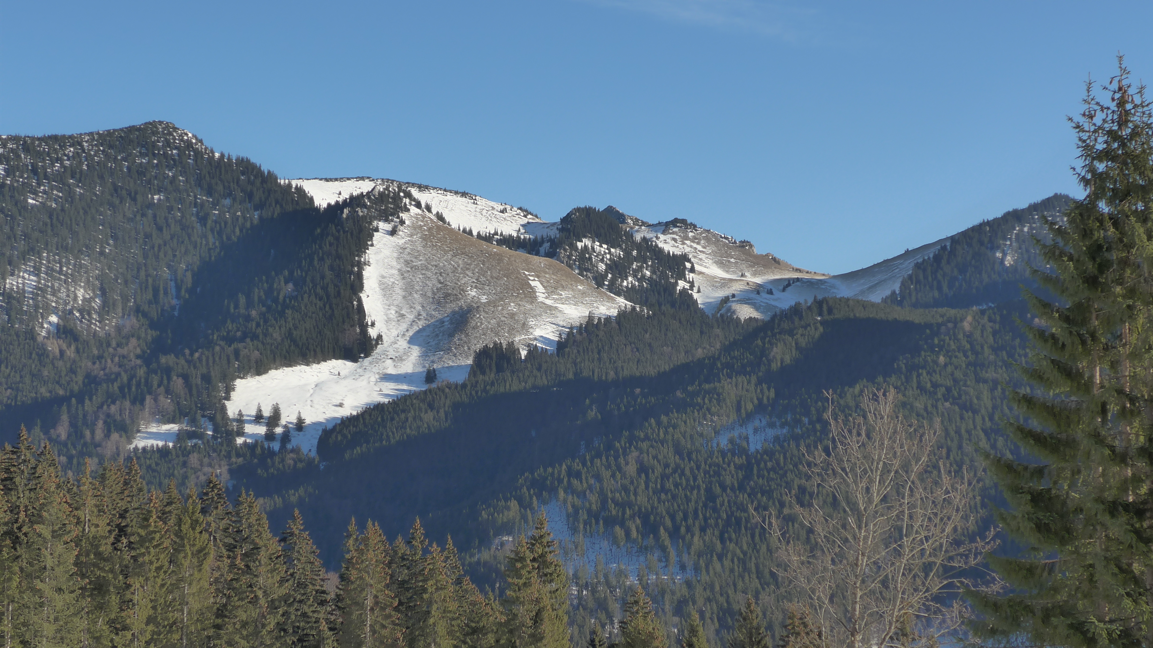 Bild 1: Blick im Aufstieg zum Wilden Fräulein ohne Schneemantel, auch der Taubenstein zeigt sich wenig "bedeckt".