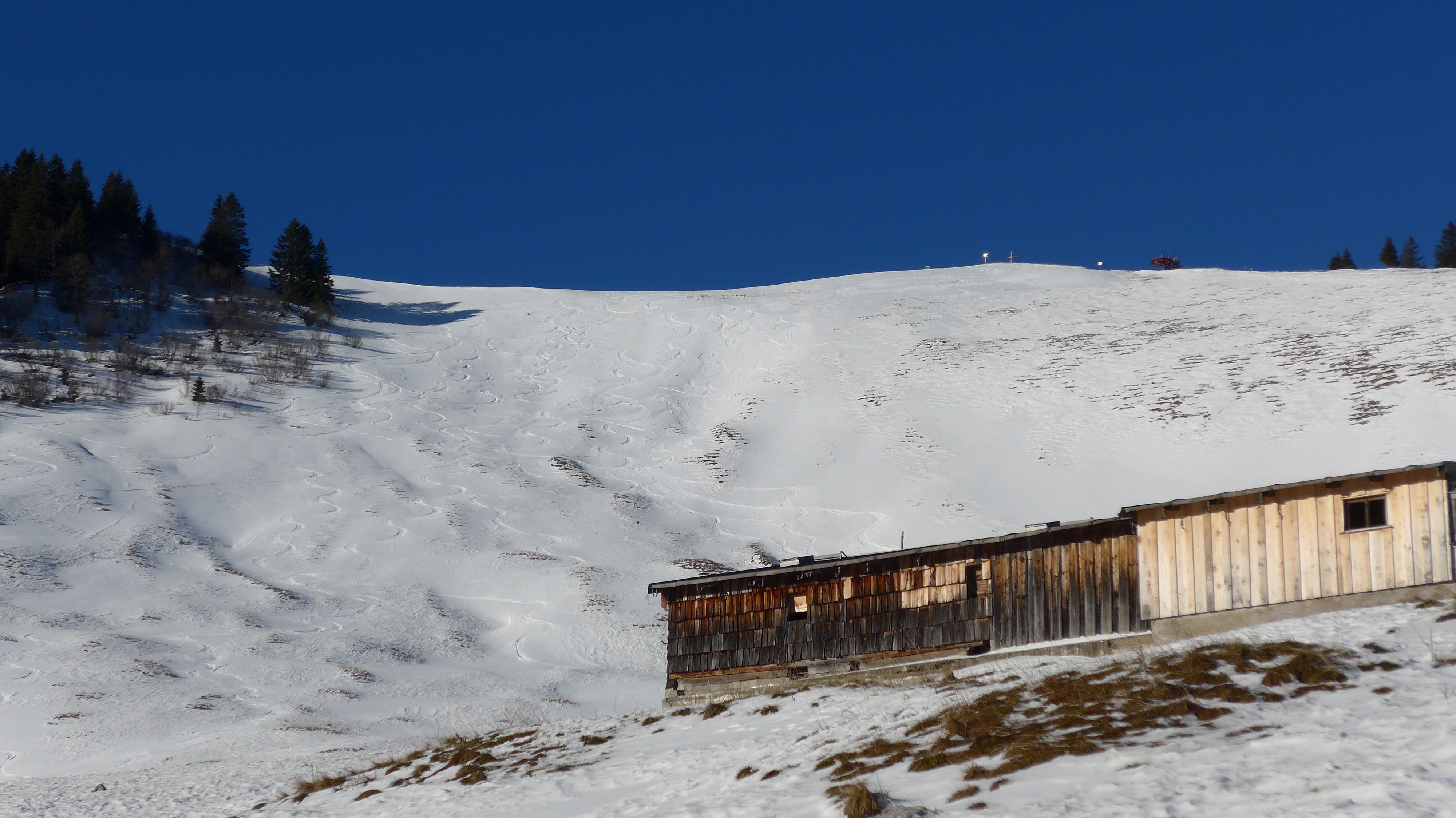 Der wunderbare Tag mit der milden Sonne hat zu einer ausgiebigen Rast nach dem kurzen Aufstieg verleitet. Eigentlich wollte ich den Hang zur Grünseehütte runterfahren und nochmal hoch und über die Piste abfahren. Ich hab mich auf´m Gipfel ordentlich verratscht (mit 3 sehr netten Rentnern), die heute deutlich in der Überzahl waren. Somit bin ich dann nur noch die Piste abgefahren. Oben sehr eisig. Ab der Mitte schön griffig.