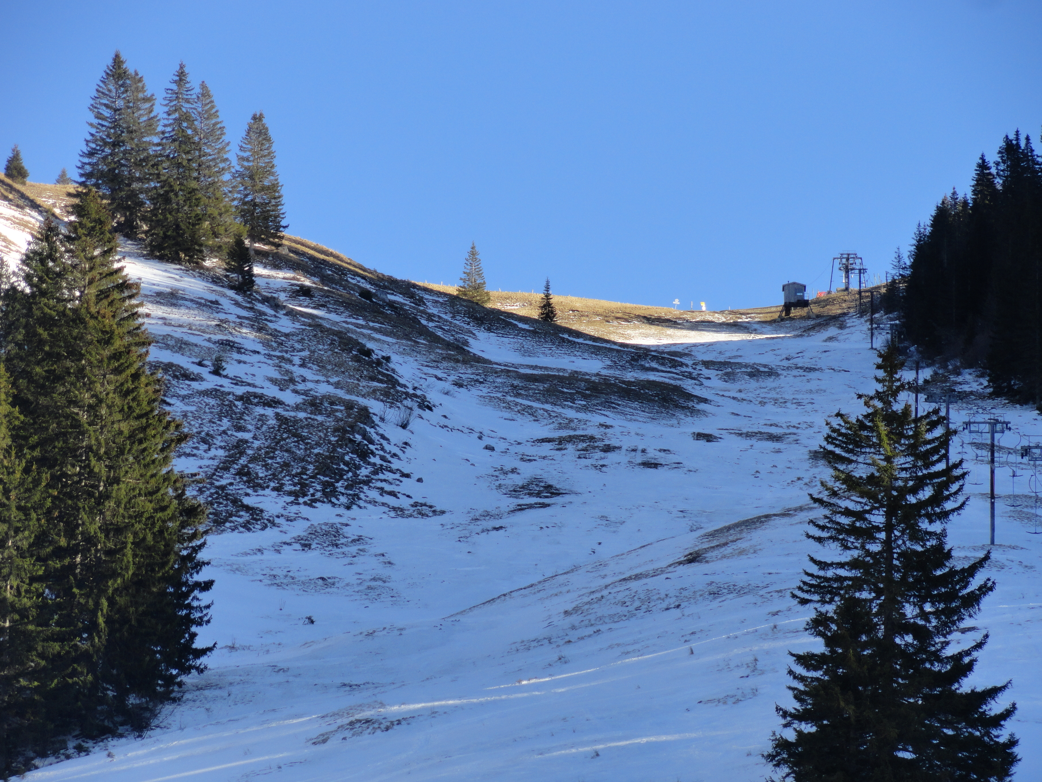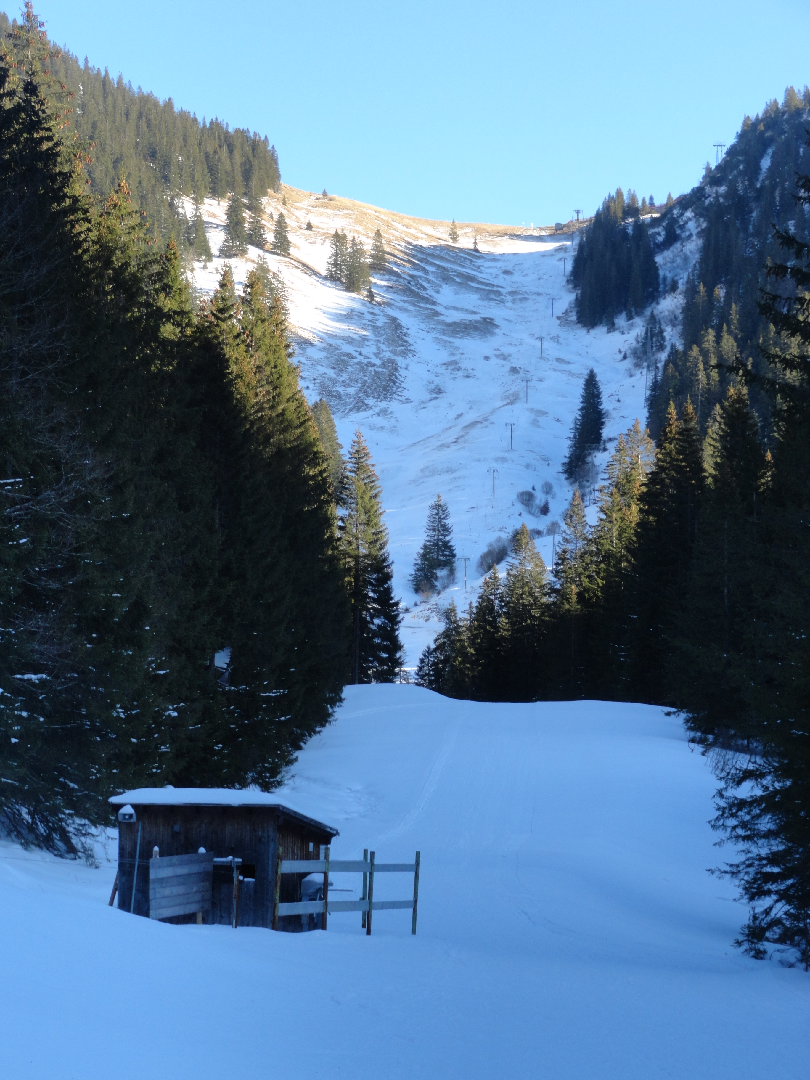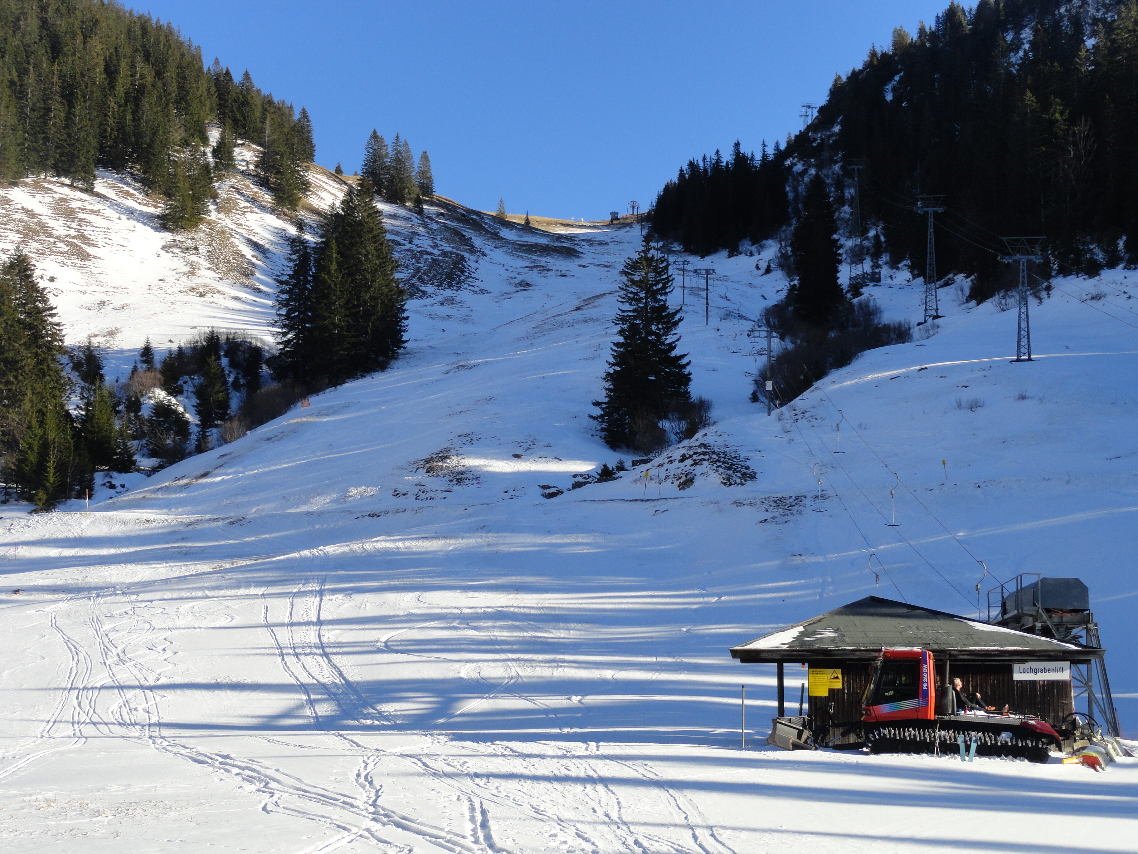 Die Abfahrt geht auch, man darf aber nicht zimperlich sein, was Steine unterm Ski anbelangt. Ganz links im Abfahrtssinn, also links des Schleppers und links des kleinen Grabens hab ich sogar noch etliche Schwünge im Pulver (na gut, sagen wir "Halbpulver") ziehen können.
