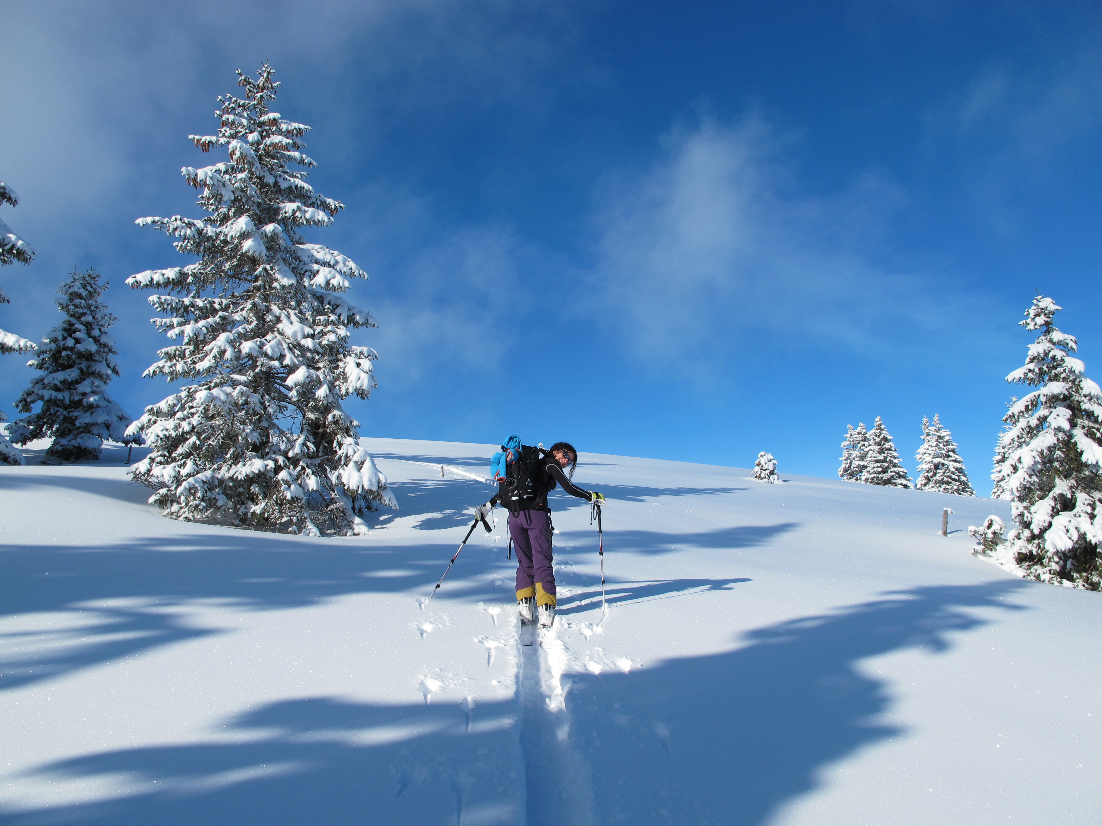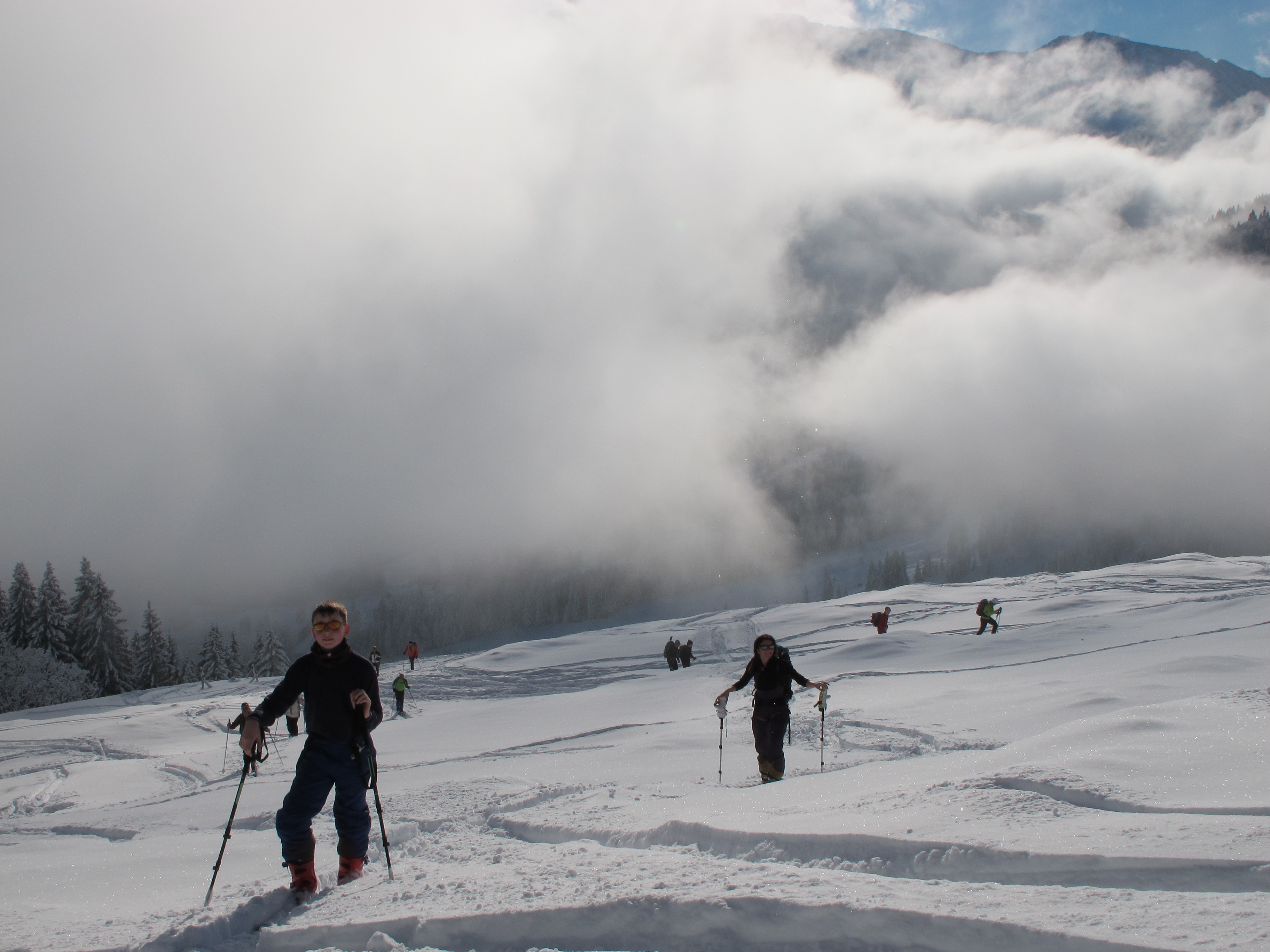 Tourenverhältnisse: Im unteren Bereich war die Schneélkage zwar knapp aber ausreichend, da auch ganz gut gesetzt, außerdem konnte man auch auf die Forststraße ausweichen. Oben dann Traumverhältnisse, etwa 25 bis 30 cm feiner Pulver auf dünner aber guter Unterlage. Vor allem der schattseitige Gipfelhang war ein Traum!