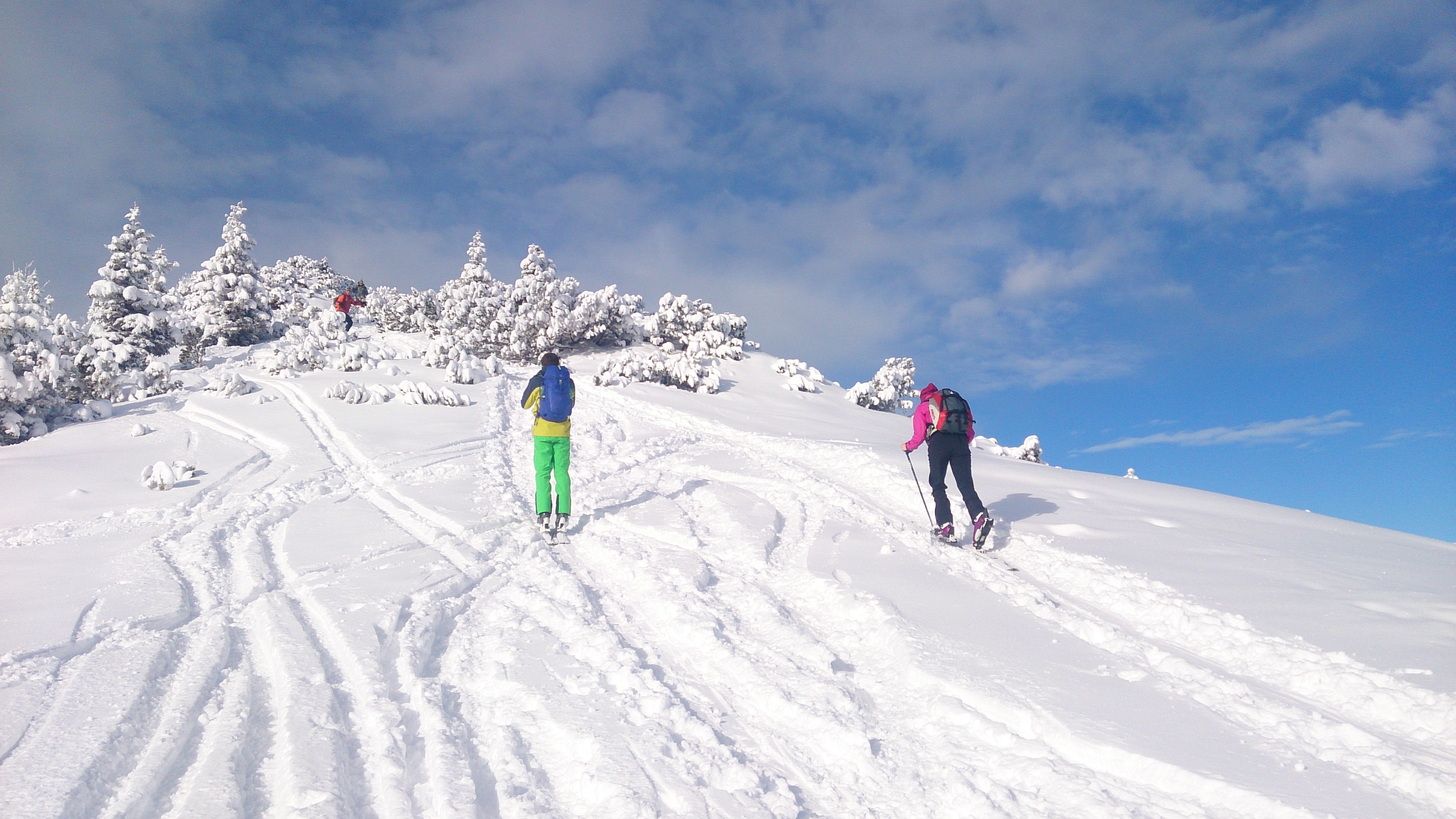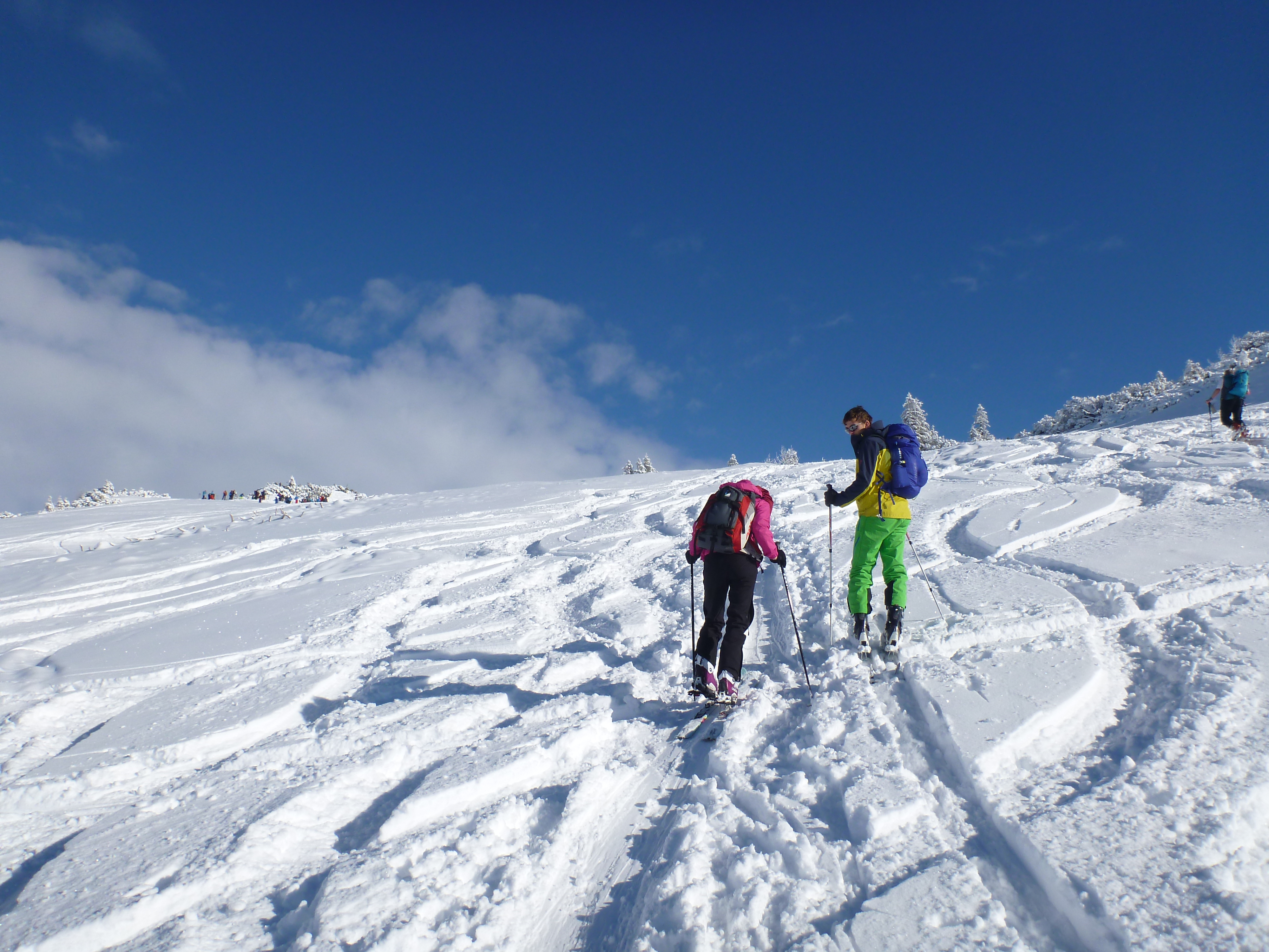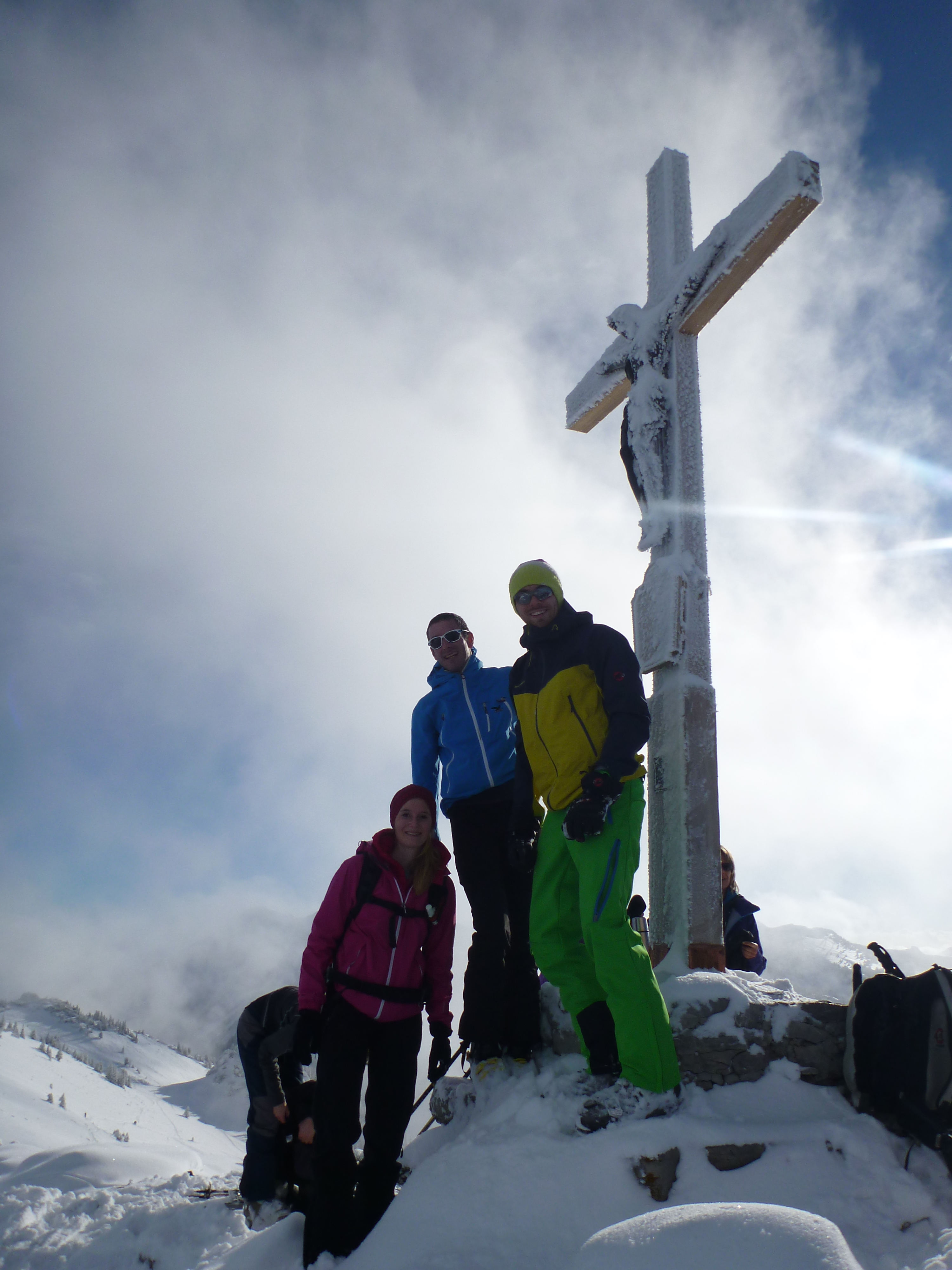 Tourenverhältnisse: Aufstieg über die Piste bis Abzweigung zur Schönfeldalm, dann weiter zur oberen Schönfeldalm und weiter zum Gipfel des Jägerkamps. Von dort den Gipfelhang abwärts traversiert und kurze Abfahrt durch super Pulver zur Schnittlauchmoosalm. Dort Auffellen und hoch zum Tanzeck. Abfahrt zur Schönfeldalm. Von dort sah die Taubensteinpiste super aus, also Auffelllen und hoch. Allerdings stellten wir schnell fest, dass auch hier die Unterlage fehlt und viele Steine raus schauten, deshalb fellten wir ab und fuhren über die Piste ab zum Parkplatz