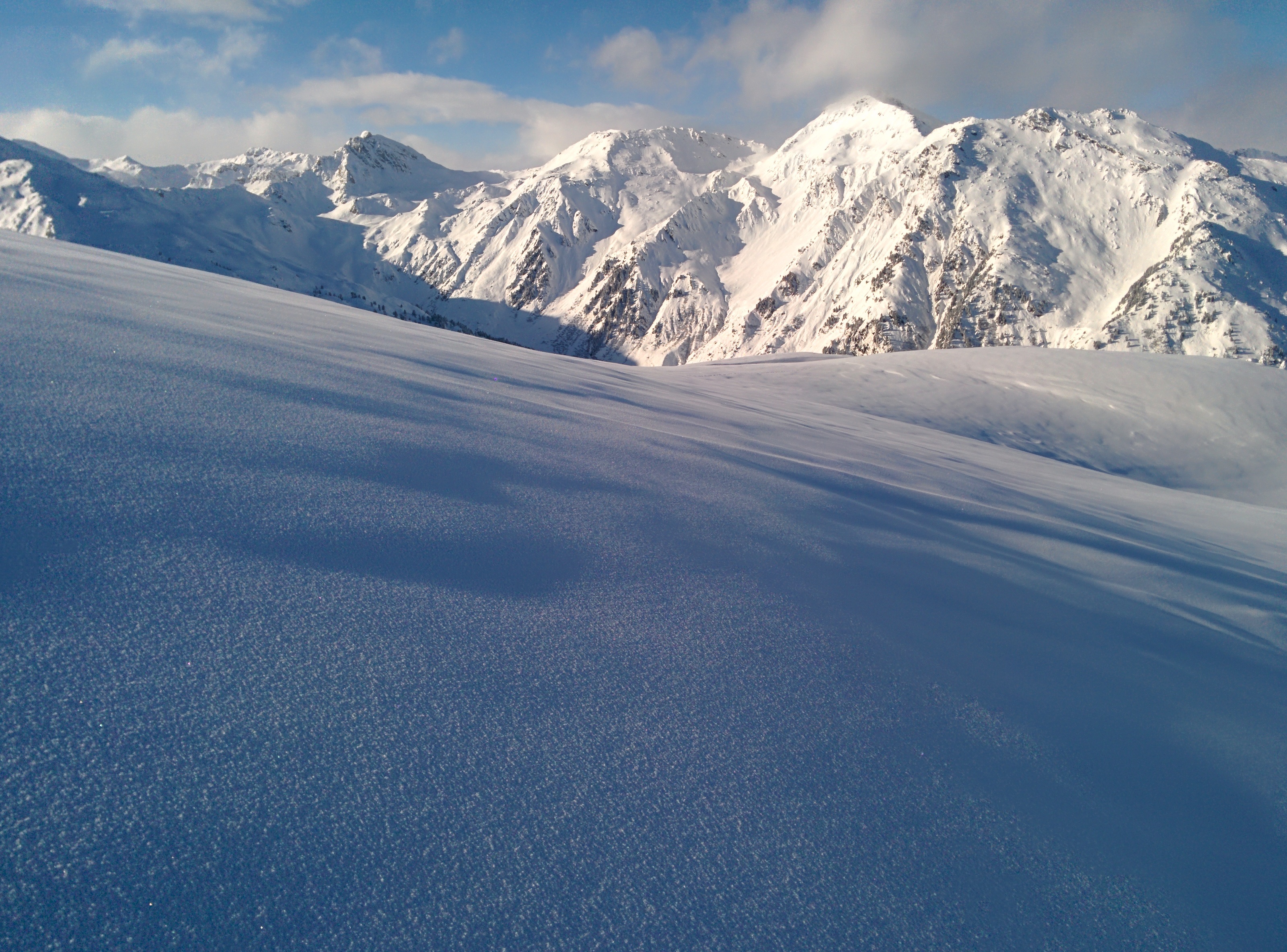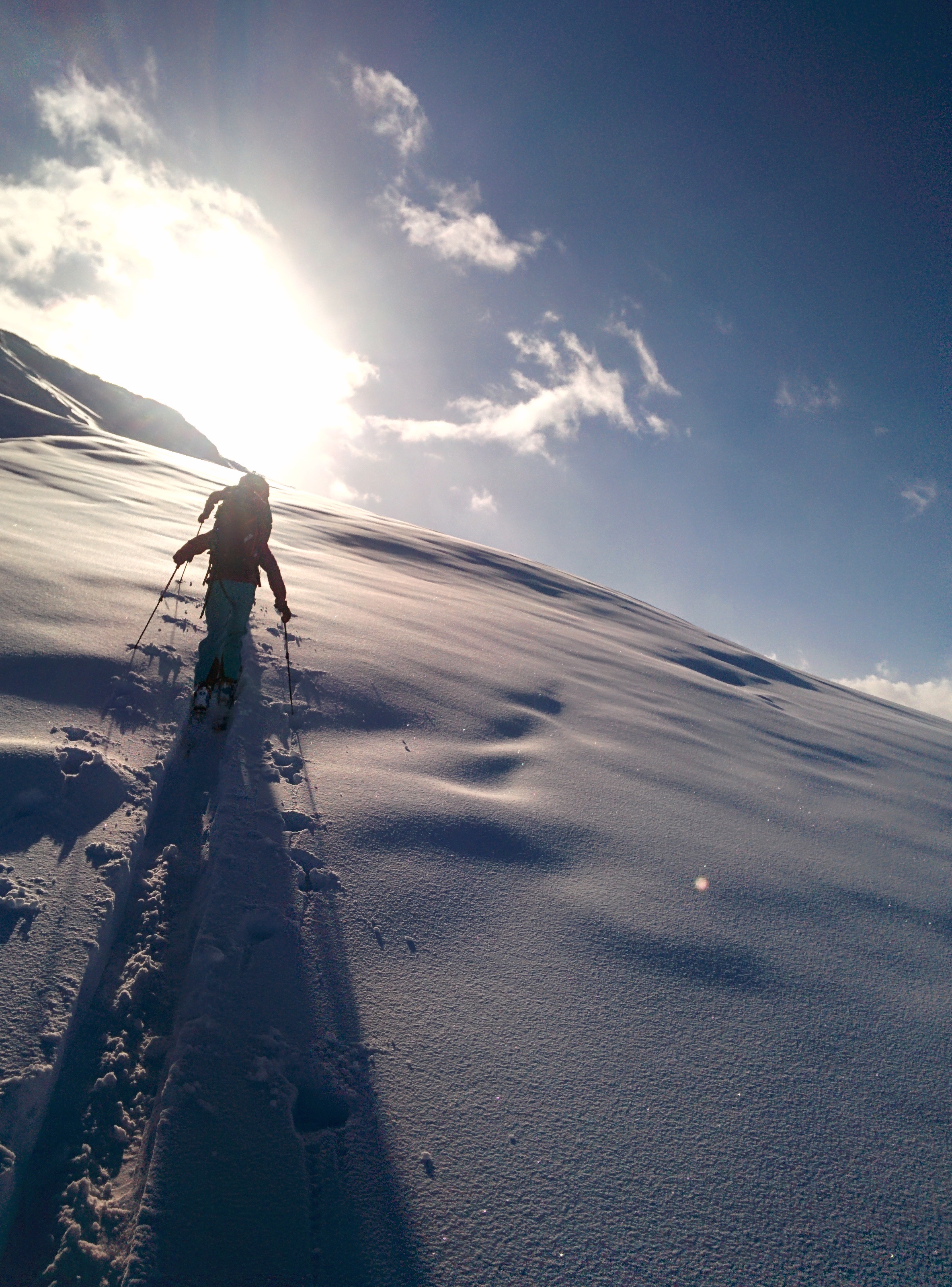 Gefahreneinschätzung: Wahrnehmung: Schnee ist mit wenig Wind gefallen, lediglich im Gipfelbereich Windzeichen gesehen. 1B Pulver. Die Krusten (siehe Lawinenbericht) haben wir gefunden, aber für ziemlich dick befunden...?