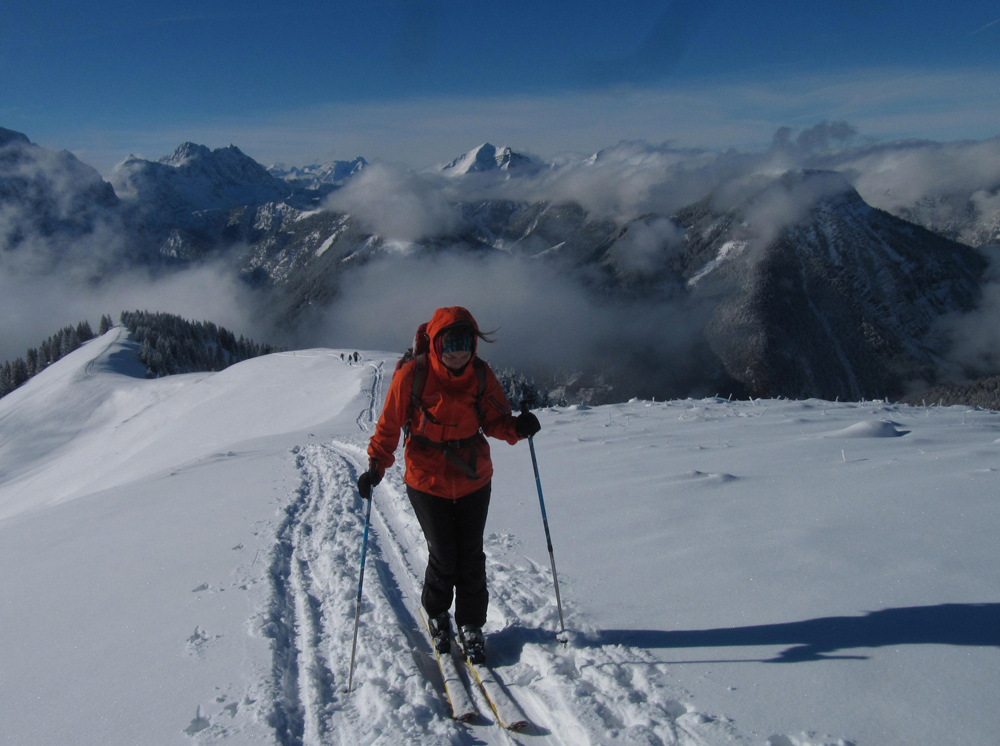 Tourenverhältnisse: Fortstraße trotz gerniger Schneelage (ca. 10 cm im Tal) gut fahrbar. Waldschneise im Aufstieg mit Ski möglich, abwärts aber nur zu Fuß. Die freien Wiesen und Rücken oberhalb aber sehr gut. Pulverschnee mit fester Unterlage. Auch der tolle Südwesthang hinunter zur verfallenen Schönalm war großartig.