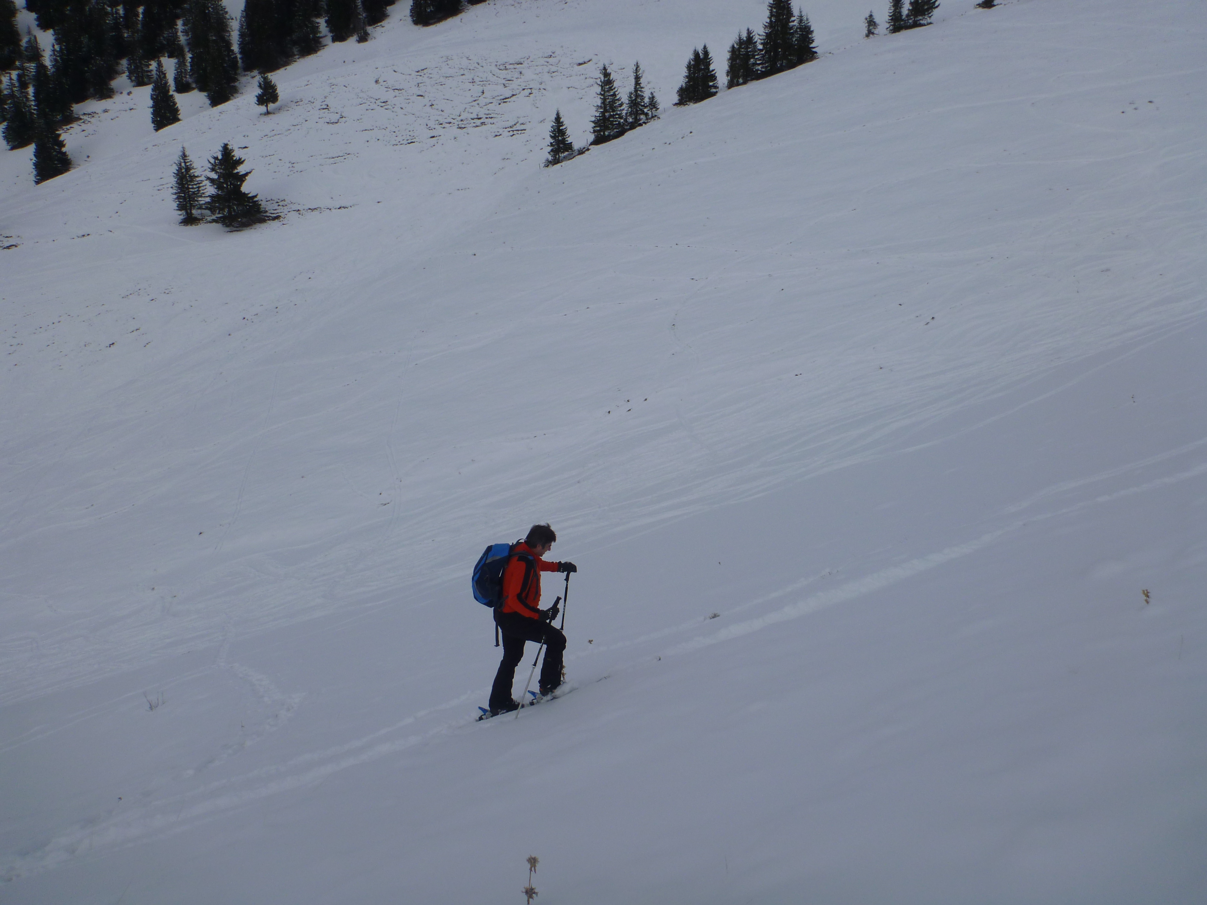 Tourenverhältnisse: relativ gut, Aufstieg über Piste durch Lochgraben, weiter zur Raukopfalm, den Gipfelhang traversierend und über den Grat zum Skidepot. In der Abfahrt teilweise 15 cm Pulver auf festen Untergrund, Gipfelhang definitiv lohnend, Piste im Lochgraben z. T. steinig.