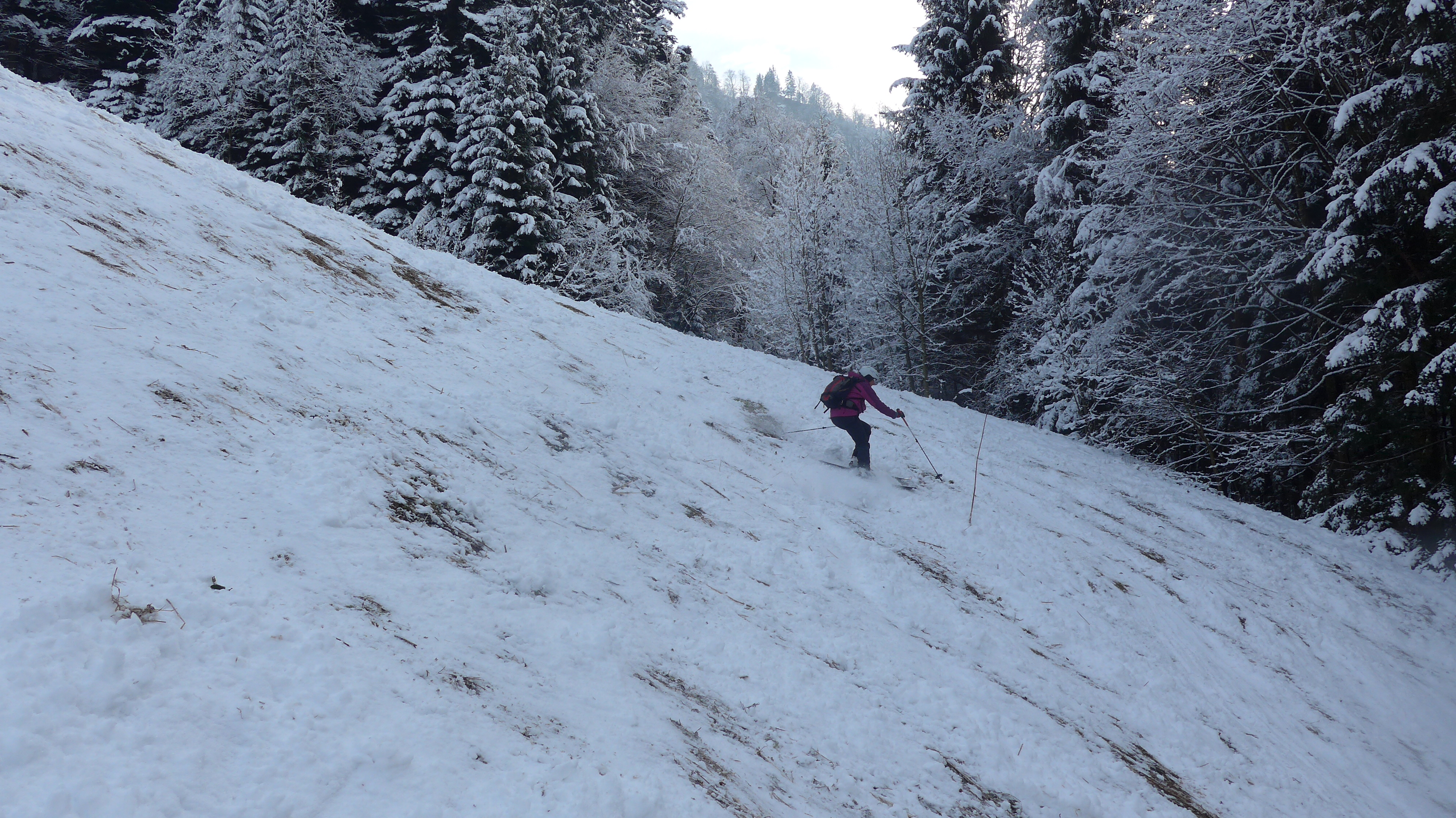 Bei der Abfahrt Steinkontakte möglich. Die Piste ist eisig. Abseits auch, mit dem etwas gewichtigen Pulver - eingeschränkte Abfahrtsfreude. Trotzdem hat es uns beiden Freude gemacht, draussen im Schnee gewesen zu sein.