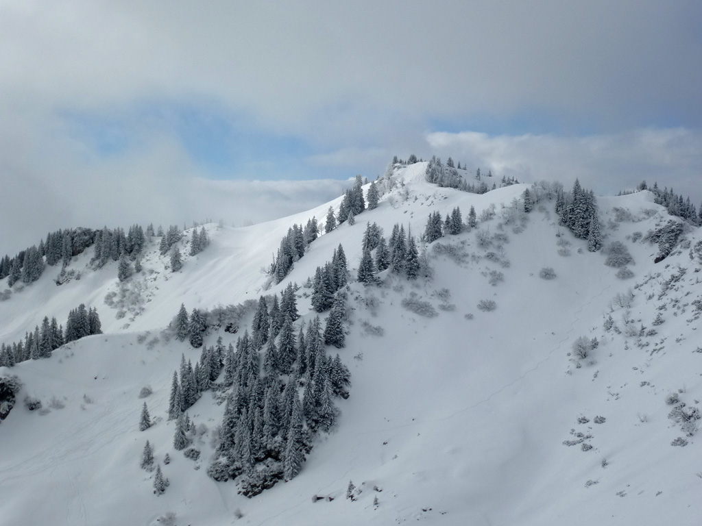 Die obersten 200 HM sind immer noch sehr gut zu fahren. Leider nur kurz, dann wird der Schnee recht schwer. Steine sind durch den geringen Neuschnee der Nacht nicht mehr zu erkennen: Ist die Unebenheit dort ein Stein oder eine Schneewelle von gestern?