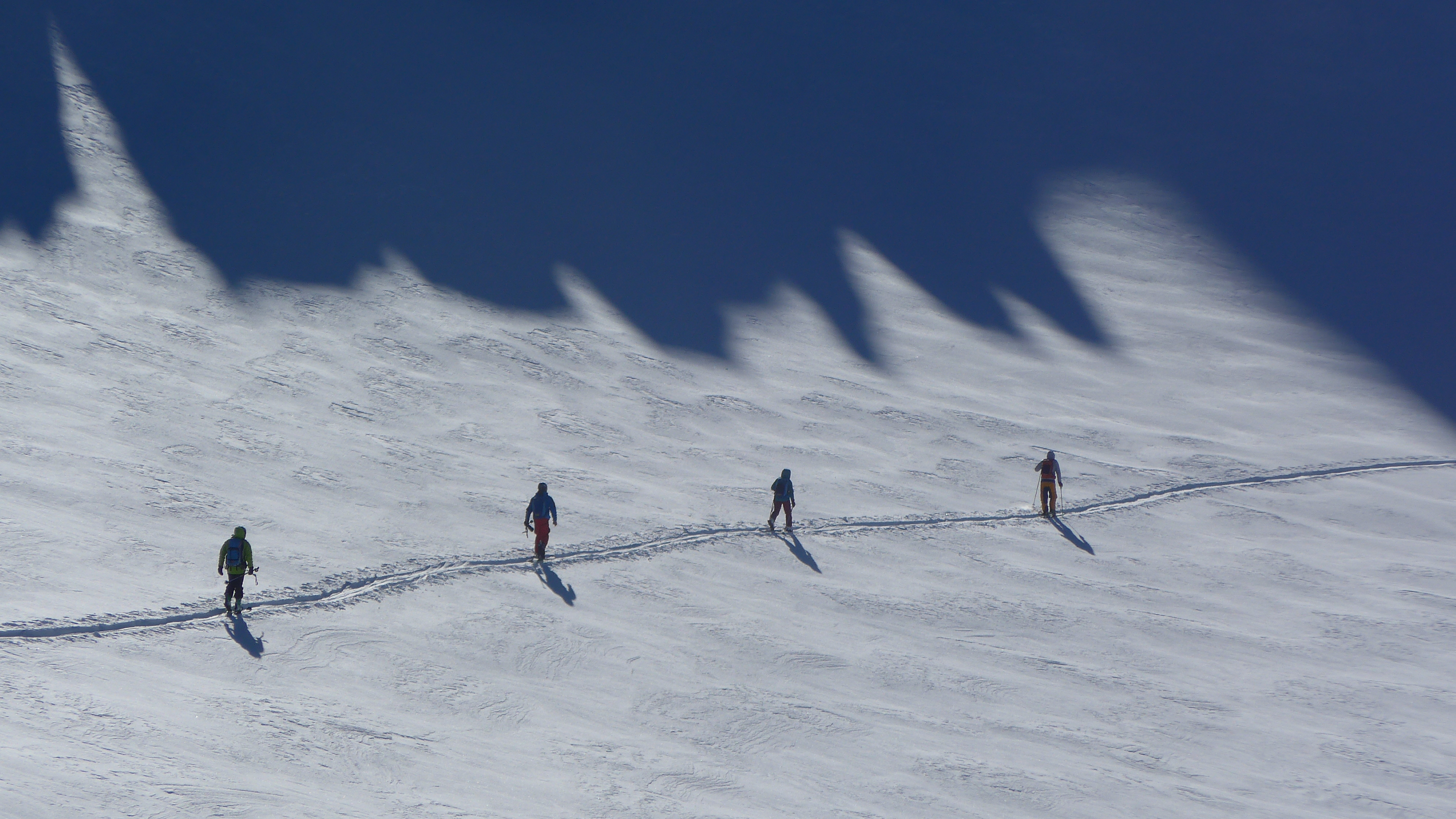 Tourenverhältnisse: Zustieg wie gestern. Heute kaum Wind bis nachmittags, damit deutlich genussvoller als gestern. Am Passo Pisgana nach Süden den weiten Kessel auf Passhöhe queren (steile Hänge!) zum Passo Corno di Bedole. Corno Bedole kann mit einer kleinen Fleißarbeit von 100 Hm bestiegen werden.