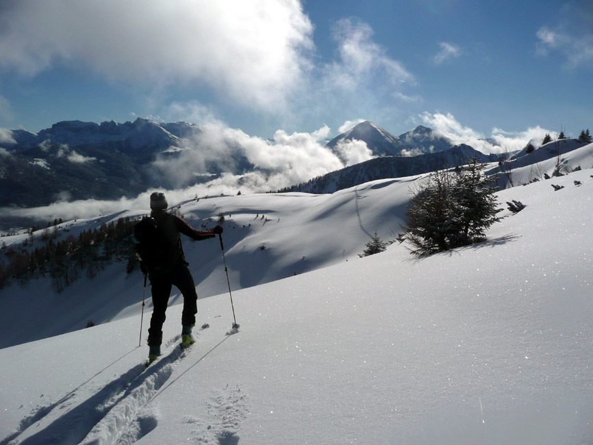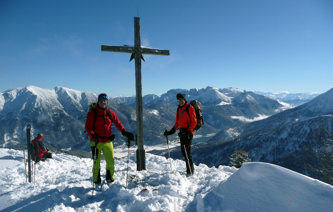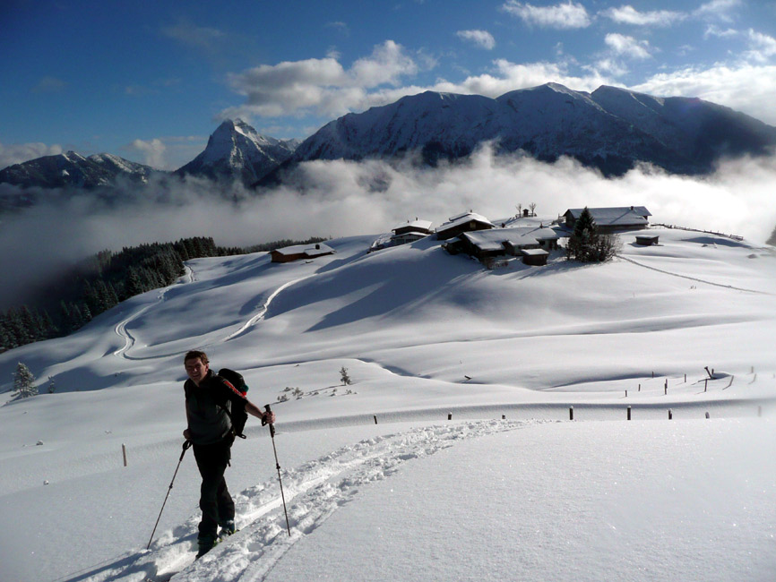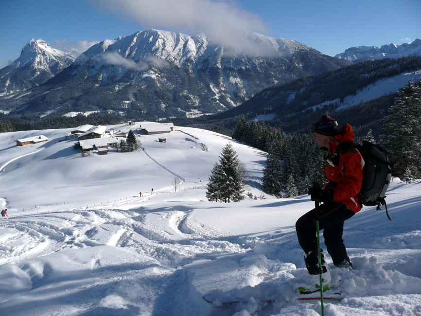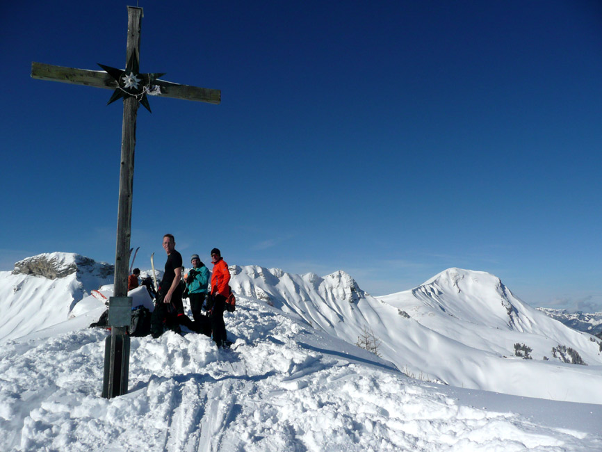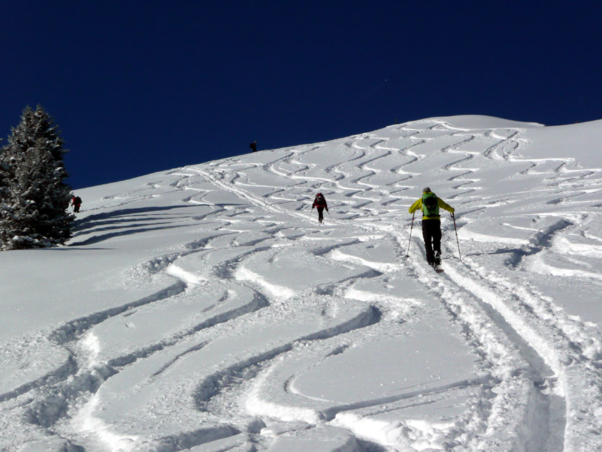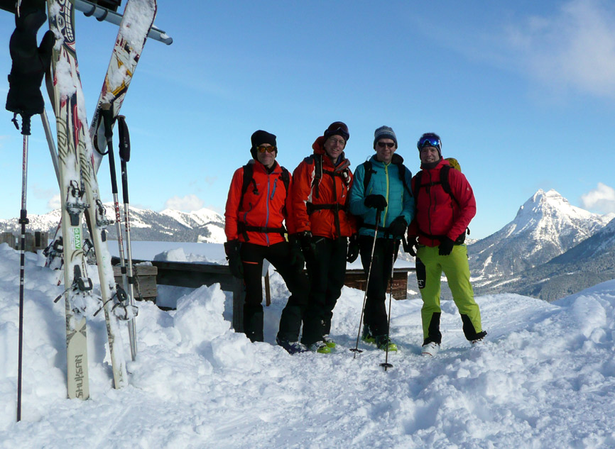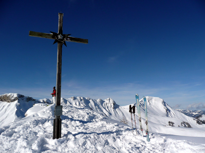 Tourenverhältnisse: Hervorragend - super Pulver vom Parkplatz bis zum Gipfel. Da wir heute zu den Ersten gehörten, hatten wir auch viel Platz für eigene Spuren. Unterhalb der Falkenmoosalm Abfahrt nicht auf dem Forstziehweg, sondern auf dem Anstiegssteig (ging prima).