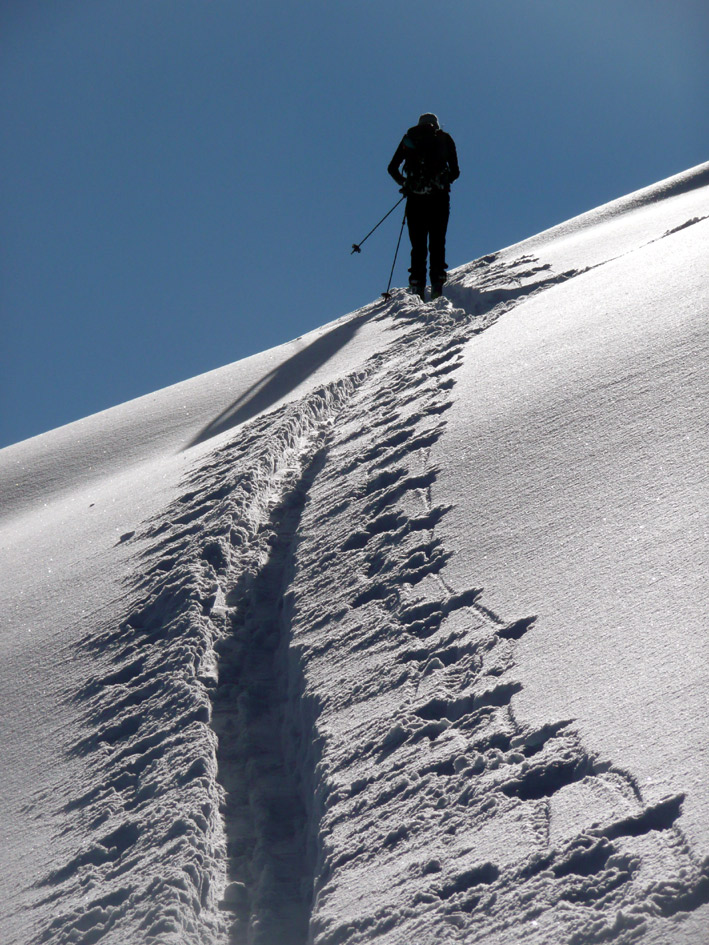 Gefahreneinschätzung: LWS 3. Im Aufstieg haben wir die Traverse vor dem Gipfelhang deutlich unterhalb gequert, in der Abfahrt sind wir sie einzeln gefahren. Ist vertretbar.