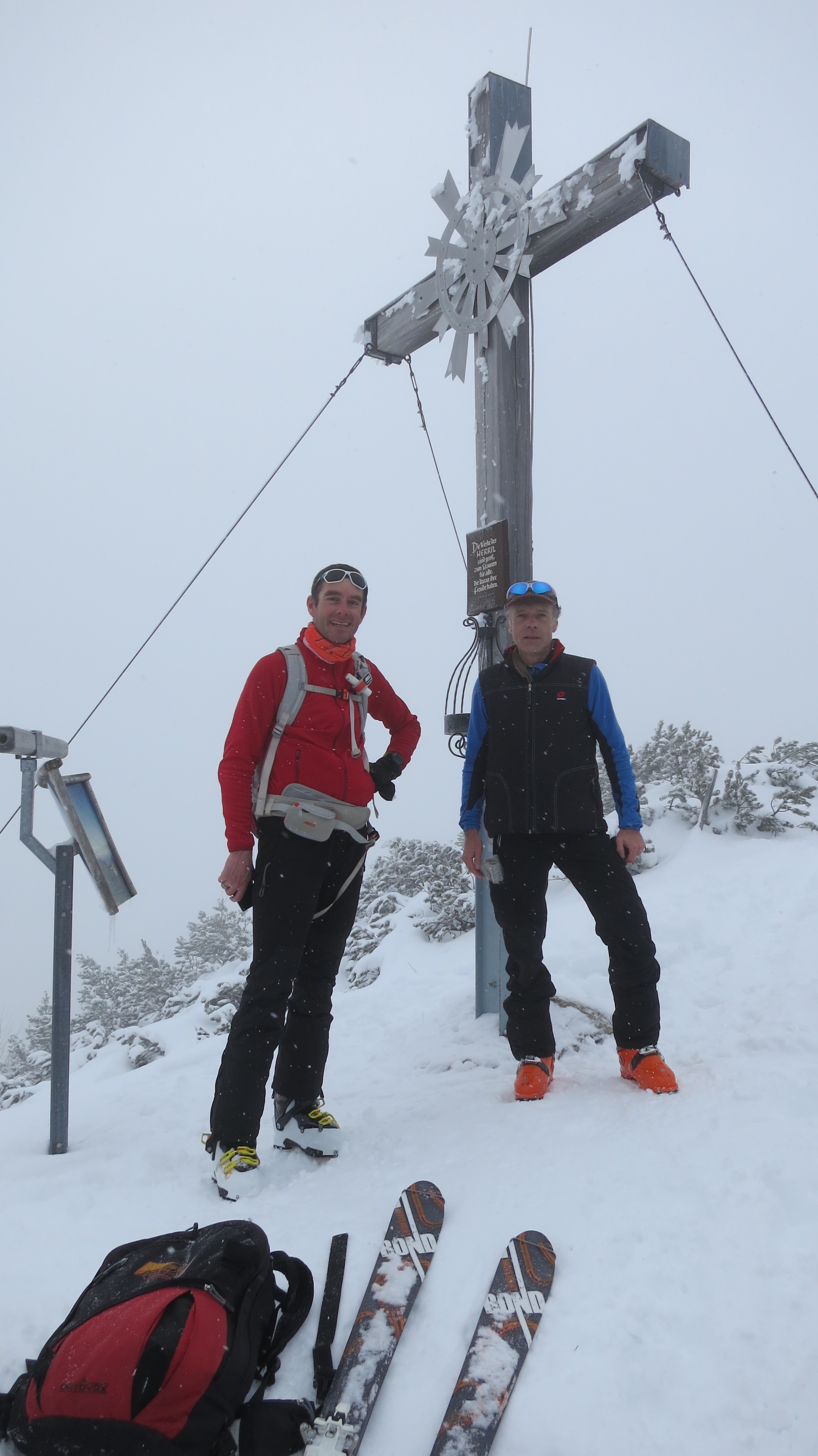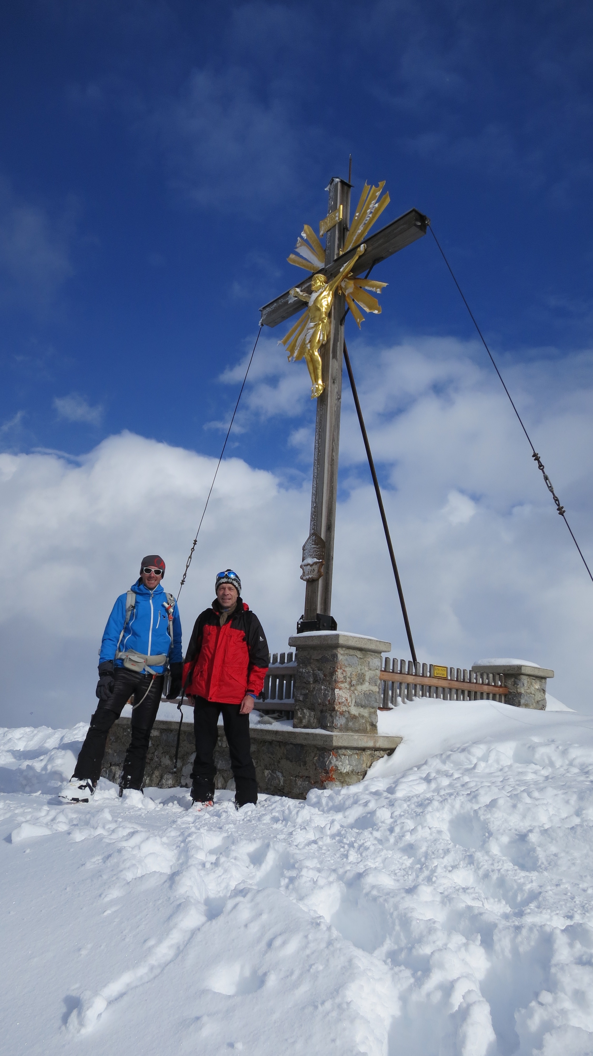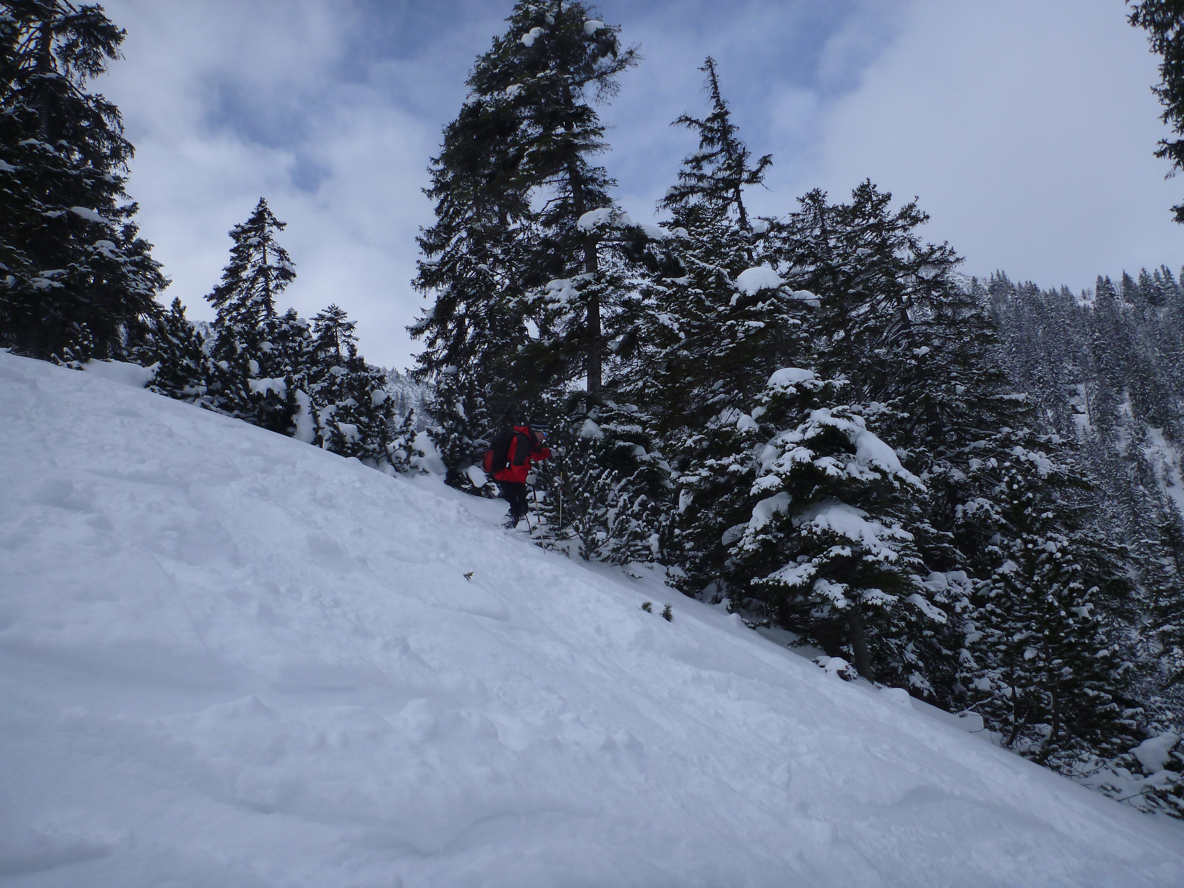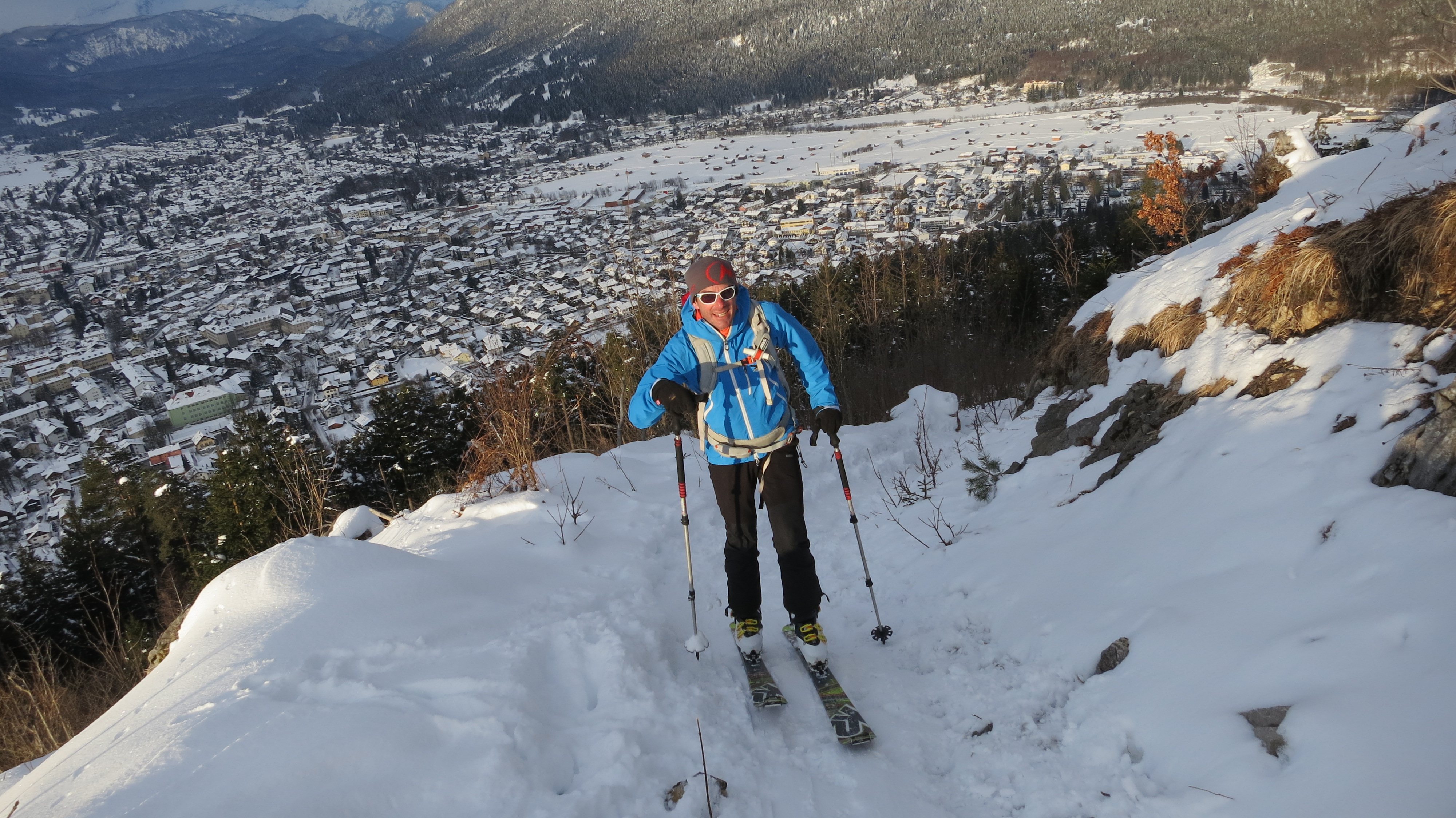 Tourenverhältnisse: Aufstieg zunächst über Forststraße, dann weiter unter der Bahn über die zum Teil eisige Spur (Harscheisen hilfreich) zum Farchanter Kreuz und weiter zum Wank-Gipfel. Abfahrt über die Piste durch stark verspürten Pulverhang zur Esterbergalm und zunächst schiebend, dann fahrend über Forstweg zurück zum Ausgangspunkt.