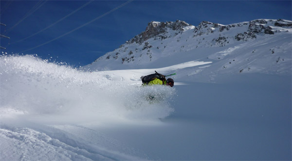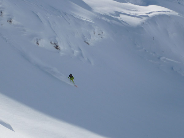 Tourenverhältnisse: am Freitag eher mäßige Bedingungen mit teils starkem Wind, anhaltendem leichten Schneefall und diffusen Sichtverhältnissen. Die Bergbahnen waren nur in den unteren Regionen offen. Der Samstag dagegen war ein Traumtag zum richtig Gas geben mit Sonne und unverspurten Powderhängen. Flims Laax ist ein Top Freeride-Revier, elendig weite Hänge und lange Abfahrten mit gaaanz viel Platz.