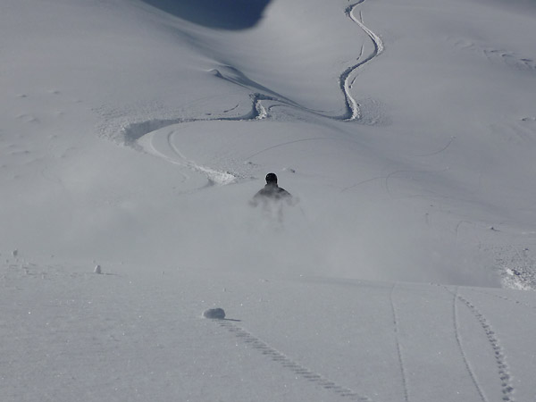 Tourenverhältnisse: am Freitag eher mäßige Bedingungen mit teils starkem Wind, anhaltendem leichten Schneefall und diffusen Sichtverhältnissen. Die Bergbahnen waren nur in den unteren Regionen offen. Der Samstag dagegen war ein Traumtag zum richtig Gas geben mit Sonne und unverspurten Powderhängen. Flims Laax ist ein Top Freeride-Revier, elendig weite Hänge und lange Abfahrten mit gaaanz viel Platz.