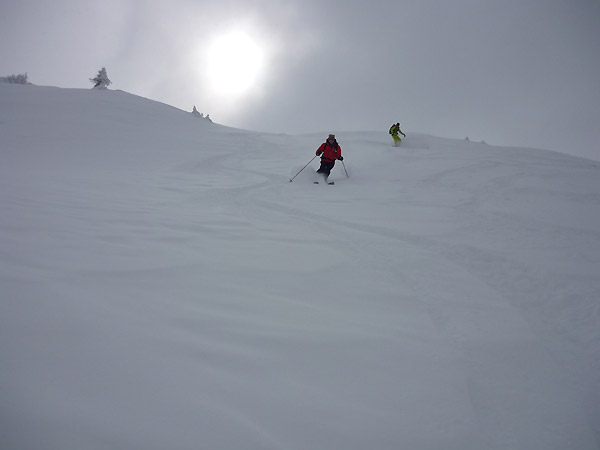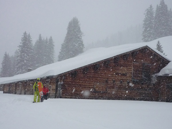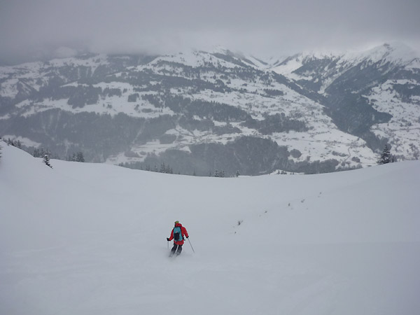 Tourenverhältnisse: Heute Vormittag noch das Schönwetterfenster genutzt und mit dem Shuttelbus zu den Fideriser Heubergen hinauf. Aufstieg in einer Stunde über das flache Gelände zur Kuppe oberhalb des Seeli, wo die lange 1600 Hm Abfahrt hinunter nach Fideris beginnt. Den Gipfel haben wir uns geschenkt, da uns der direkte Aufstieg bei den derzeitigen Bedingungen zu kritisch erschien. Punkt 12 Uhr als wir zur Abfahrt ansetzten hat es schlagartig zu gezogen und zu schneien angefangen. Die Abfahrt war kaum verspurt, in den Hängen von "Schlegl" auf ca. 1500 m teilweise Bodenkontakt, weiter unten wurde es dann wieder besser. Vor uns waren noch drei weitere Personen unterwegs, sonst war nichts los und das am Sonntag:-)