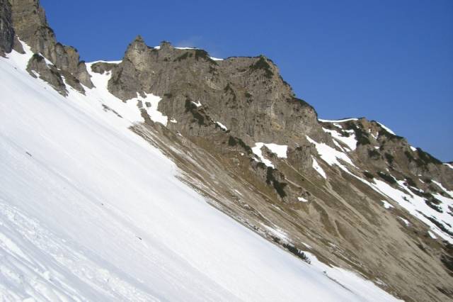 Tourenverhältnisse: am Anfang ca eine Viertelstunde Tragen, dann noch ein paar kleine kurze Unterbrechungen. Schnee morgens schon weich, Abfahrt um 10 Uhr kurz unterm Skidepot schon sulzig, weiter rechts (im Abfahrtssinn) noch besser. Schindertor immer noch voll Schnee.