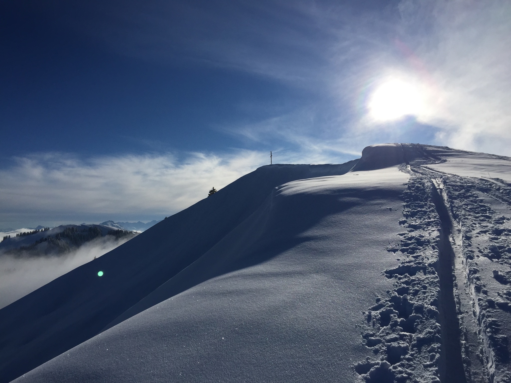 Sonstiges: Heute mal wieder das Seekarkreuz. Kurz nach der Gabelung Winter-/Sommerweg (940m) rechts hoch Richtung OSO in anfangs angenehmer Steigung in den lichten Wald hinein. Bald gewinnt man zügig Höhe auf dem verschlungenen Pfad durch den Wald, bis man, nachdem man zwei Forstwege gequert hat, auf der bekannten Lichtung (1320m) beim Stickelberg landet. Von dort Richtung Brandkopf, zum Joch oberhalb der Rauhalmen und zuletzt den Rücken hoch zum Seekarkreuz (1601m). Runter gleich Richtung N nach links in den lichten Wald hinein und rechts haltend in den Hang mit fetten Pow 300Hm von oben bis unten. Und das mit 100mm unter der Bindung… Am Forstweg etwas nach NO gequert und dann immer nach NW durch den Wald in mal weiteren, mal engeren Bögen durch die Bäume bis man unten den Forstweg trifft, der zum PP zurück führt.