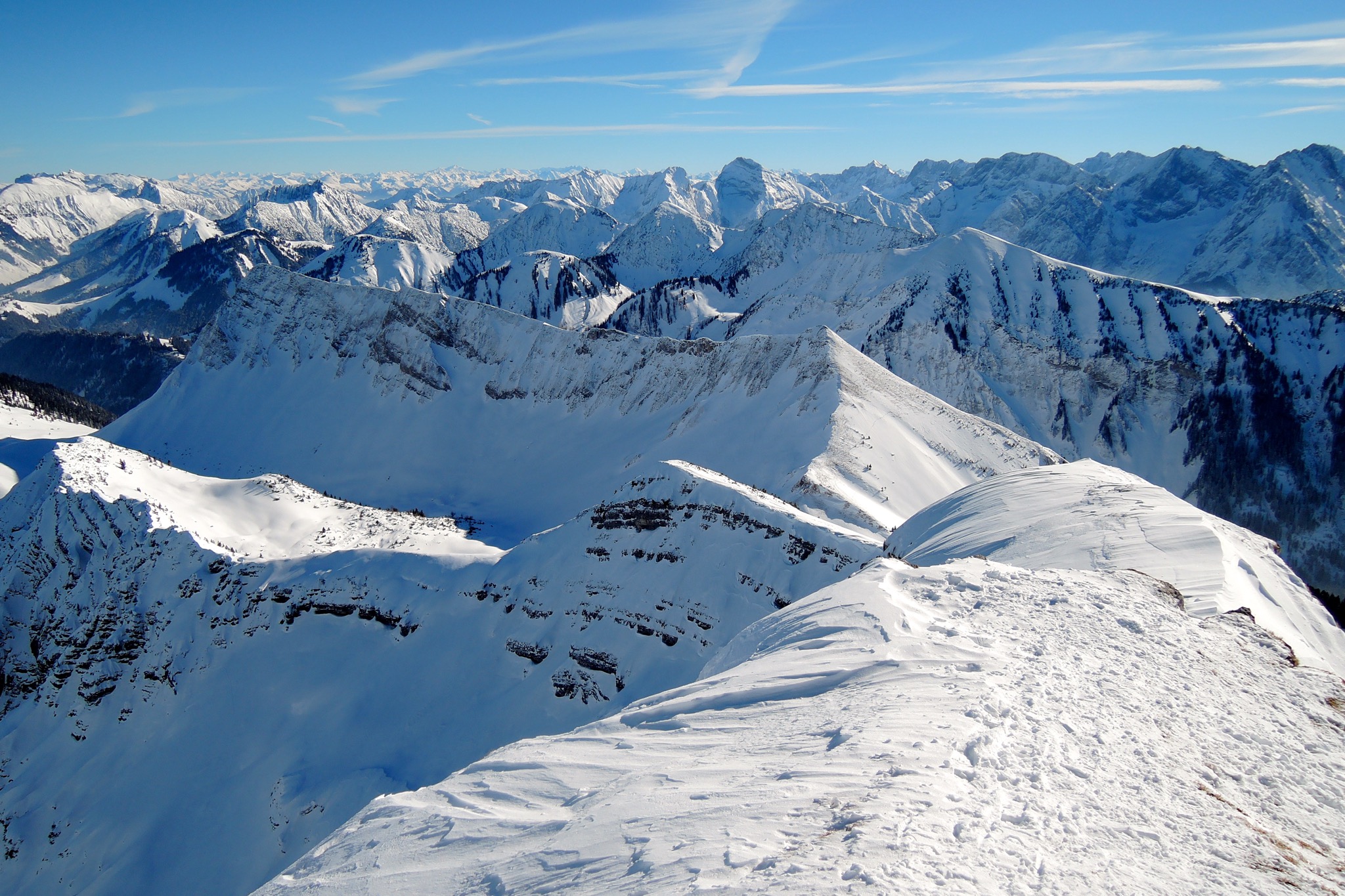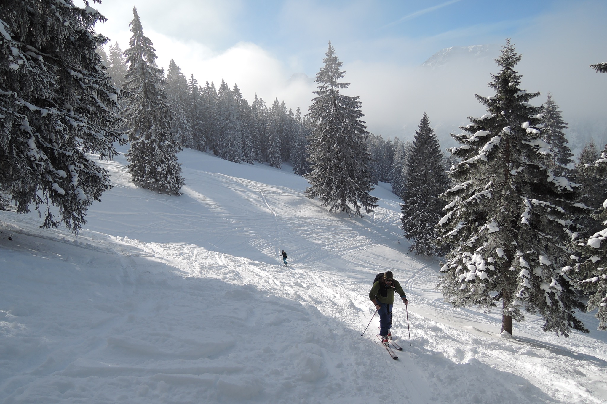 Tourenverhältnisse: NW-Rücken abgeblasen, Sharks..., Forststrasse zeigt erste Blessuren, sonst reichlich Schnee, der allerdings zerfahren und nicht mehr fluffy ist