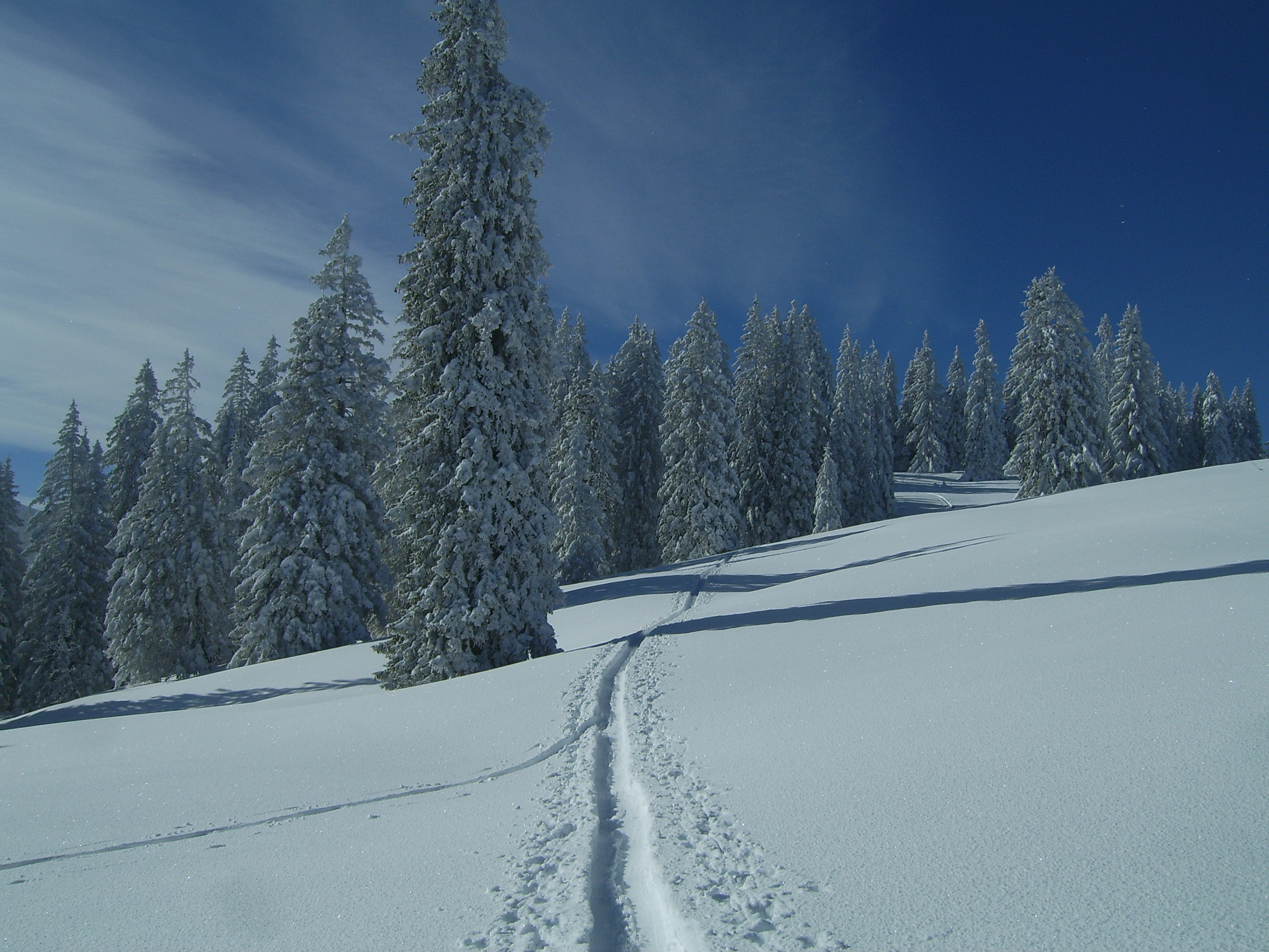 Tourenverhältnisse: auf Grund der Kälte 'rundumadum' noch Top-Pulver, wenngleich südseitig der Schnee auf Grund der Sonneneinstrahlung schon schwerer wird.
