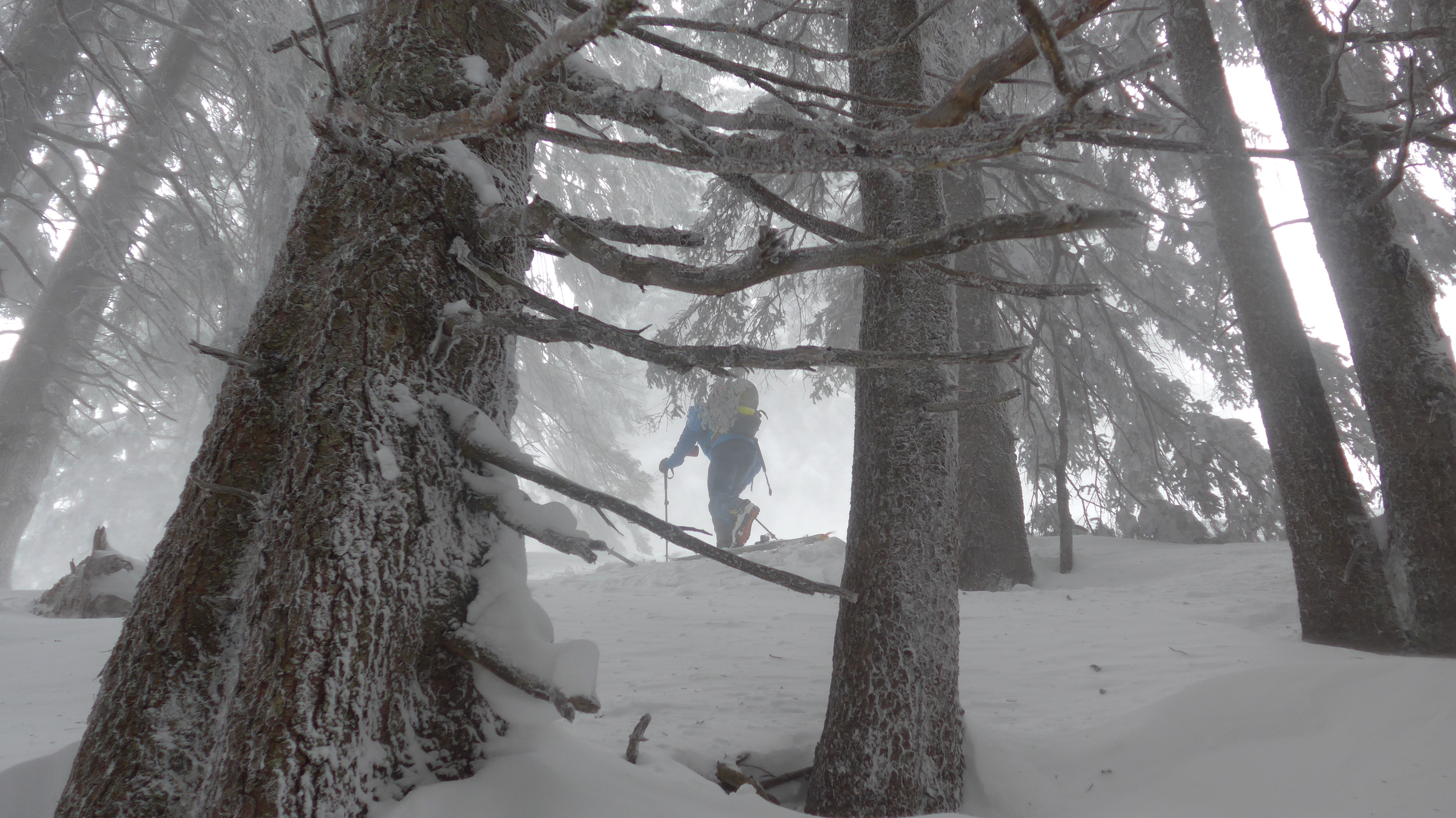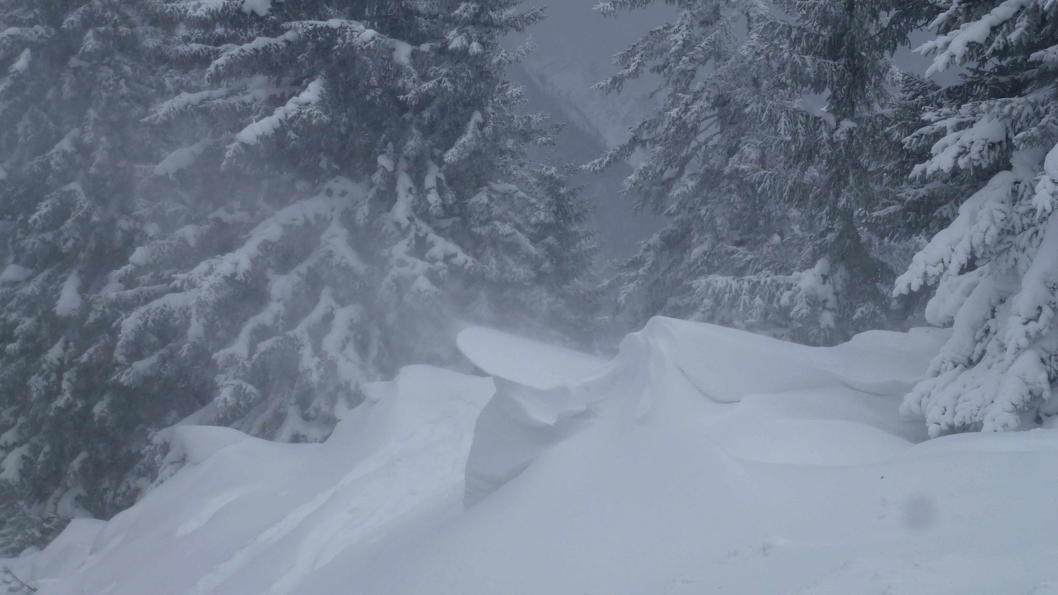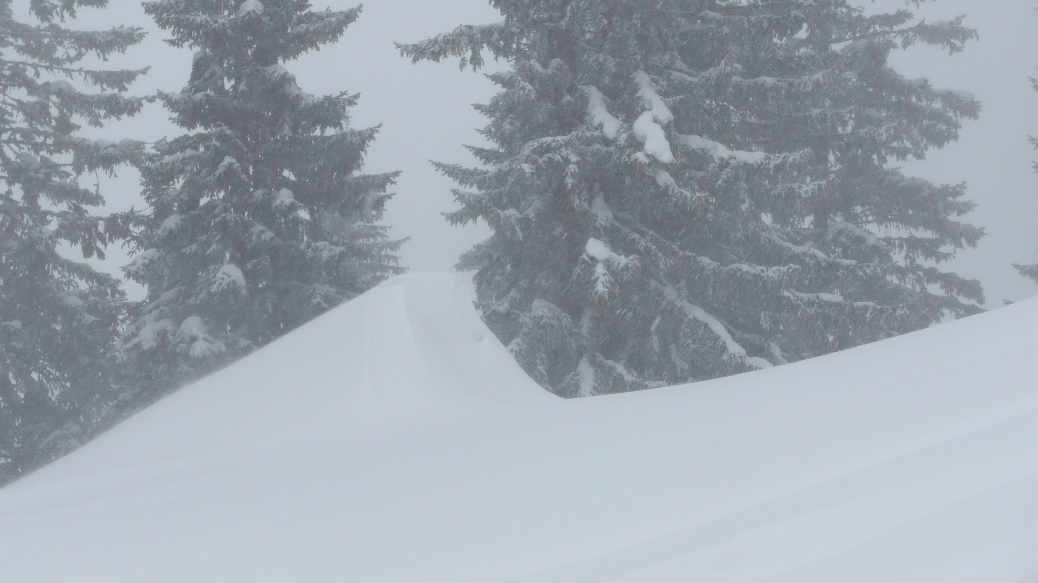 Tourenverhältnisse: ca. 10 cm Neuschnee im Tal. Dicke Schneeflocken. Kalt. Ab mittags hat der Wind an einem gerüttelt. 1 m hohe Schneewächten entlang dem Gipfelgrat! Die standen gestern noch nicht. White out am Gipfelgrat - 2 m Sicht. Wir haben uns heute deshalb den Gipfel geschenkt.