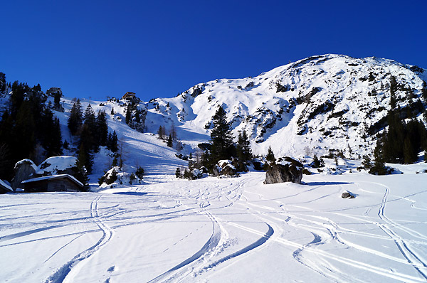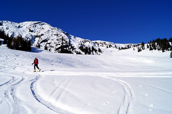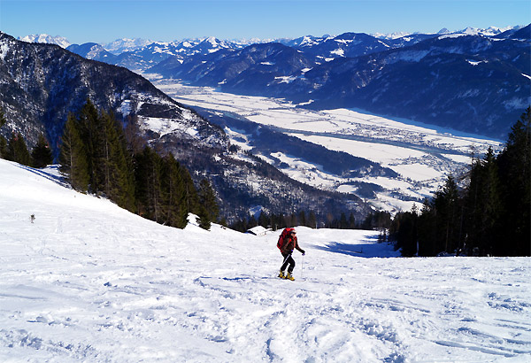 Tourenverhältnisse: Trotz des niedrigen Ausgangspunktes genügend Schnee. Frühjahrbedingungen mit am Morgen gefrorener Schneedecke, die aber sonnseitig recht schnell aufweichte. Überwiegend schöne Sulzschneeabfahrt, nur ein paar braune apere Flecken vorhanden. Im Schatten noch leicht pulvrig.