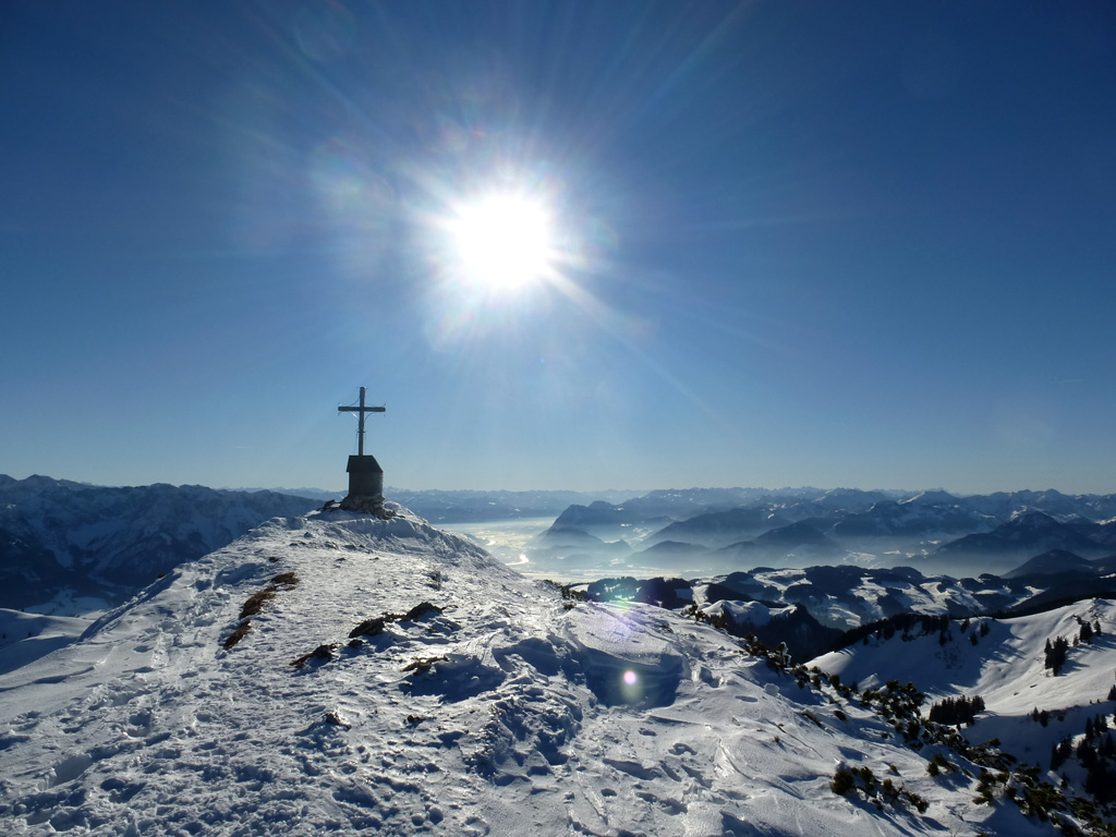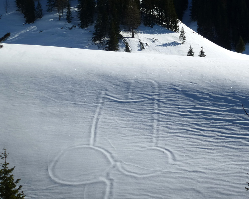 Heute leider erst Mittags los gekommen. Dann also eine Tour direkt von der Haustür weg. Kaiserwetter. Vom großen Parkplatz bei Sachrang über die Forststraße, Abkürzer nutzen. Talalm hat genung Schnee. Weiter Forststraße, zuerst zur Bergwachthütte, weiter zur Oberkaseralm und durch die Gipfelmulde zum Sattel. Skidepot, die Latschen sind immer noch etwas frei.