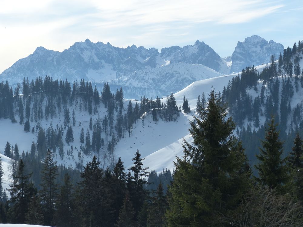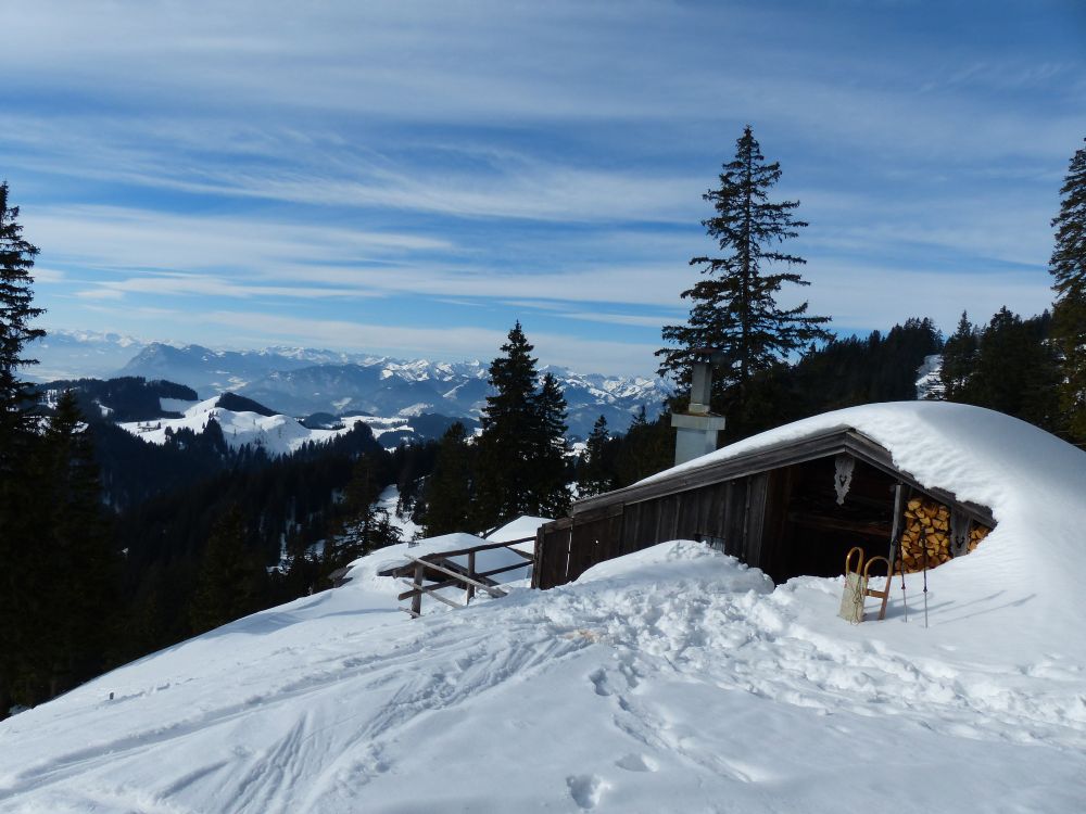 Tourenverhältnisse: Bereits vom Parkplatz weg herrschte sonniges Wetter vor. Die Straße von Sachrang zur Priener Hütte ist - wie hier nun schon öfters erwähnt - bestens präpariert. Das hat sich vorallem bei den Schlittenfahrern rumgesprochen, entsprechend viele waren unterwegs. Der Aufstieg war zwar hart, war aber bestens zu gehen, da zeigte sich schon, dass der Harschdeckel mancherorts tragen könnte.