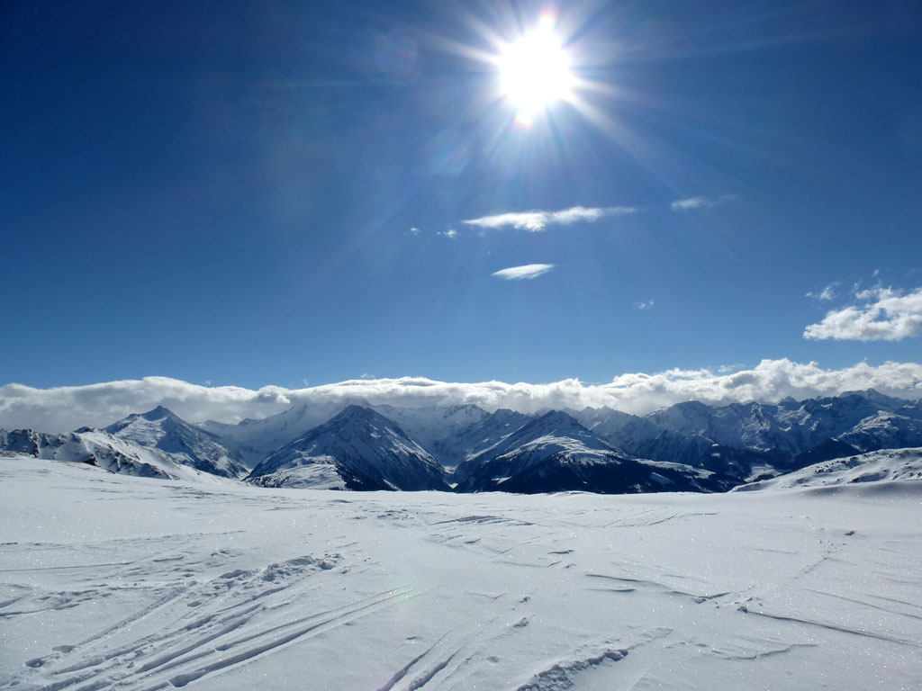 Nach zwei Wimpernschlägen scheren wir aus der Herde aus und bleiben im Langen Grund; mit neuem Ziel Pallspitze. Fast alleine. Direkt hinter der Martl-Erlaualm geht’s links auf den Sommersteig – anspruchsvoller und kürzer als auf der Fahrstraße weiter taleinwärts. Bei 1.600 m erreichen uns die ersten Sonnenstrahlen. Genau hier legen wir den obligatorischen Vogelfutter-Platz einer jeden Skitour an: geschützte Stelle suchen, Schnee weg, Boden aufkratzen, Futter verteilen.