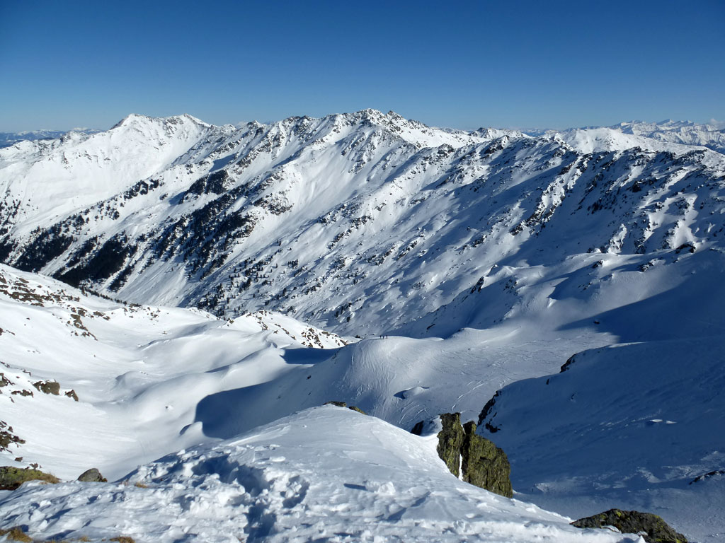Die Abfahrtsfreuden halten dann nur am Gipfelhang. Schon in der Mulde bei den beiden Seen wird’s auch hier windgepresst, später harschig, aber immer bei jedem Schwung anders. Je näher die Frommalm, desto sulzig-schwerer. Unsere mit Sicherheit schlechteste Abfahrt des Winters. Trotzdem eine wunderschöne Gegend und ein kurzweiliger Tourentag.
