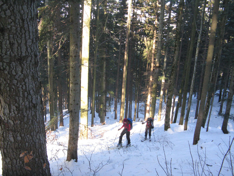 In der Abfahrt vom Mitterberg sollte man sich direkt nach Nord halten. Da war sogar gestern noch richtig Pulver. Im Weiteren ist das obere Waldstück gut im Wald zu fahren - wenn der Schnee gut ist. Beim gestrigen Bruchharschsulz war es spannend. Die untere bewaldete Hangstufe zum Litzlbachtal hinunter braucht zum Abfahren mehr Schnee als gestern. Da sind wir dann lieber zu Fuß gegangen, um die junge Triebe zu schonen. Man könnte ggf an der Hangkante etwa 80m weiter fahren (auf der LVA-Karte zum Punkt 883m) und auf einem dort eingezeichneten Weg schräg in den Hang der Sulzbergschneid reinqueren - das hab ich aber erst gerade eben auf der Karte gesehen...