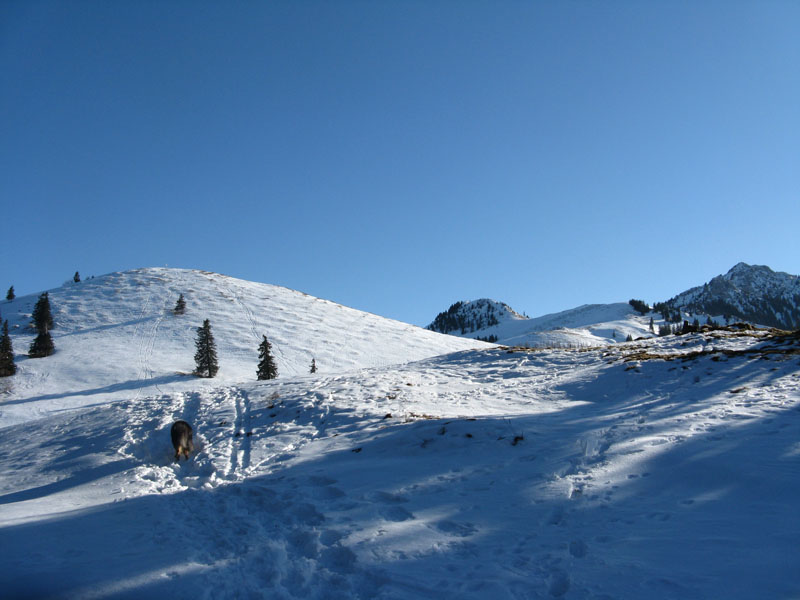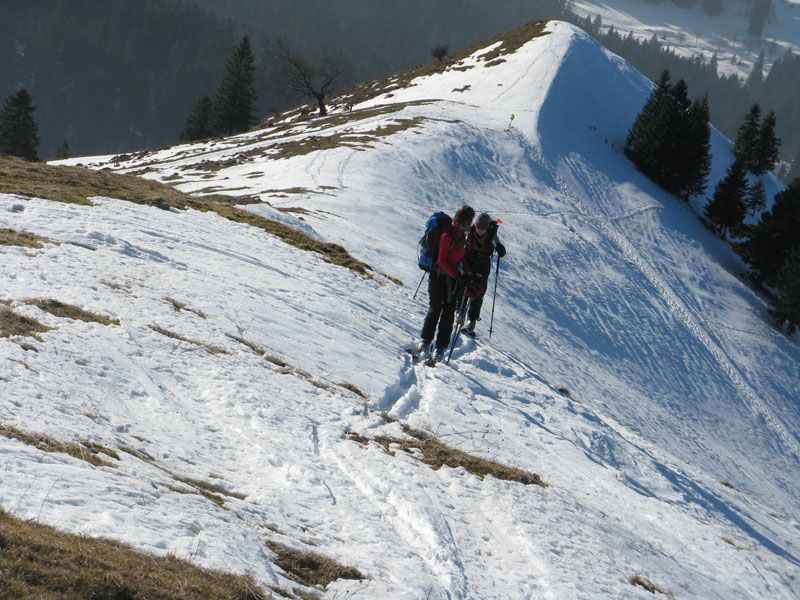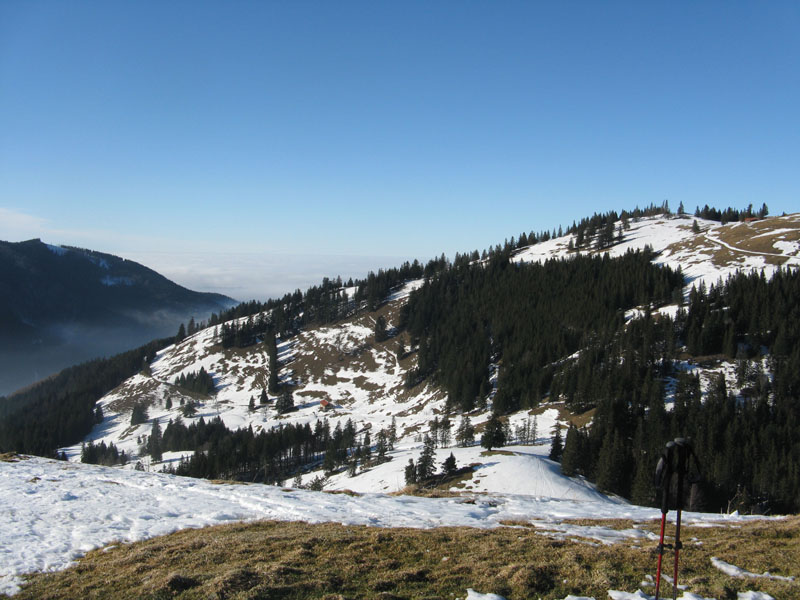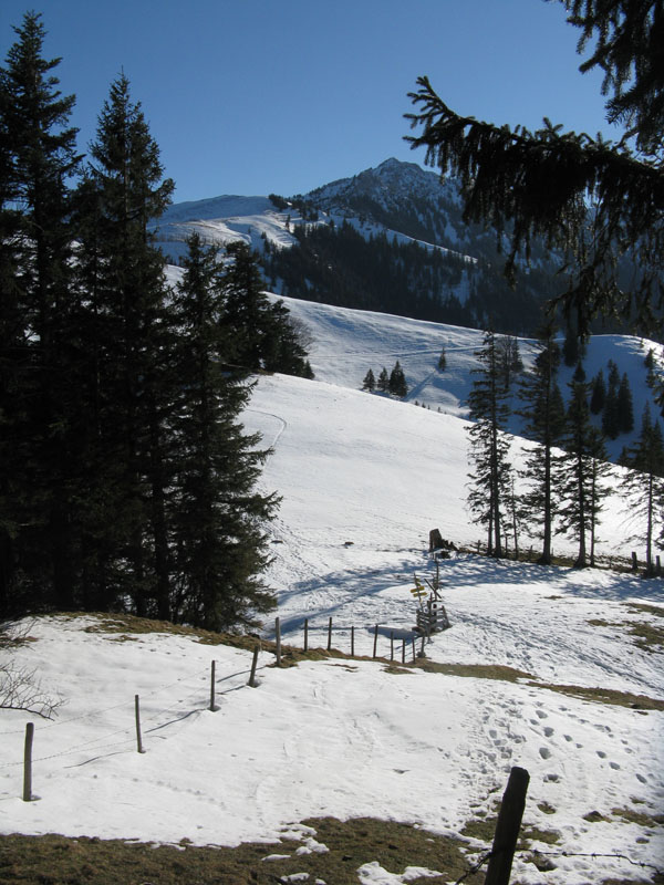 Sonstiges: Eigentlich wollten wir Farrenpoint und Mitterberg machen, aber der Farrenpointsüdhang wäre in ein Schneesuchspiel ausgeartet. Wir sind nicht den üblichen Aufstieg von Brannenburg gegangen sondern mal von Litzlbach hoch. Von Feilnbach kommend direkt nach der Kirche rechts rein in die Sulzbergstraße. Beim Abzweig "Zementwerk" parken (drei bis vier Parkplätze). Auf dem Forstweg ins Tal des Litzldorfer Bachs hinein. Am Talschluss nicht den Hauptweg weiter (der dreht um), sondern an der Beschilderung Farrenpoint / Schlipfgrubalm folgen (790m). Es geht etwas steiler auf einem schmalen Weg die Waldstufe hoch (nicht von den querenden vermeintlichen Forstwegen verleiten lassen; das sind nur kurze Wegstücke, die immer im Nichts enden). An der Hangkante (900m) dann trotz des Apfelstrudels nicht zur Schlipfgrubalm runter, sondern rechts Richtung Farrenpoint ca eine halbe Stunde durch den Wald auf einem breiten etwas ruppigen Fuhrweg zum Sattel zwischen Farrenpoint und Mitterberg (1105m). HIer könnte man dann rechts hinauf auf den Farrenpoint (1273m), der war aber ziemlich aper, daher sind wir nur rechts auf den Mitterberg (1214m).