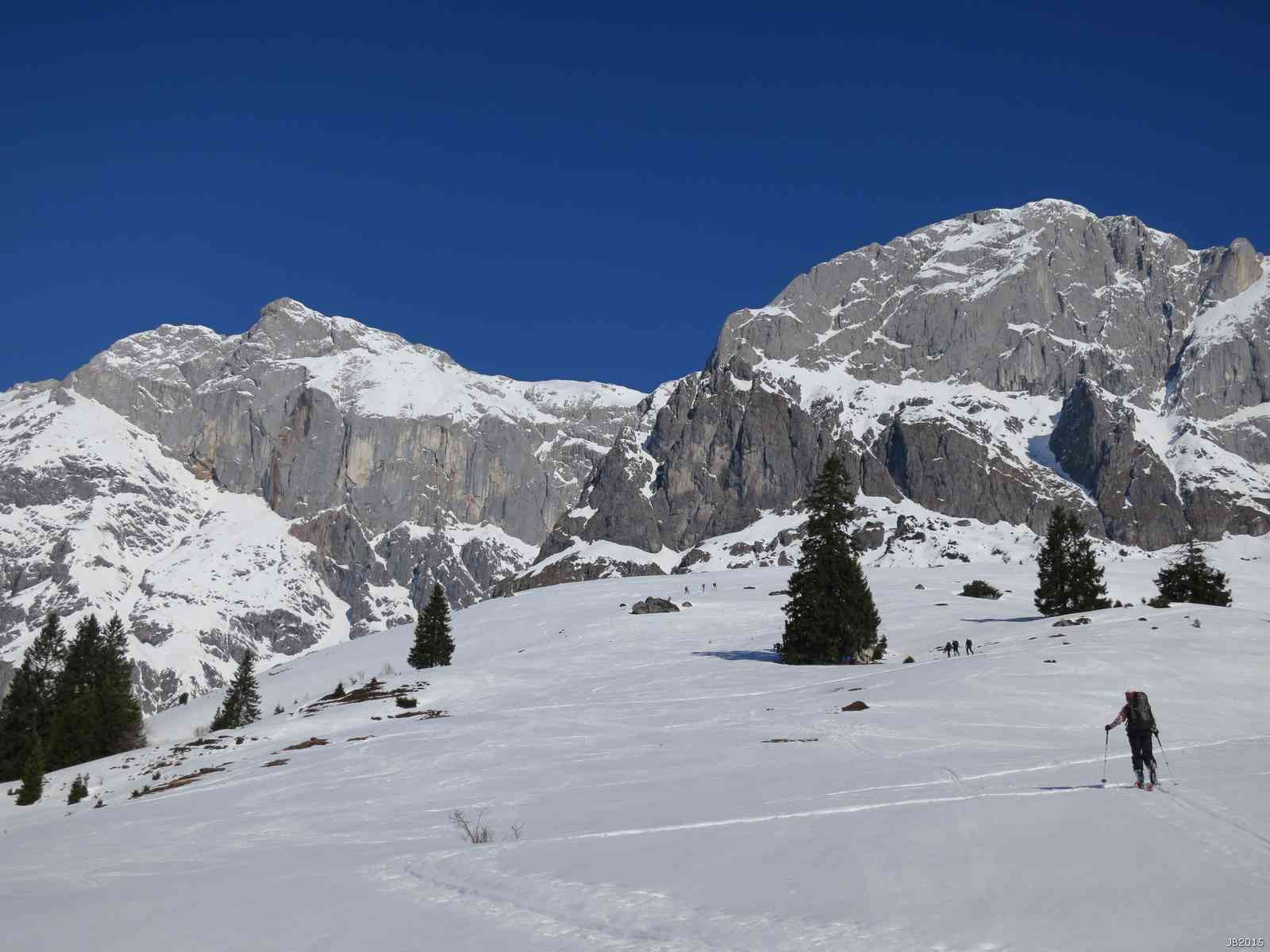 dann durch ein kleines Tal mit lichtem Wald auf guter Spur zu den weiten Almhängen, die zu den Abbrüchen des Bratschenkopfs hinaufziehen.