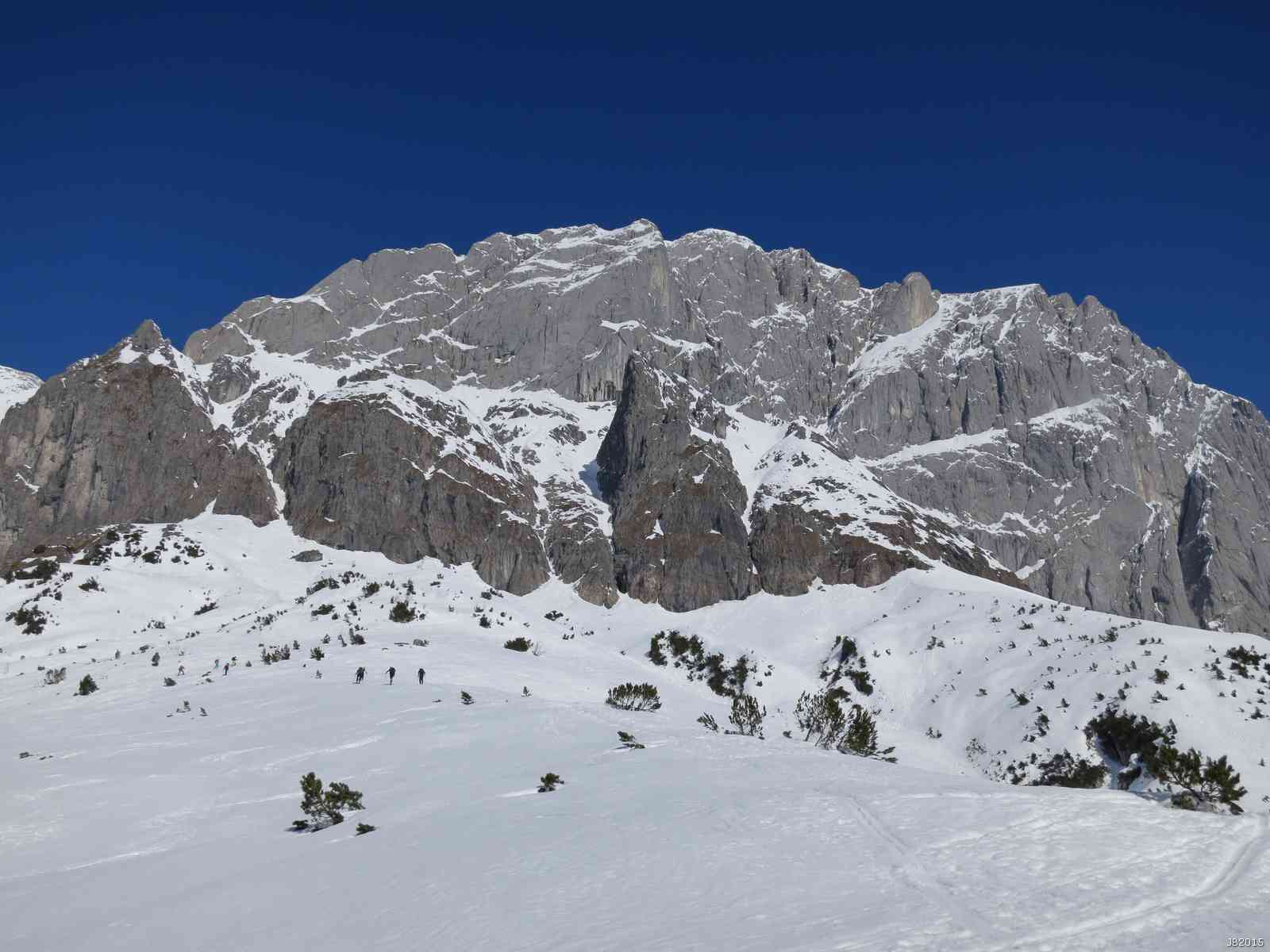 Diese kurze Skitour mit 2 Std Anstieg führt in angenehmer Steigung über die ideal geneigten Almwiesen direkt unter die Südwand des Bratschenkopfs.
