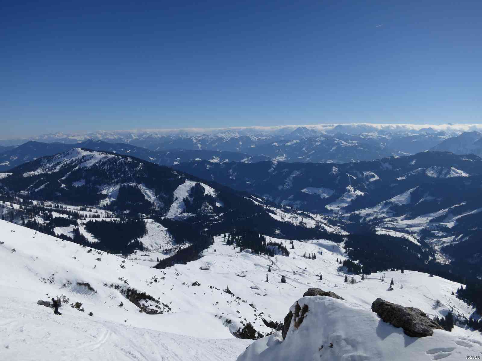 Blick nach Südwesten über das Mühlbacher Skigebiet und in die Hohen Tauern