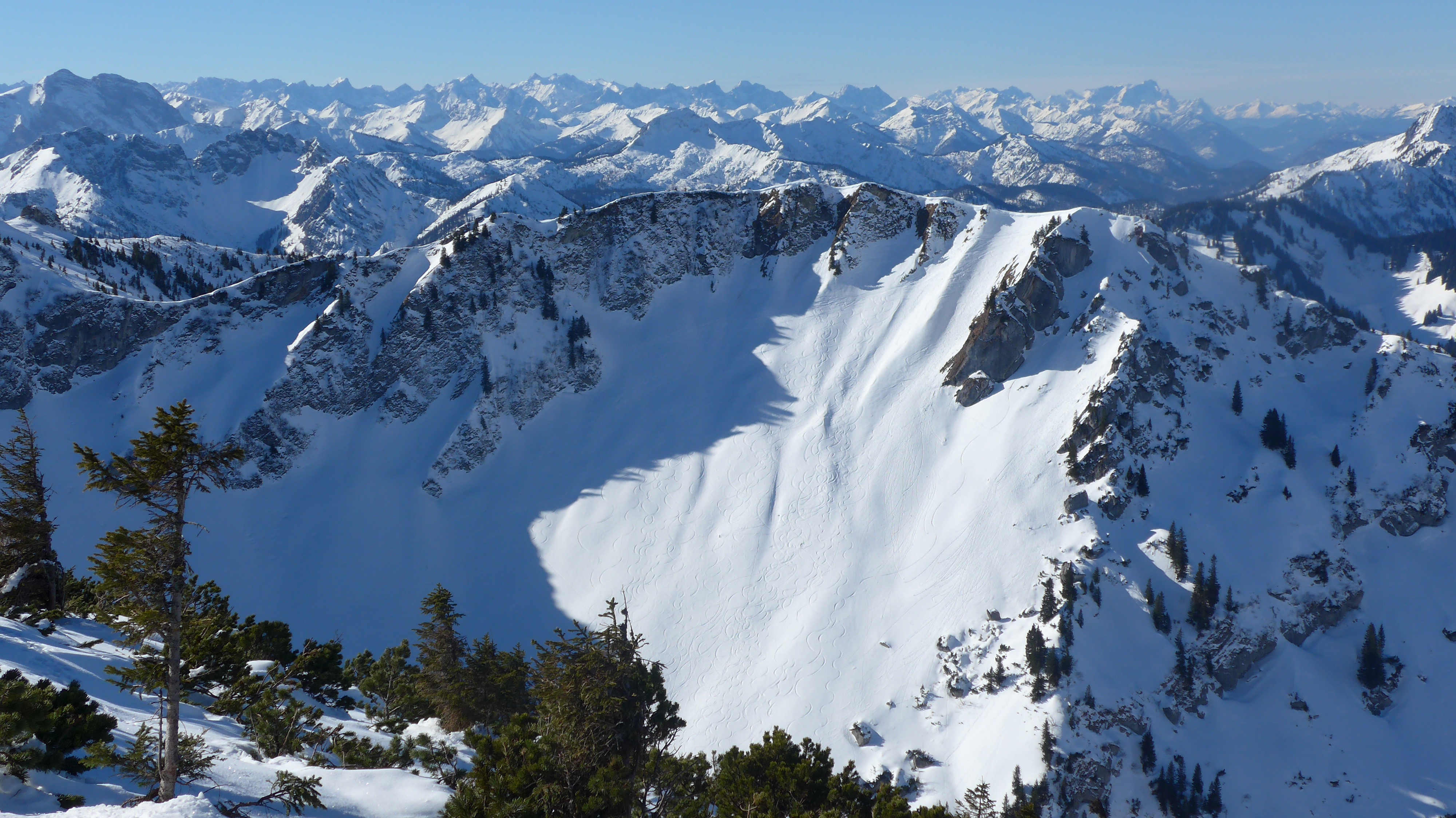 Am Hochmiesing Gipfel hat die Schneedecke bekannterweise eine 2. Etage (Einbrechen der Schneedecke am Latschenteppich).