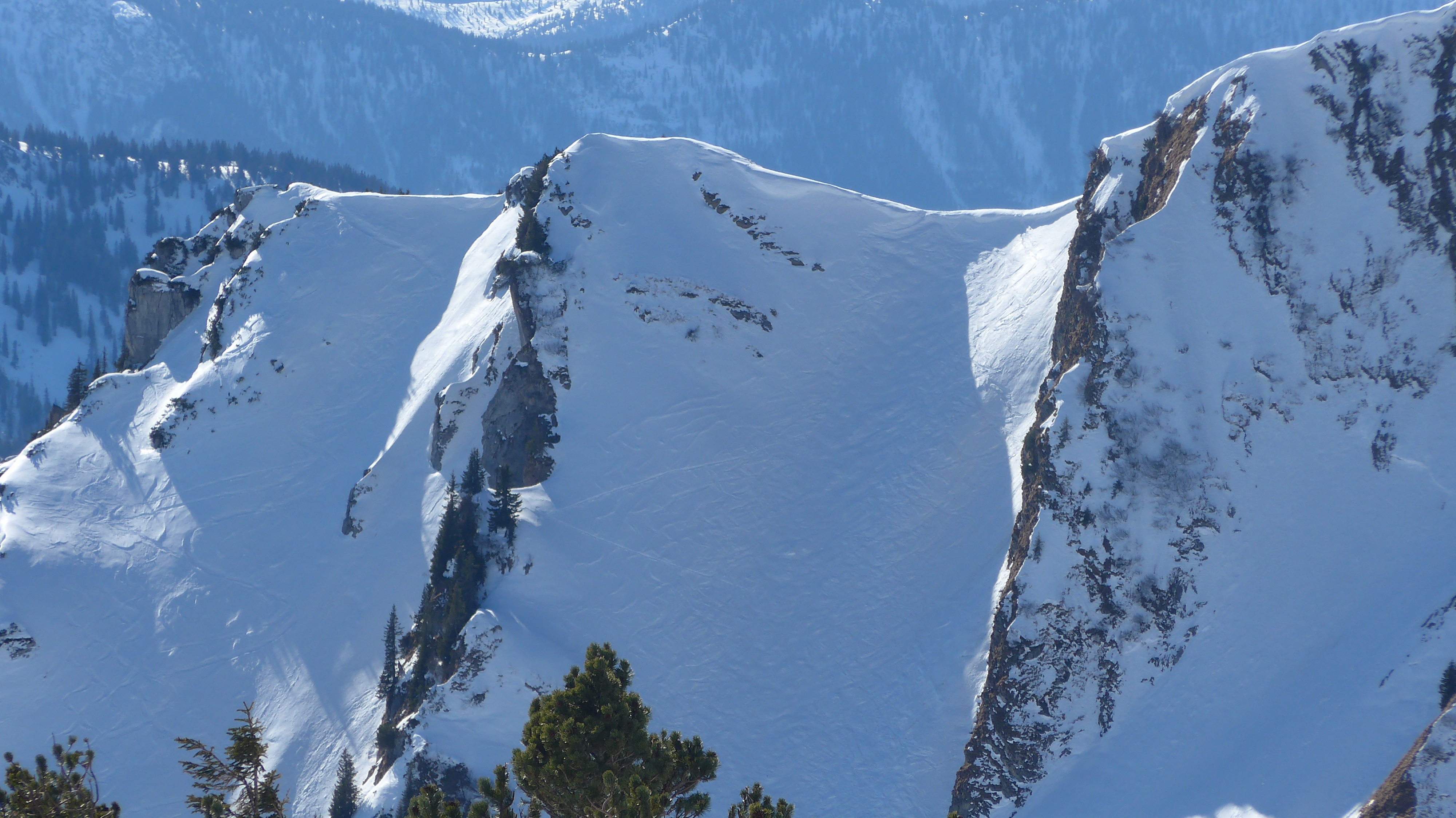 Tourenverhältnisse: Als Faschingsmuffel in die Berge getürmt. Genügend Schnee, auch im Talgrund. Weg, wie in AV-Karte eingezeichnet über die Heubergalm, am Grottenthaler Graben der Forststraße (Lawinenabgang über die Forststraße mind. 1 Tag alt) an den Kleintiefentalalmen vorbei zum Hochmiesing. Hier zeigte sich der Schnee trotz Schatten schon arg kompakt. Eigentlich Pulver erhofft. Im Schatten recht kühl, in der Sonne mild. Spur in der Sonne teils glasig. Die Harscheisen sind noch im Rucksack geblieben.