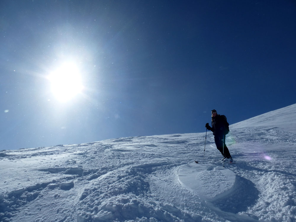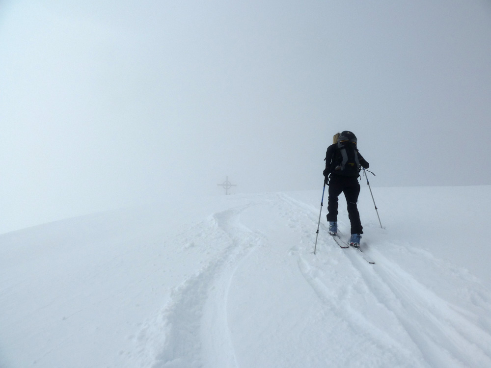 . Abfahrt bis zur Forststraße auf ca. 1.800 m und wieder anfellen zur Rötenspitze. Dort waren gestern außer uns nur 4 Leute unterwegs. die letzen 100HM lohnen nicht, ab dem Grat komplett verblasen.