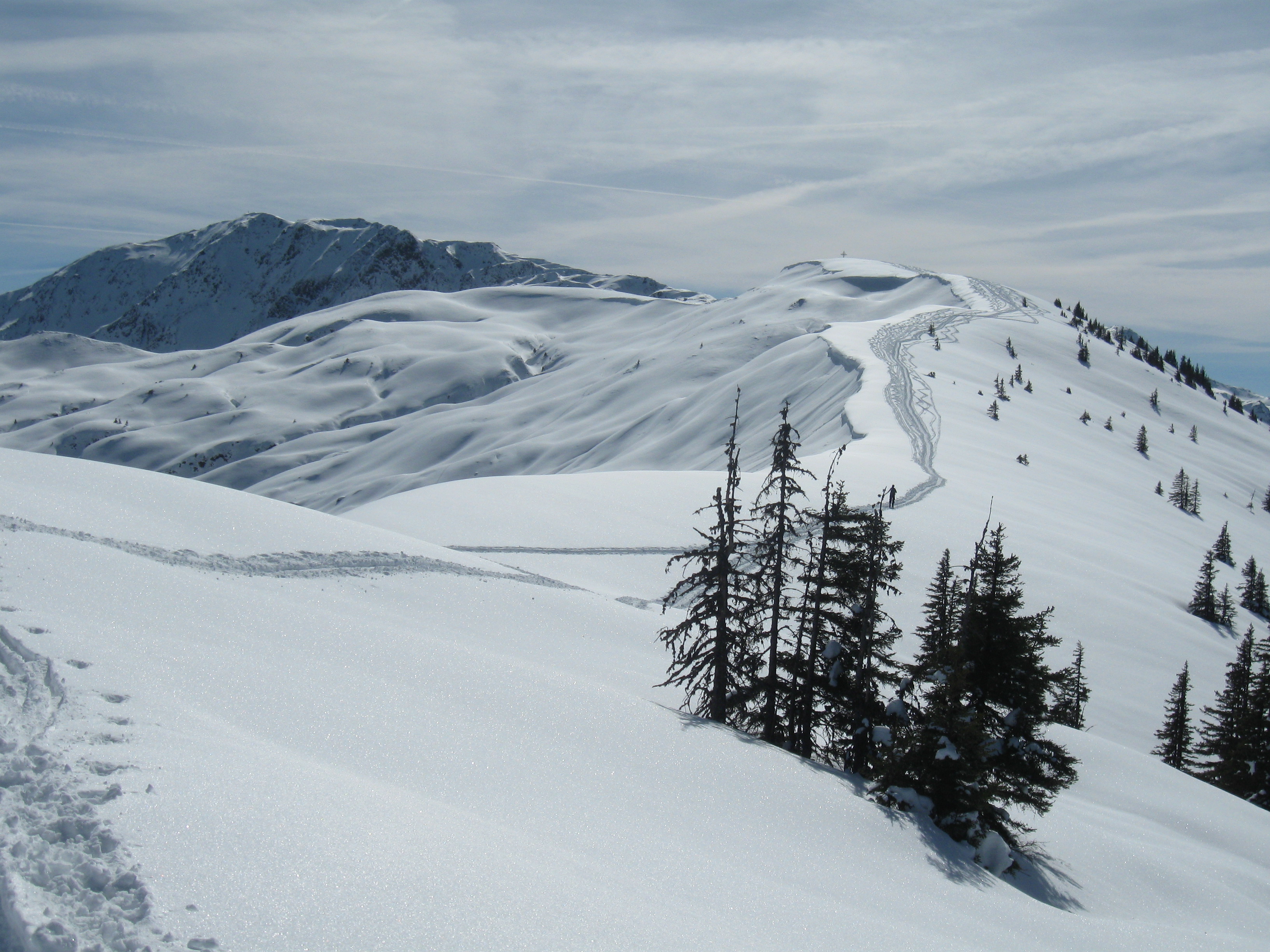 Sonstiges: Vom (kleinen) Parkplatz beim Jagerhäusl über die Scharlingtalalm zum Hartkaserjoch und weiter über den Rücken bis zum Gipfel. Abfahrt vom Gipfel nach Nordosten wie auf der AV-Karte eingezeichnet. Bis ca. 1600m noch guter Pulver, dann zunehmend schwerer, aber noch gut fahrbarer Schnee bis ca. 1300m. Dort sind wir dann in den Wald "geraten" und mussten ein Stück abrutschen und einen Graben zu Fuß durchqueren, ehe wir wieder auf Hänge kamen, die auch noch brauchbaren Schnee aufwiesen. Ab ca. 1050m auf der Forststraße mit Ski bis zum Parkplatz. Wolkenlos, warm, wenig Leute.