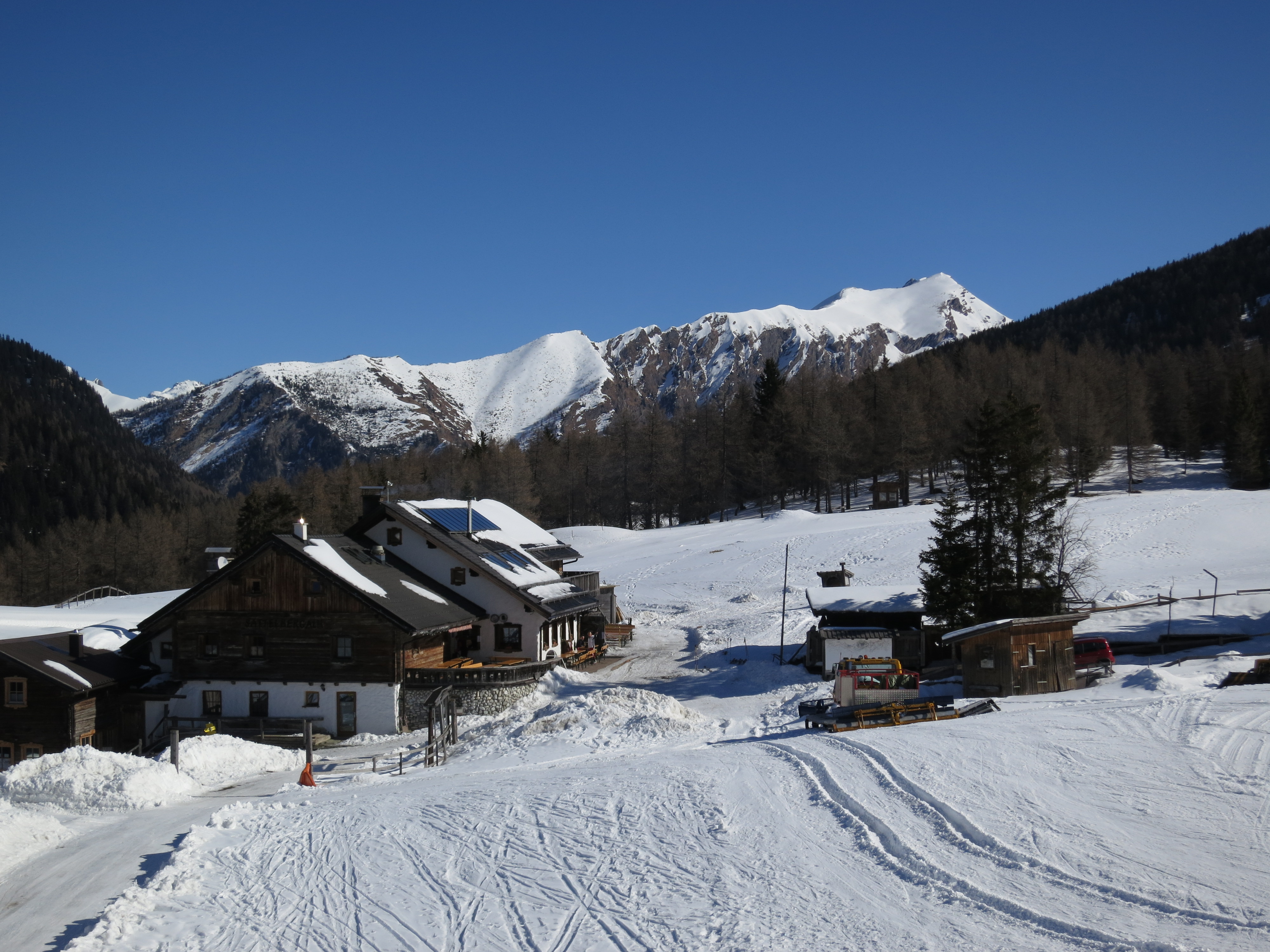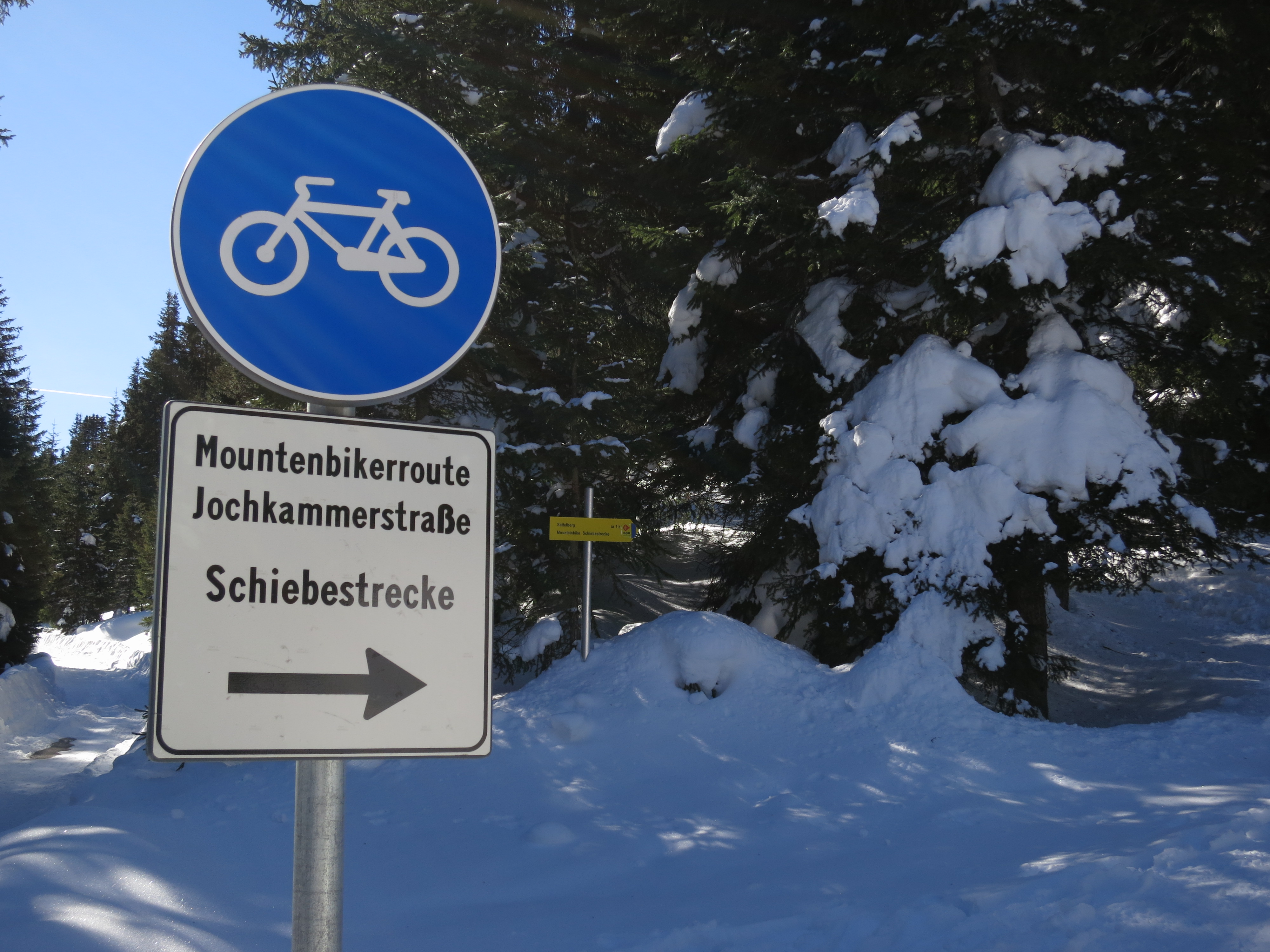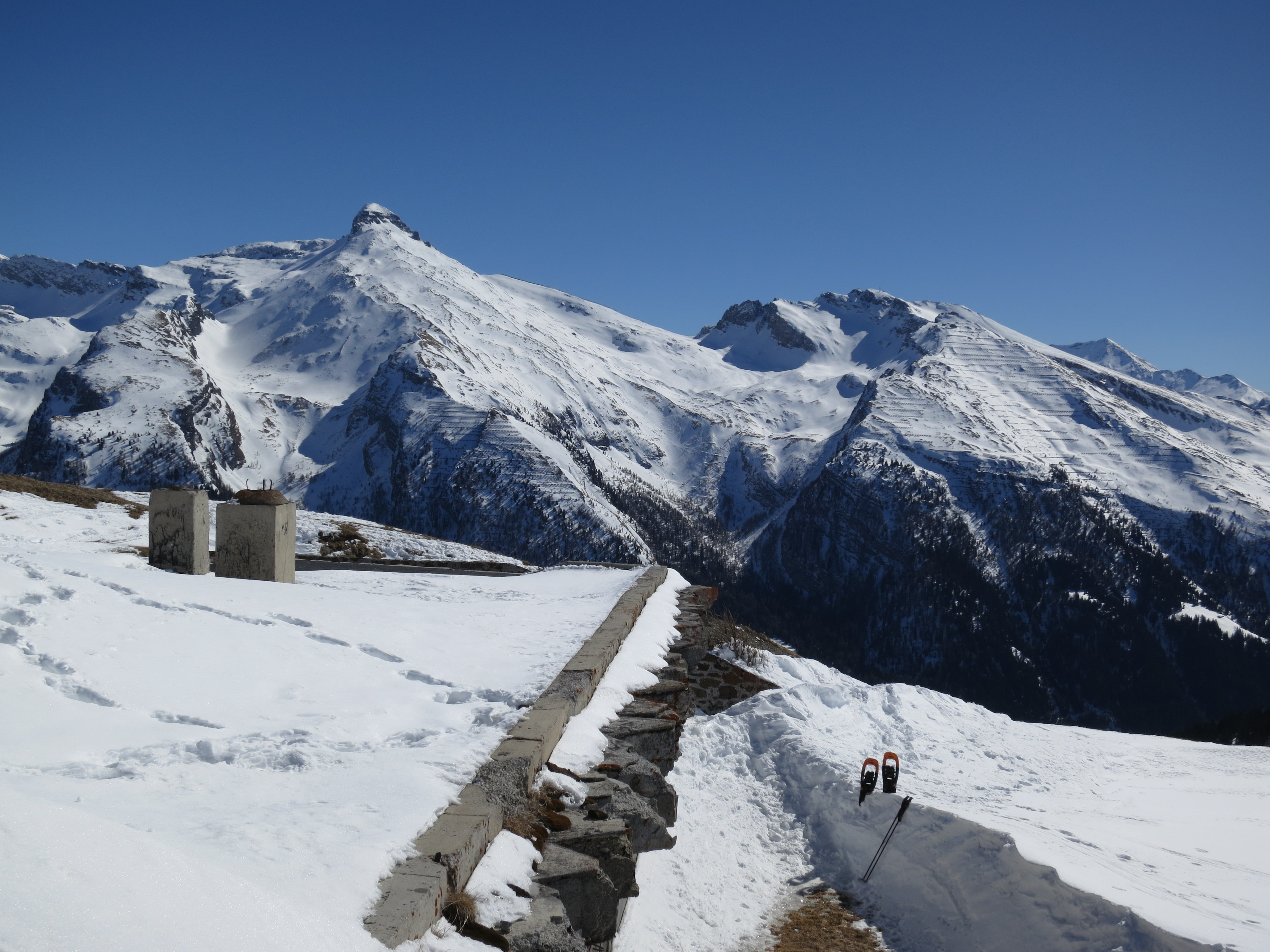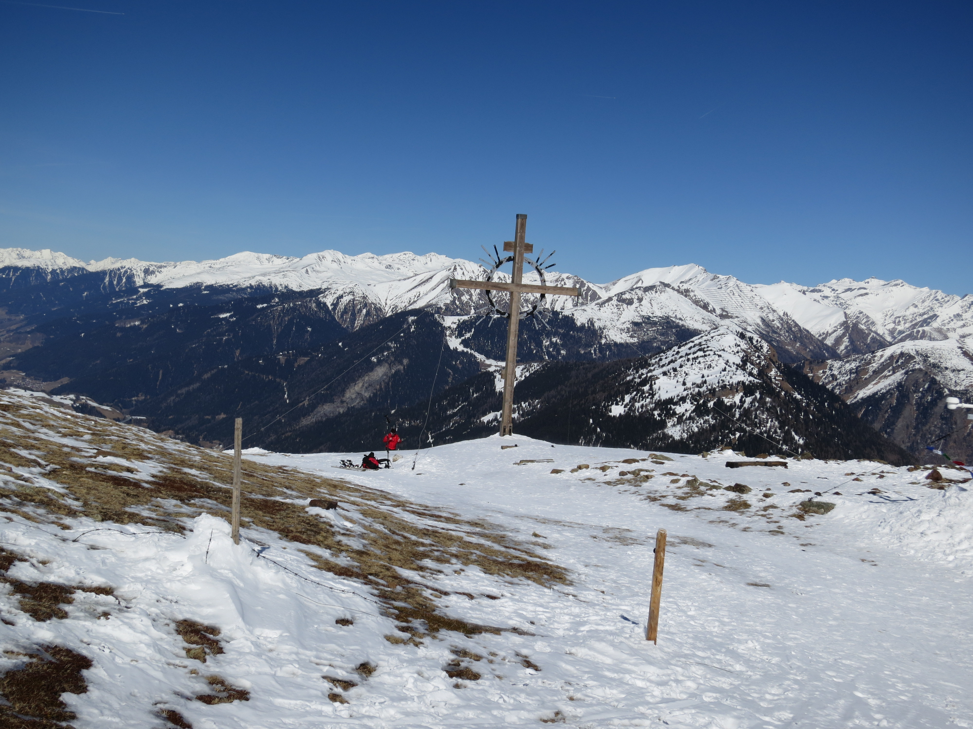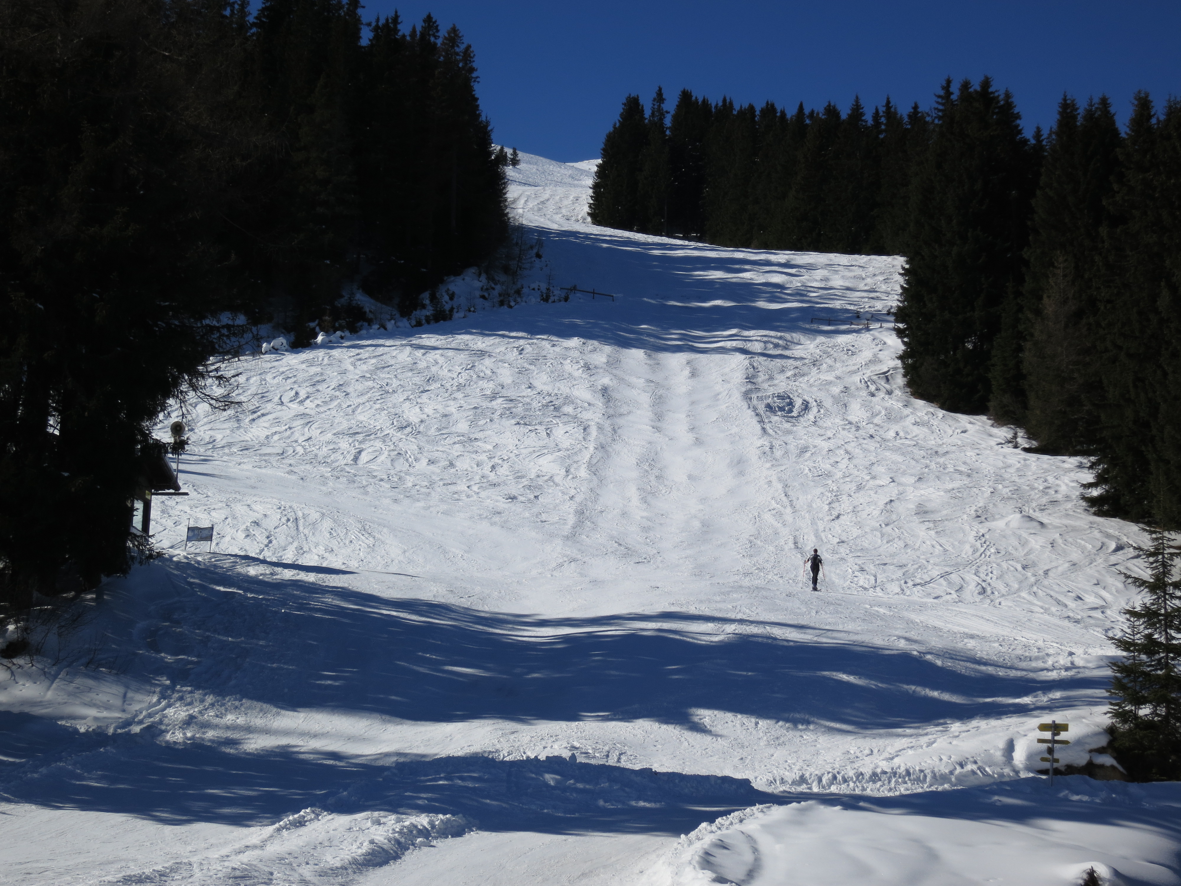 Tourenverhältnisse: Aufstieg auf der (ehemaligen) Piste (Bild 1) bis zur Sattelbergalm (Bild 2). Von der Sattelbergalm dann auf einem Ziehweg ein Stück Richtung Süden, bis man an dem Sattelberg-Wegweiser/Mountainbike-Schild (Bild 4) nach rechts abbiegt. Weiter auf guter Spur bis knapp unterhalb des Gipfels auf der Südseite. Heute war's zwar wolkenlos, aber am Gipfel doch etwas windig. Im Schutz einer Kriegsstellung auf Südtiroler Seite (Bild 6) war eine angenehme "Gipfelrast" möglich. Abfahrt dann auf der NO-Seite in zammgfahrnen Pulver auf fester Unterlage (keine Steine), ab Sattelbergalm (geöffnet) dann meist firnig, nur kurze harschige Stellen. Abfahrt also insgesamt wie auf einer guten Piste.