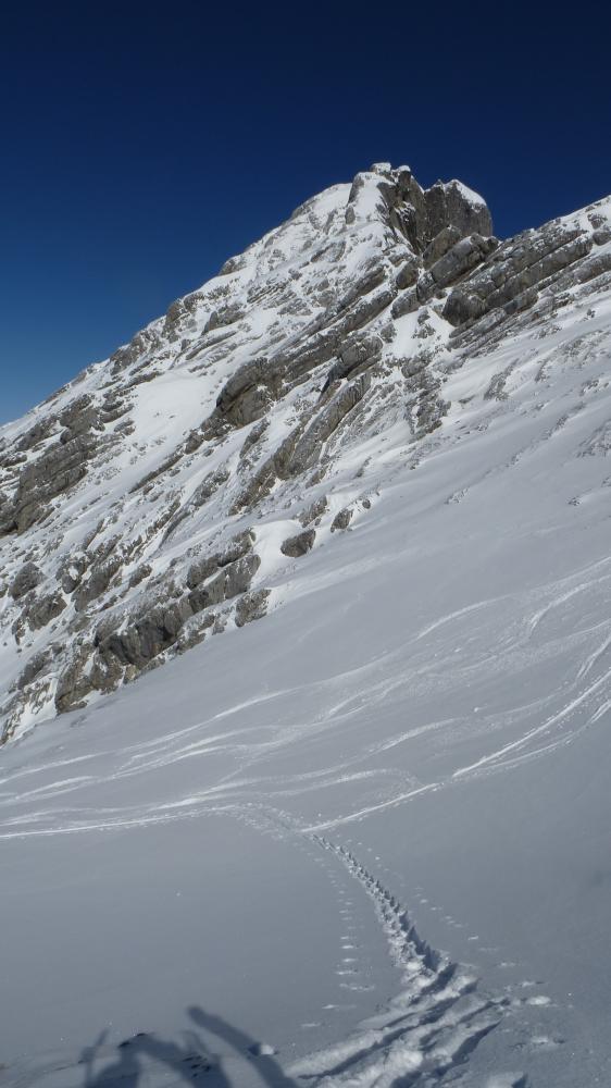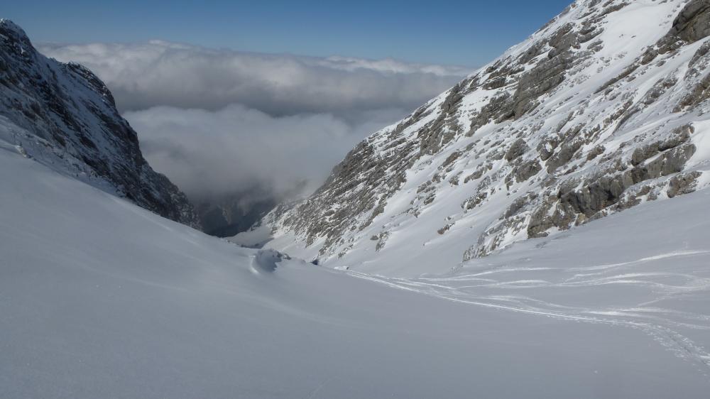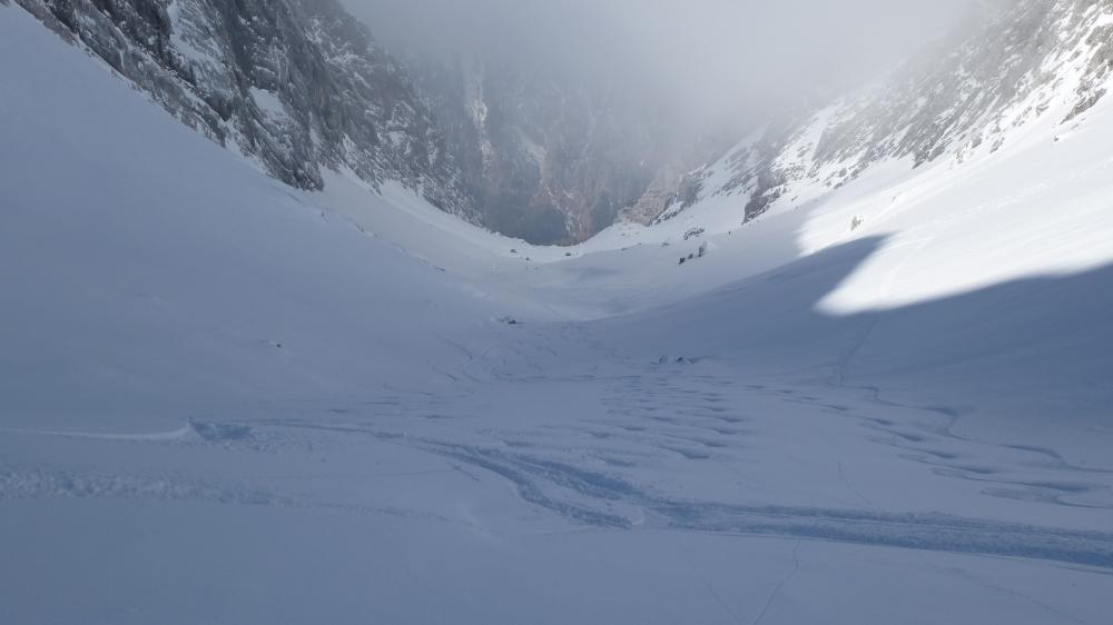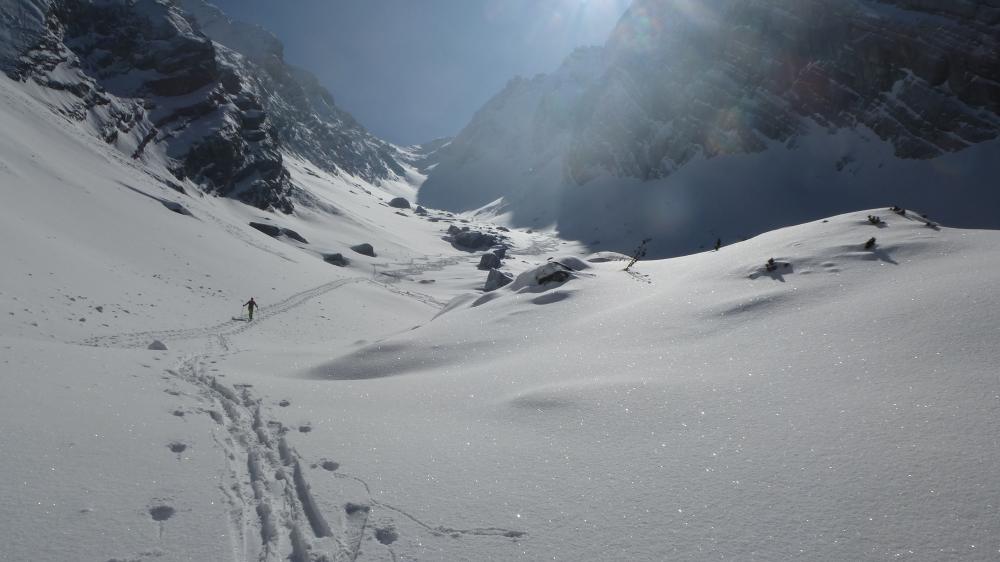 Tourenverhältnisse: Forstrasse ins Ofental fast komplett zu fahren, nur 3 mal kurz abschnallen; im Kar 10 cm frischer Pulver, fast unverspurt, trotzdem ein bisschen auf Steine achten.