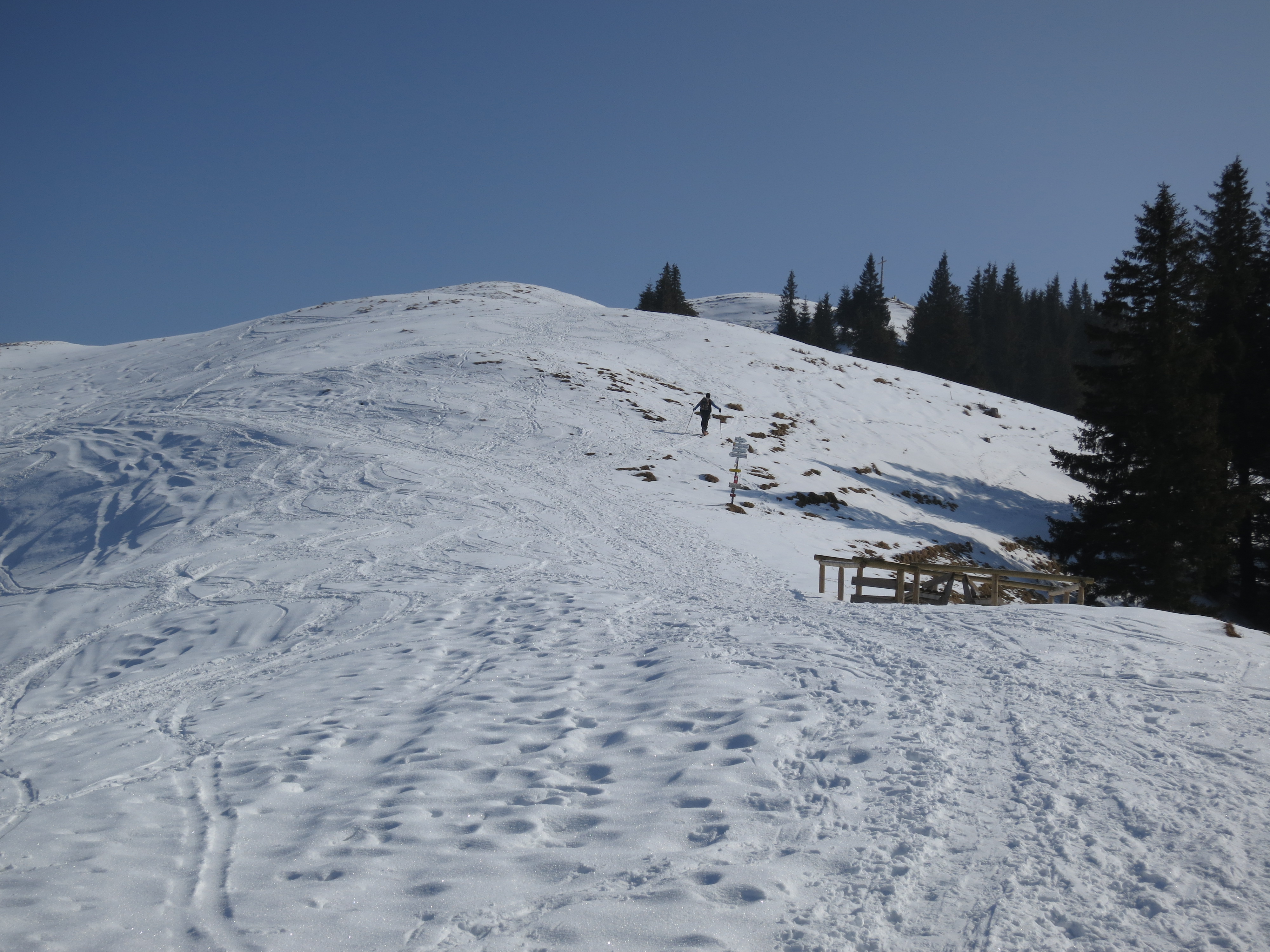 Tourenverhältnisse: Die Abfahrt vom Hinteren Hörnle war vom Gipfel weg möglich (dünne pulvrige Schneeauflage auf festem Untergrund). Die Piste ist teils in gutem Zustand, teils aber auch schon abgeschabt. Insgesamt aber noch brauchbare Verhältnisse.