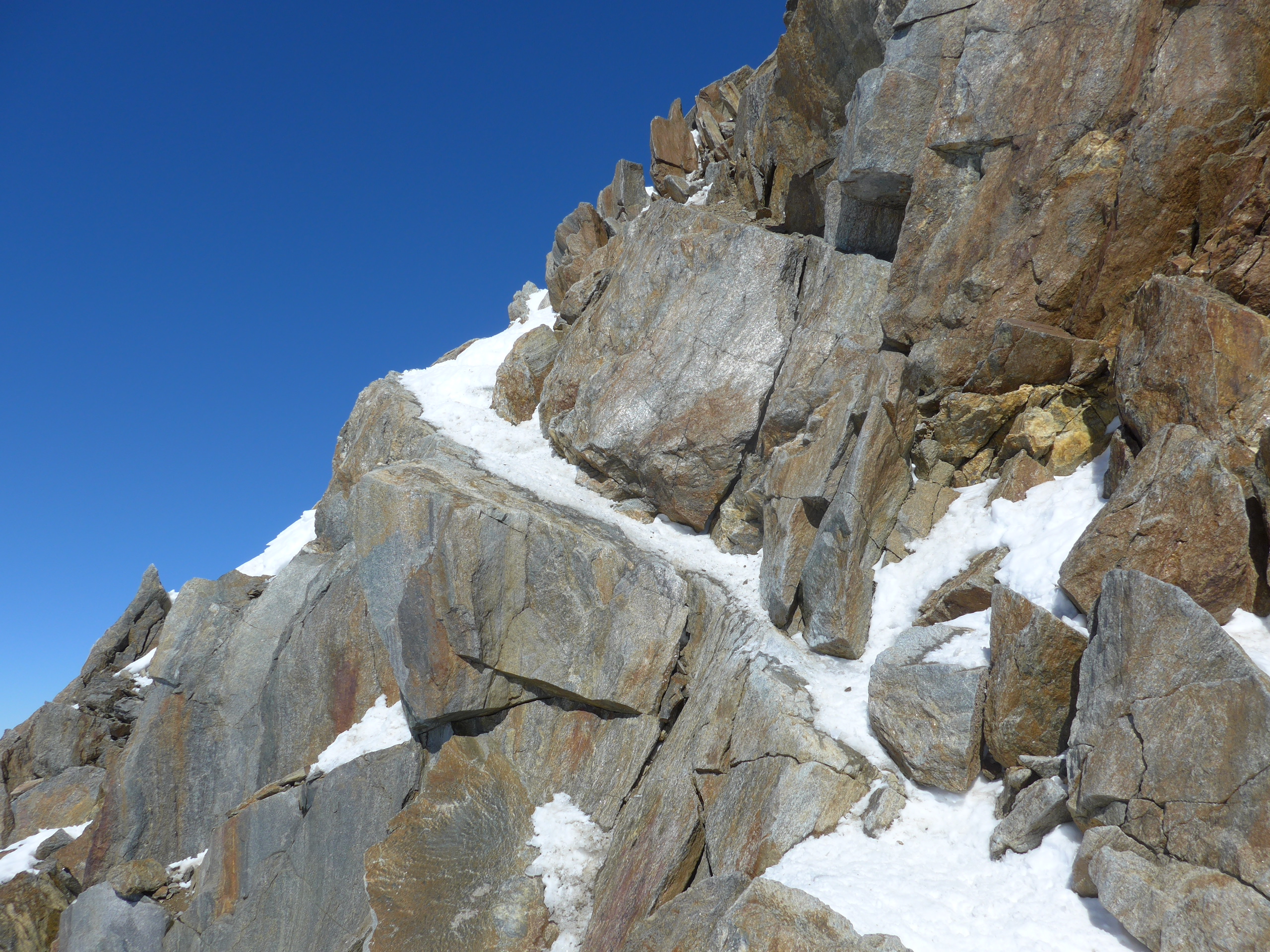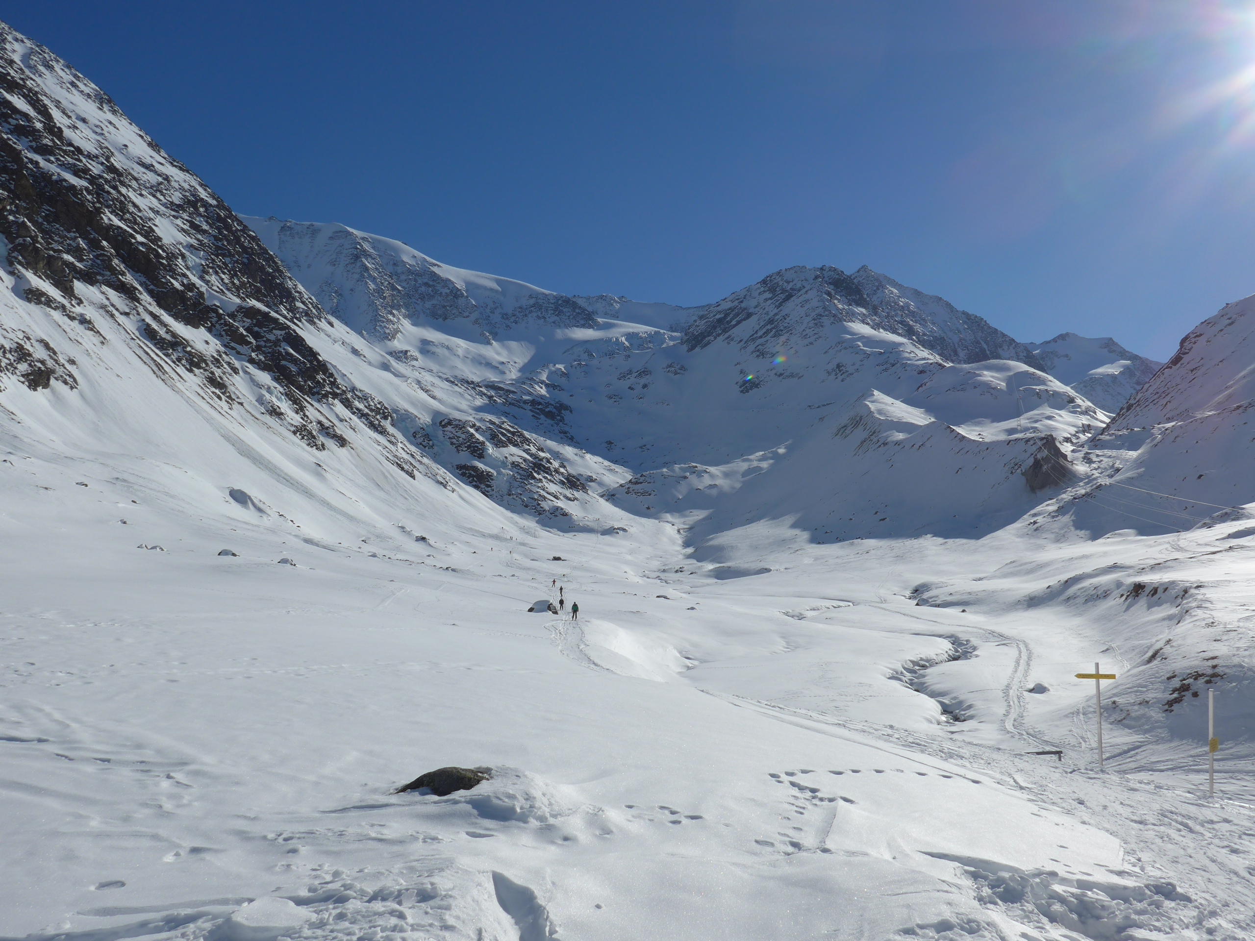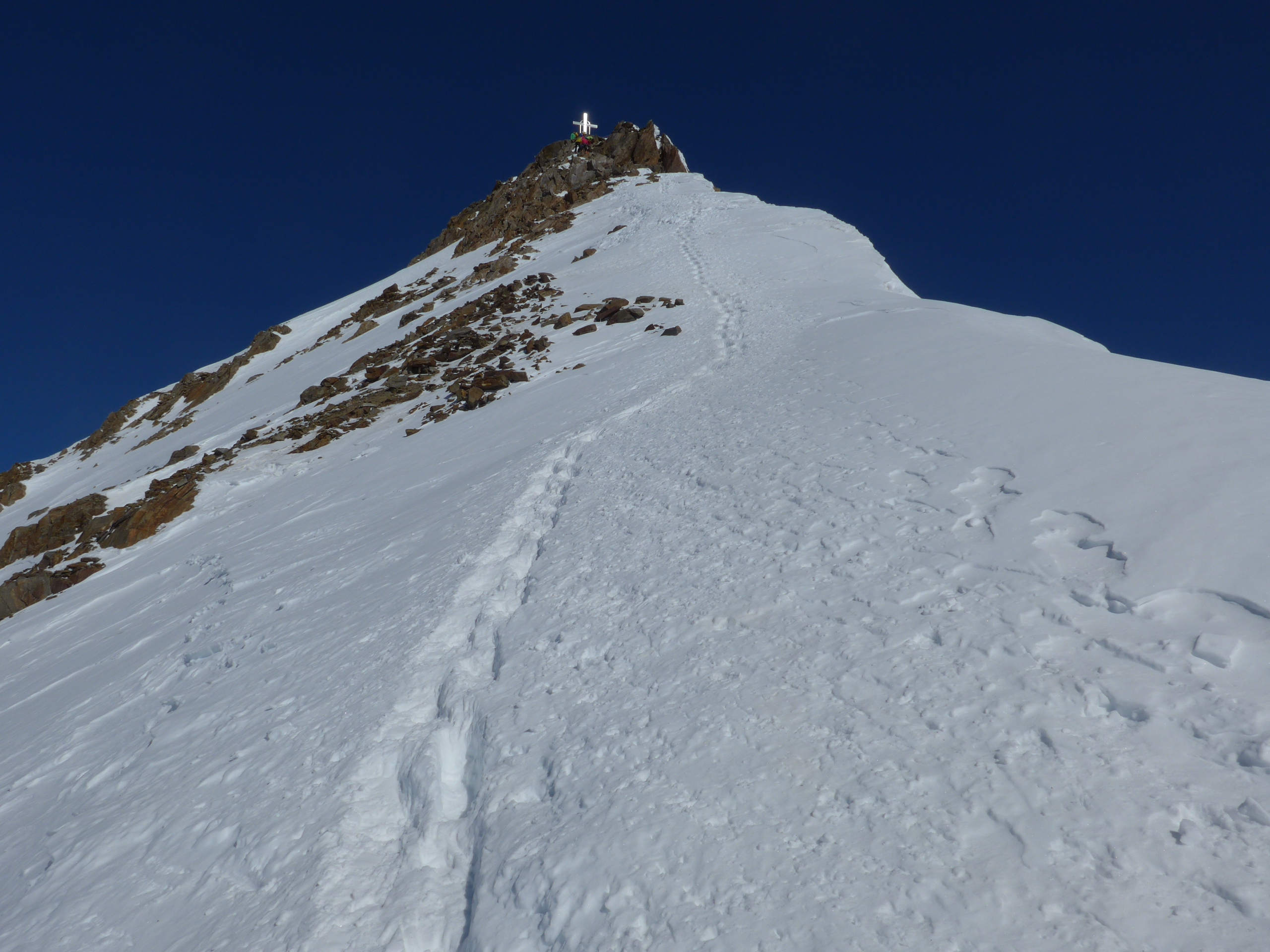 Tourenverhältnisse: Abfahrt zum Mittelbergjoch 3.166m, dann ca. 70 hm Abfahrt zum Taschachferner zum Auffellen. Gute Spur(en) auf sehr festem, teils hartem Untergrund. Die Kälte mit ca. -5° bis -10° war wegen der intensiven Sonnenbestrahlung und beinahe Windstille kaum spürbar. Die Spalten sind alle gut zugeschneit und die Brücken fest, ca. 50cm Schneeauflage (lt. Liftstation) am unteren Taschachferner. Beim Steilhang nach dem Mitterkarjoch sind Harscheisen angenehm. Ab dem Skidepot am Sattel vor dem Grat geht es mit Steigeisen und Pickel gut gangbar in großen, hart gefrorenen Trittstufen zu den Gipfelfelsen. Die kurze Kletterei ist anregend, mit guten fest gefrorenen Griffen; bei Eis heikel. Sicherung von Fall zu Fall angemessen und notwendig, v.a. beim Abstieg.