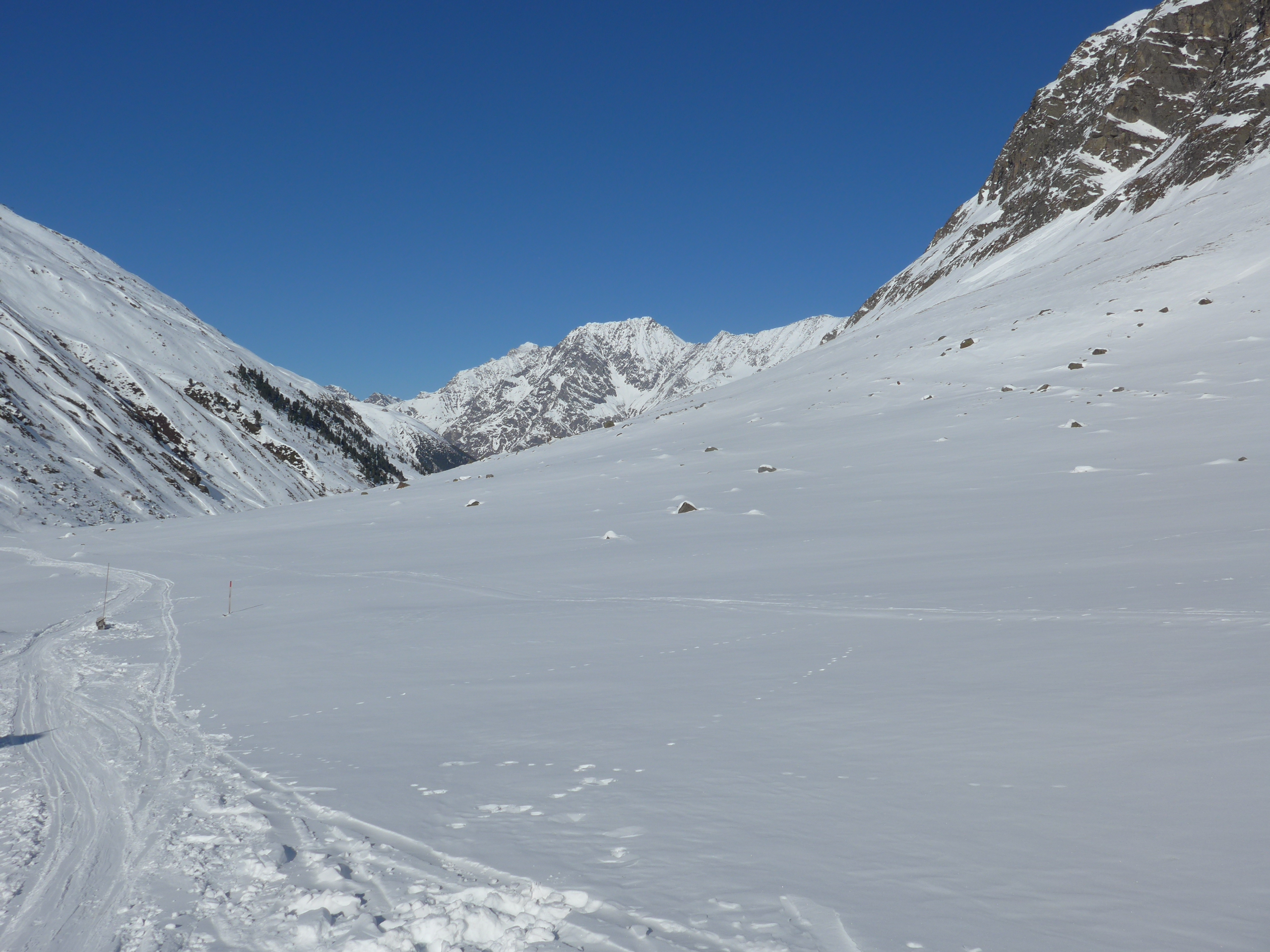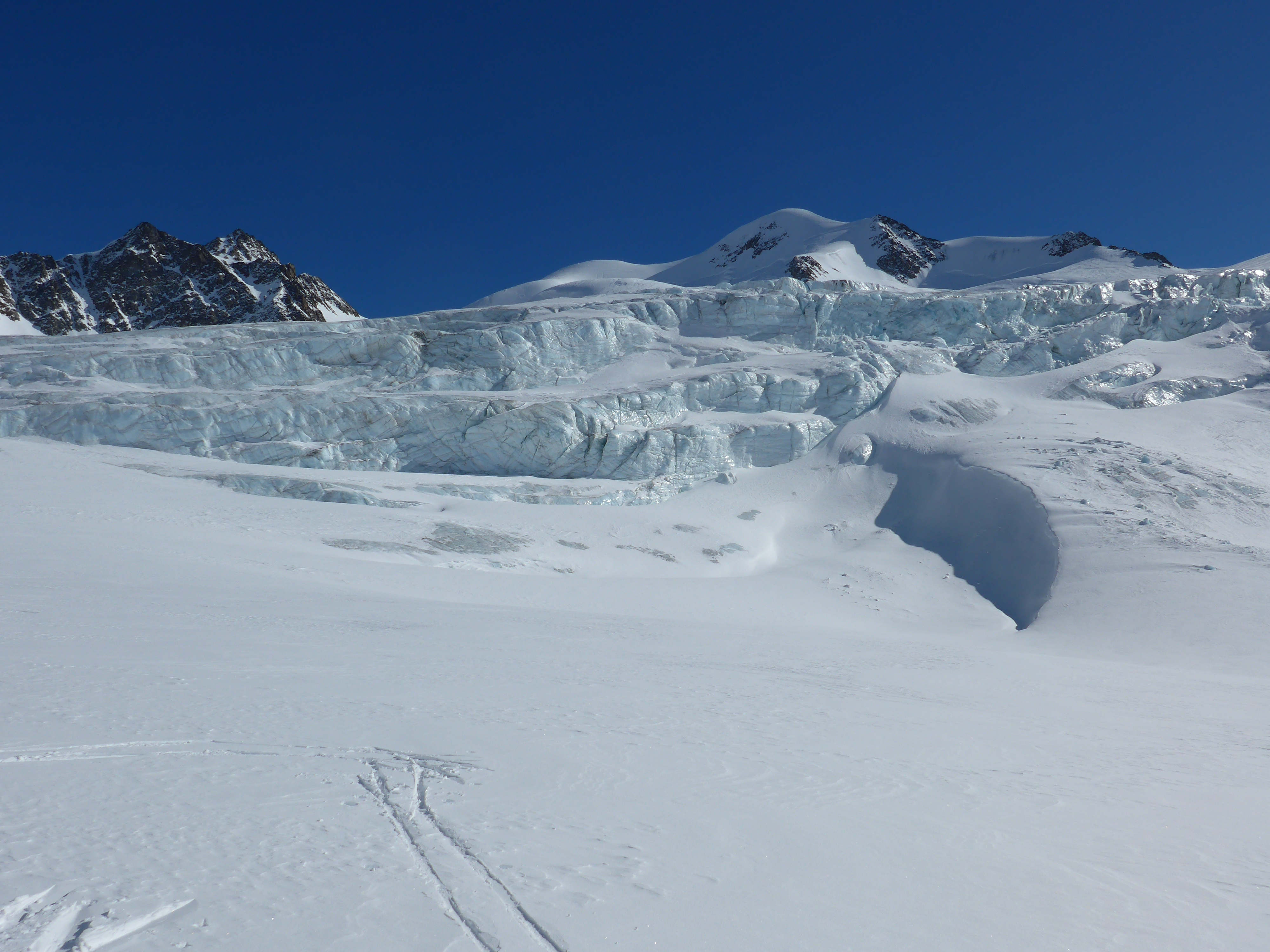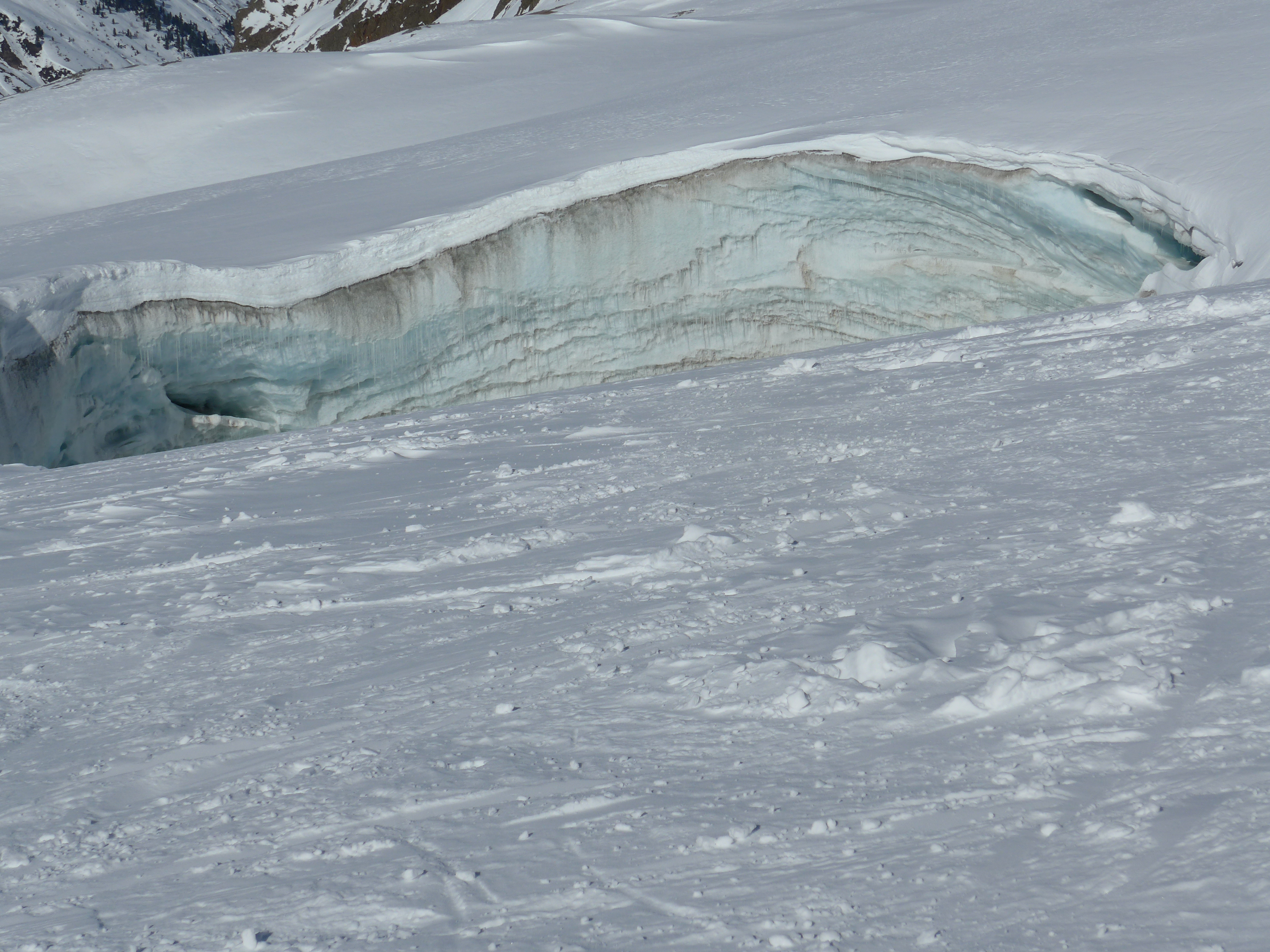 Die ab Skidepot ca. 20 km lange Abfahrt über den Taschachferner ist grandios: in gebührendem Abstand vorbei an eindrucksvollen Gletscherbrüchen und Spalten, am Ende mit einigen Schiebepassagen und kleineren Anstiegen zum Ausgangspunkt. Der Taschachferner wurde an diesem schönen Tag von vielen Freeridern und allen Tourengehern befahren, da optimale Verhältnisse herrschten.