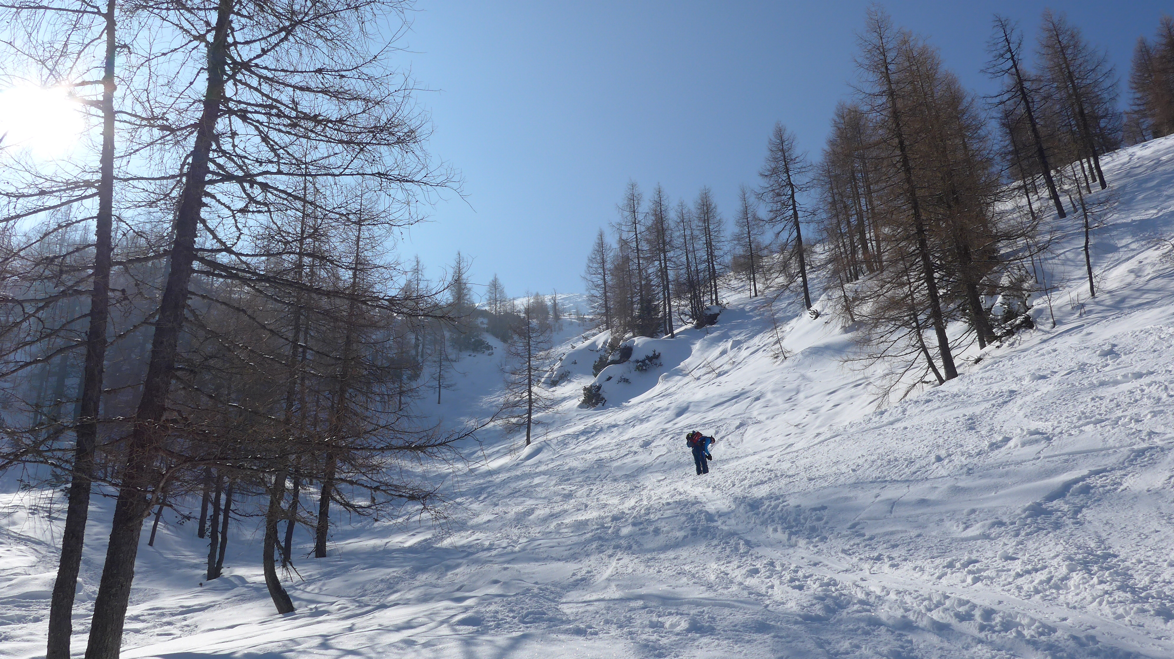 Tourenverhältnisse: Genügend Schnee vom Parkplatz weg. Obwohl nordseitig bekommt man hier reichlich Sonne im Aufstieg 8:15 Uhr ab, ohne auf den Pulverschnee verzichten zu müssen. Mild. Milchige Sicht.