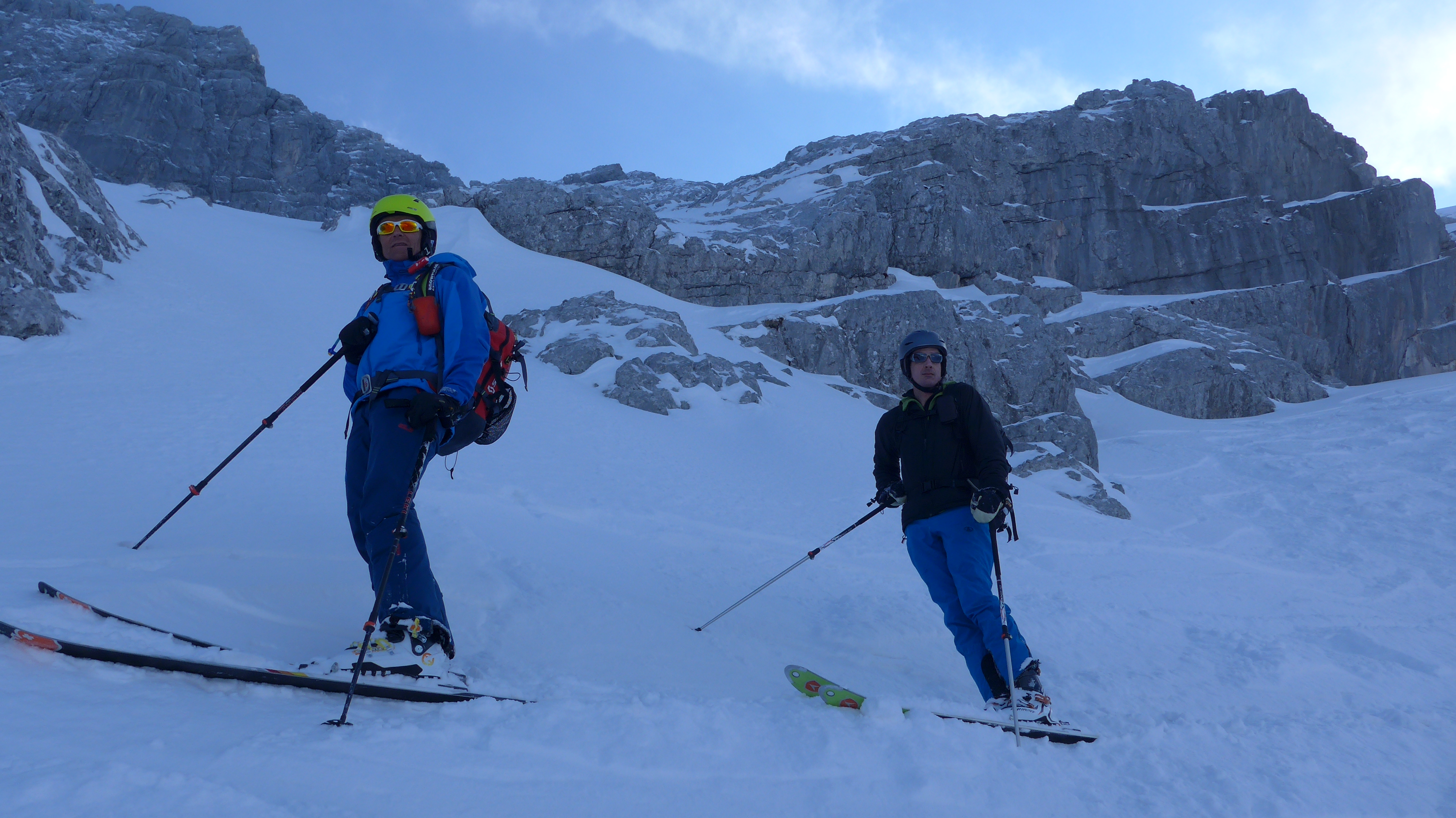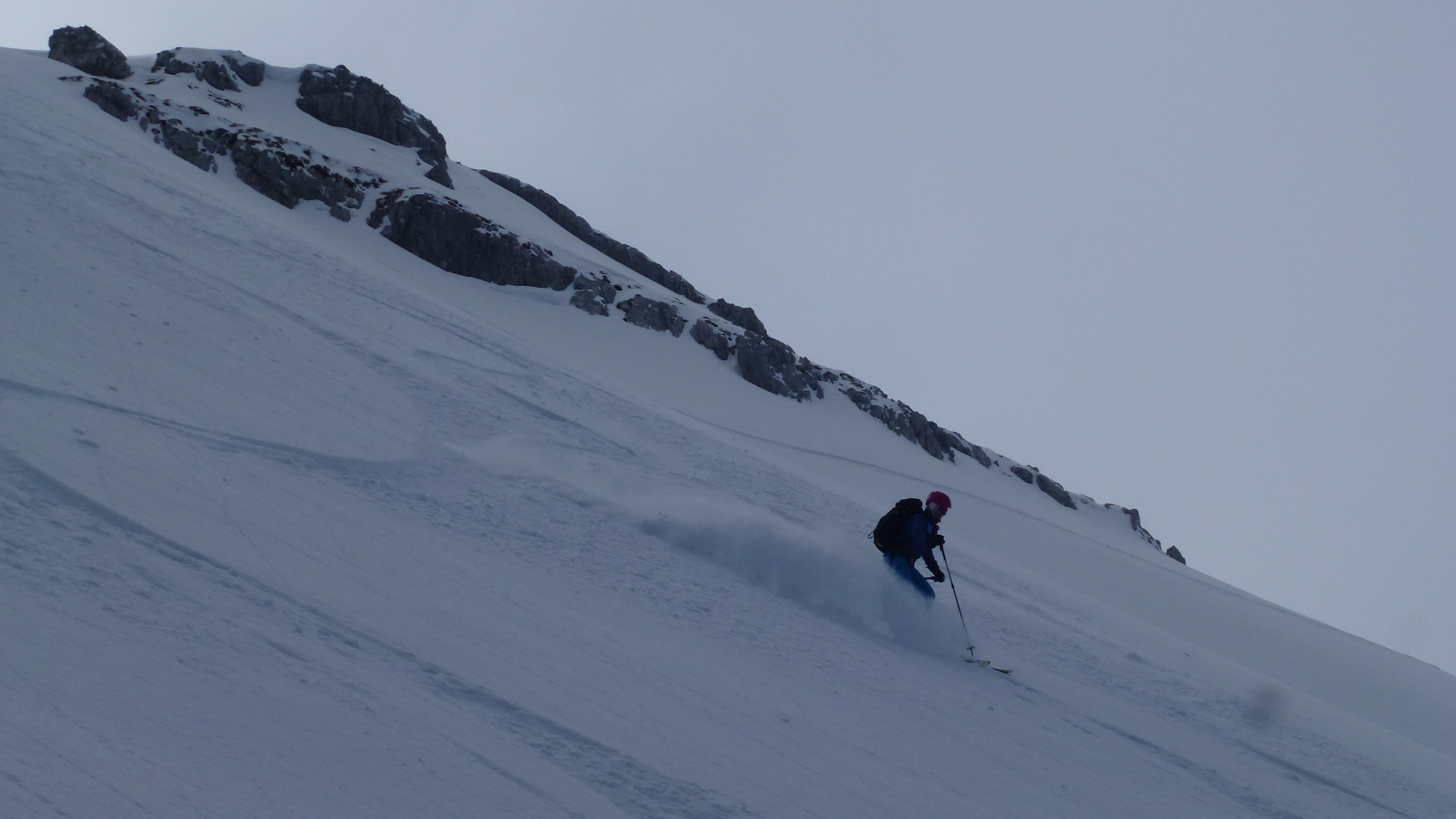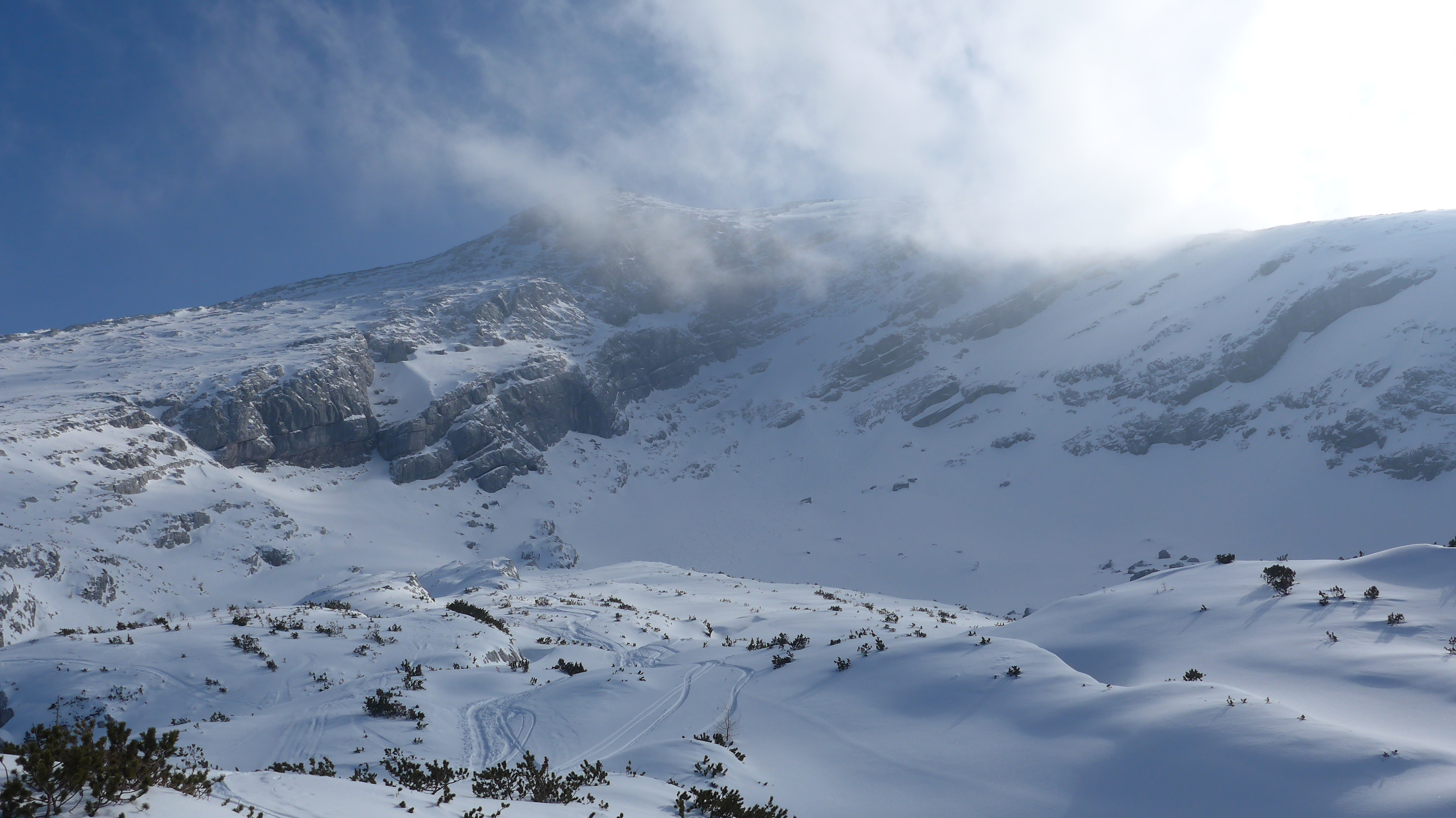 Sehr verhaltene Abfahrt ca. 100 Hm. Uns taten die Ski leid - abgeschnallt. Zu Fuß weiter (ca. 150 Hm) ging flott (Vorsicht z.T. sehr glatten Platten). Grube war wunderbar im satten Pulver zu fahren. (Vorsicht Abbrüche - rechts halten) Weitere Abfahrt vom Gugel stark eingefahren - noch schön zu fahren.