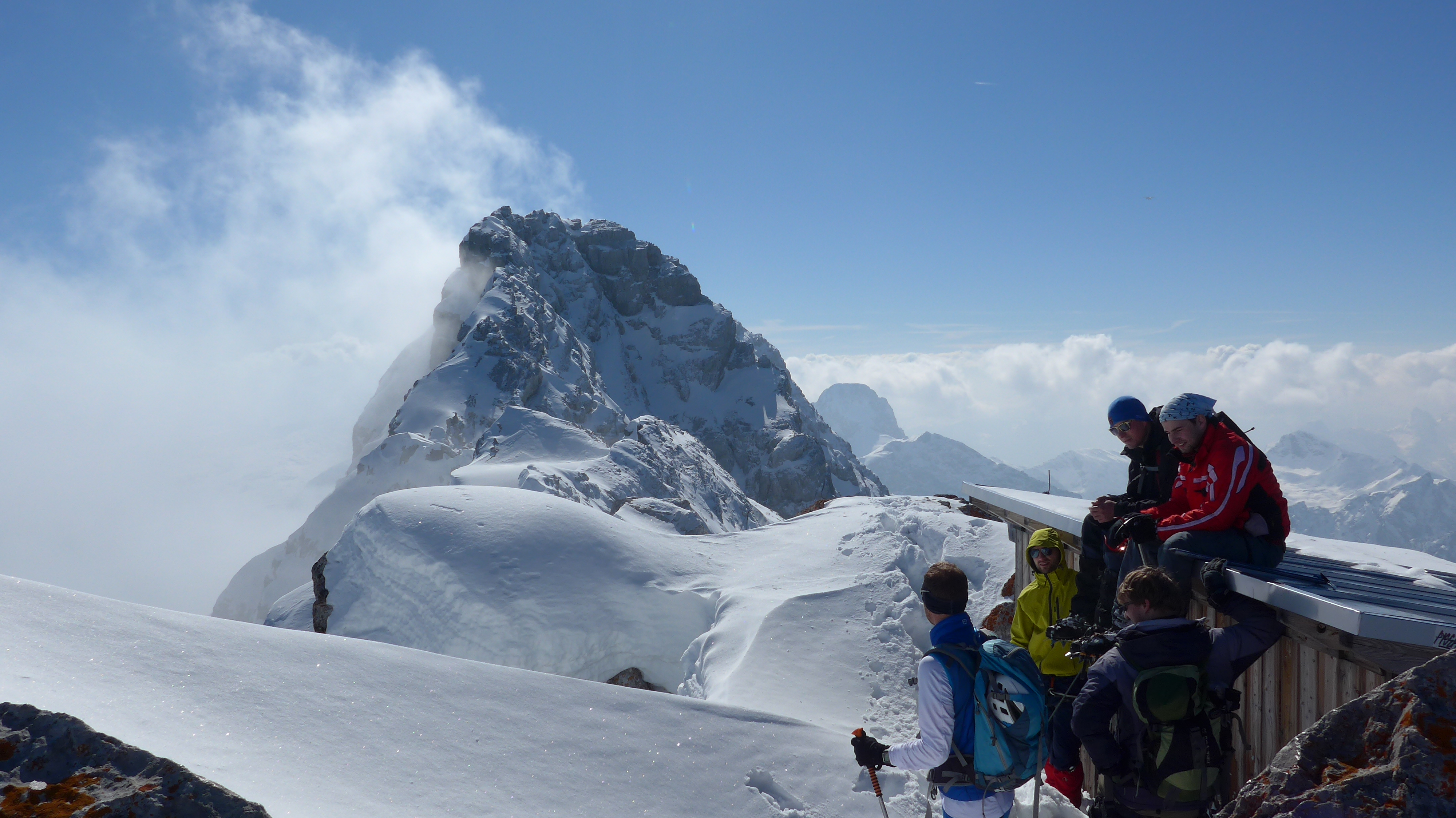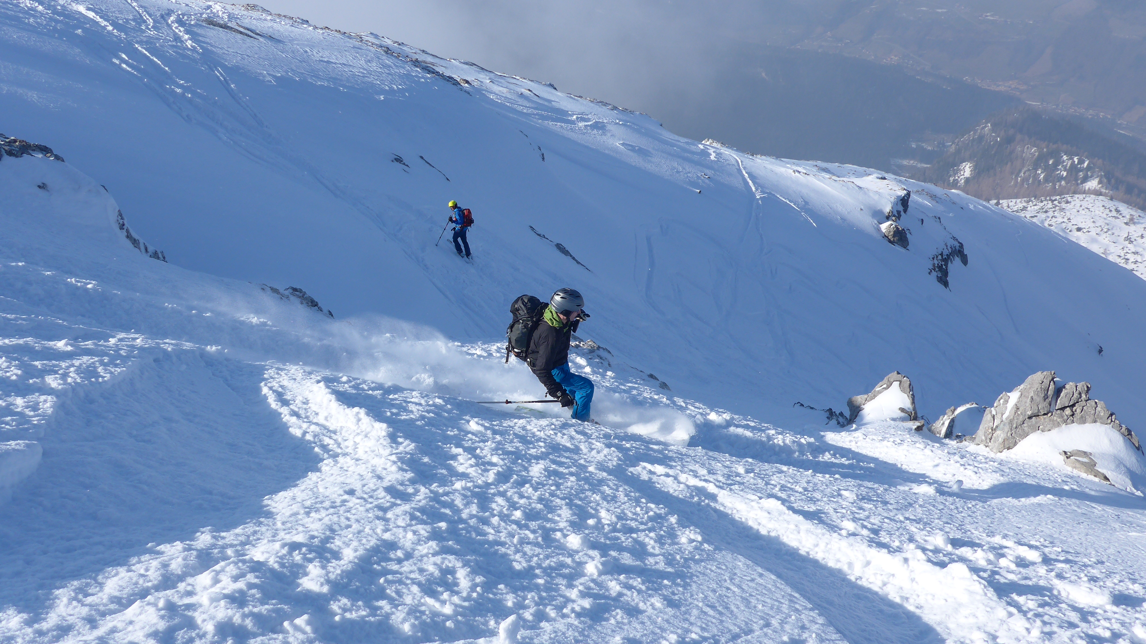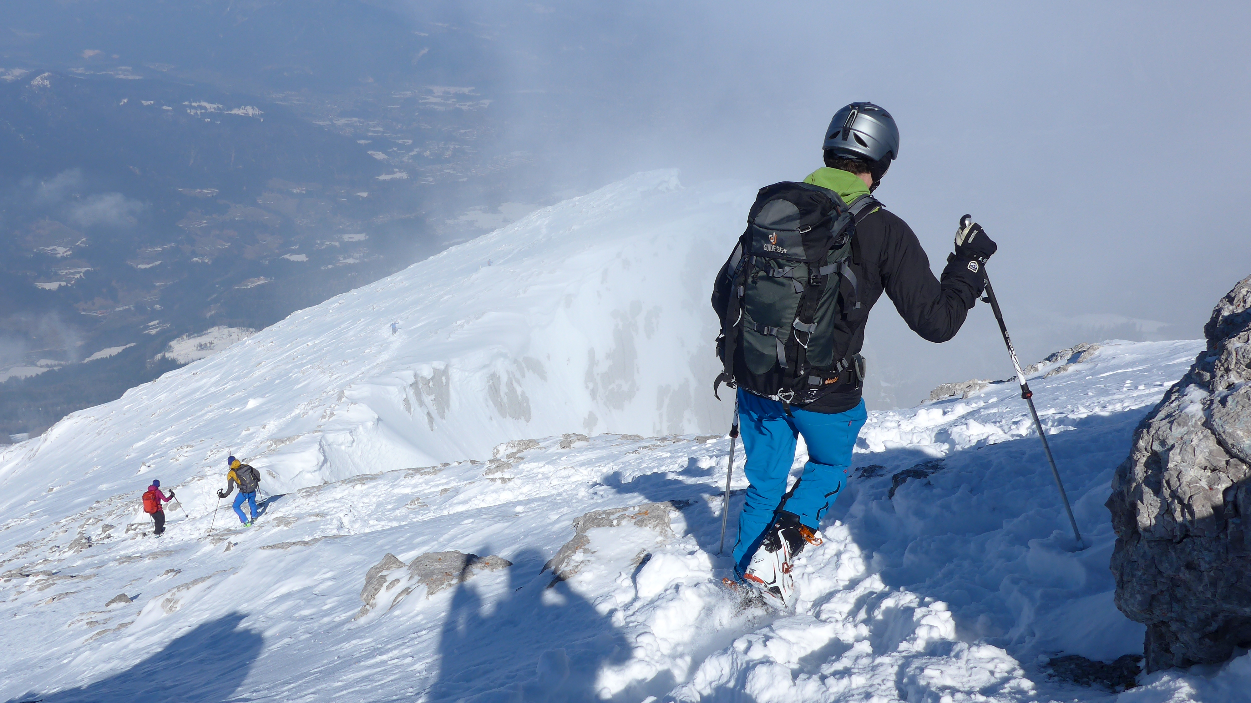 Sehr verhaltene Abfahrt ca. 100 Hm. Uns taten die Ski leid - abgeschnallt. Zu Fuß weiter (ca. 150 Hm) ging flott (Vorsicht z.T. sehr glatten Platten). Grube war wunderbar im satten Pulver zu fahren. (Vorsicht Abbrüche - rechts halten) Weitere Abfahrt vom Gugel stark eingefahren - noch schön zu fahren.